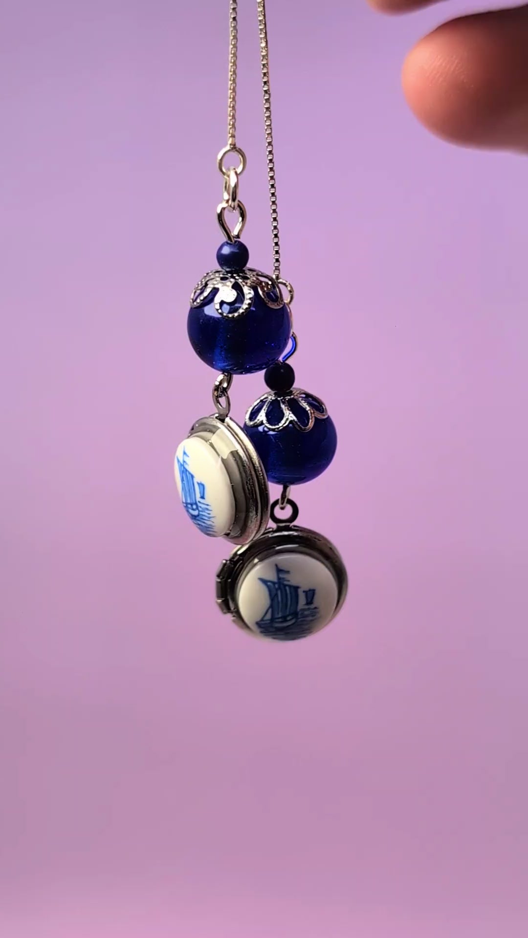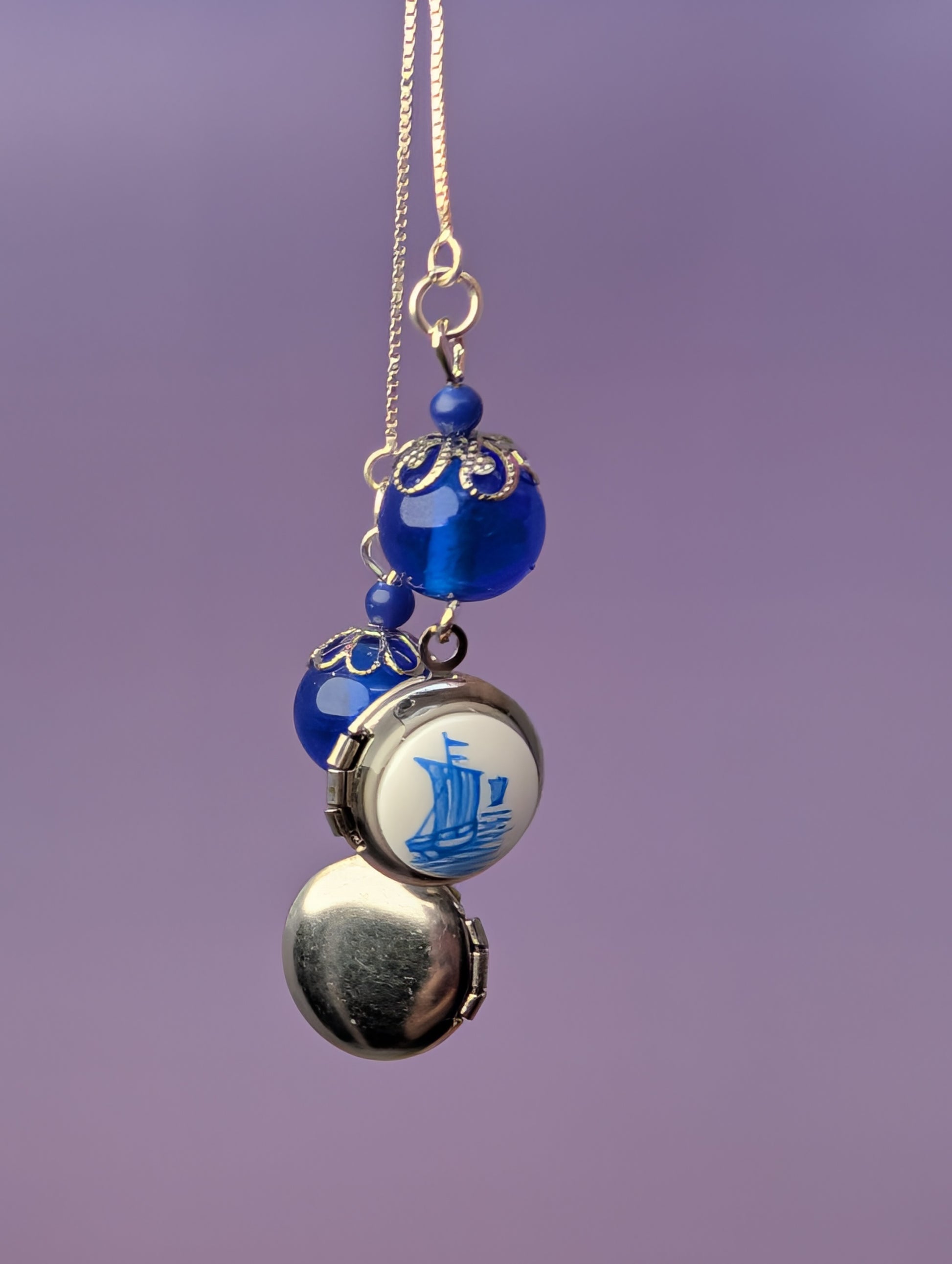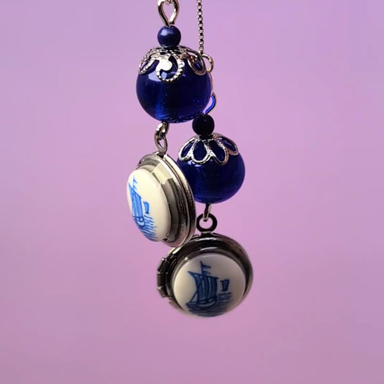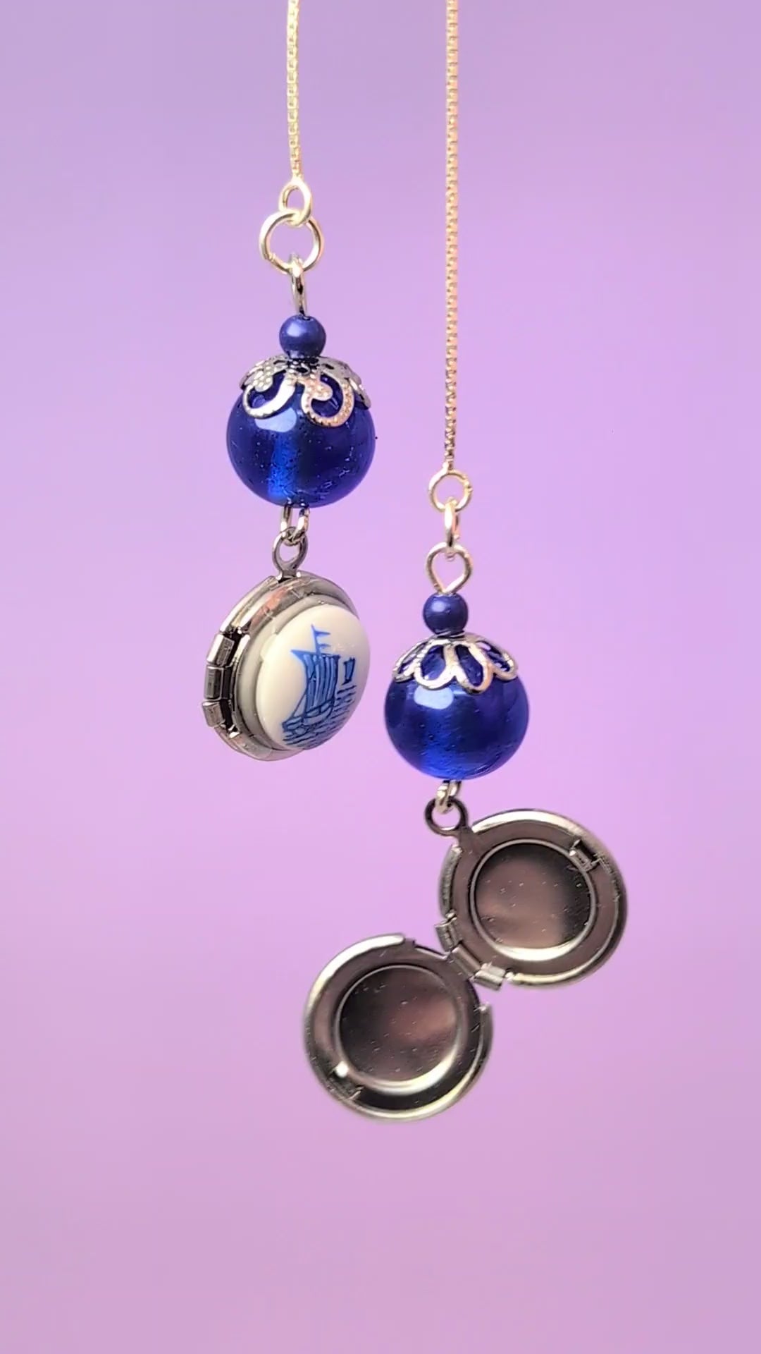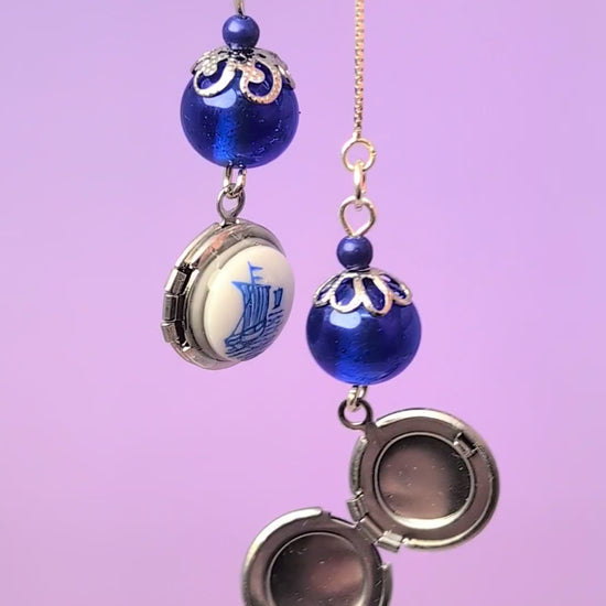 These are sterling silver threader earrings featuring vintage cobal blue glass beads and silver round lockets topped with vintage glass cabochons with little ship illustrations. ***all stainless steel lever backs can be switched out for sterling silver lever backs for $3***