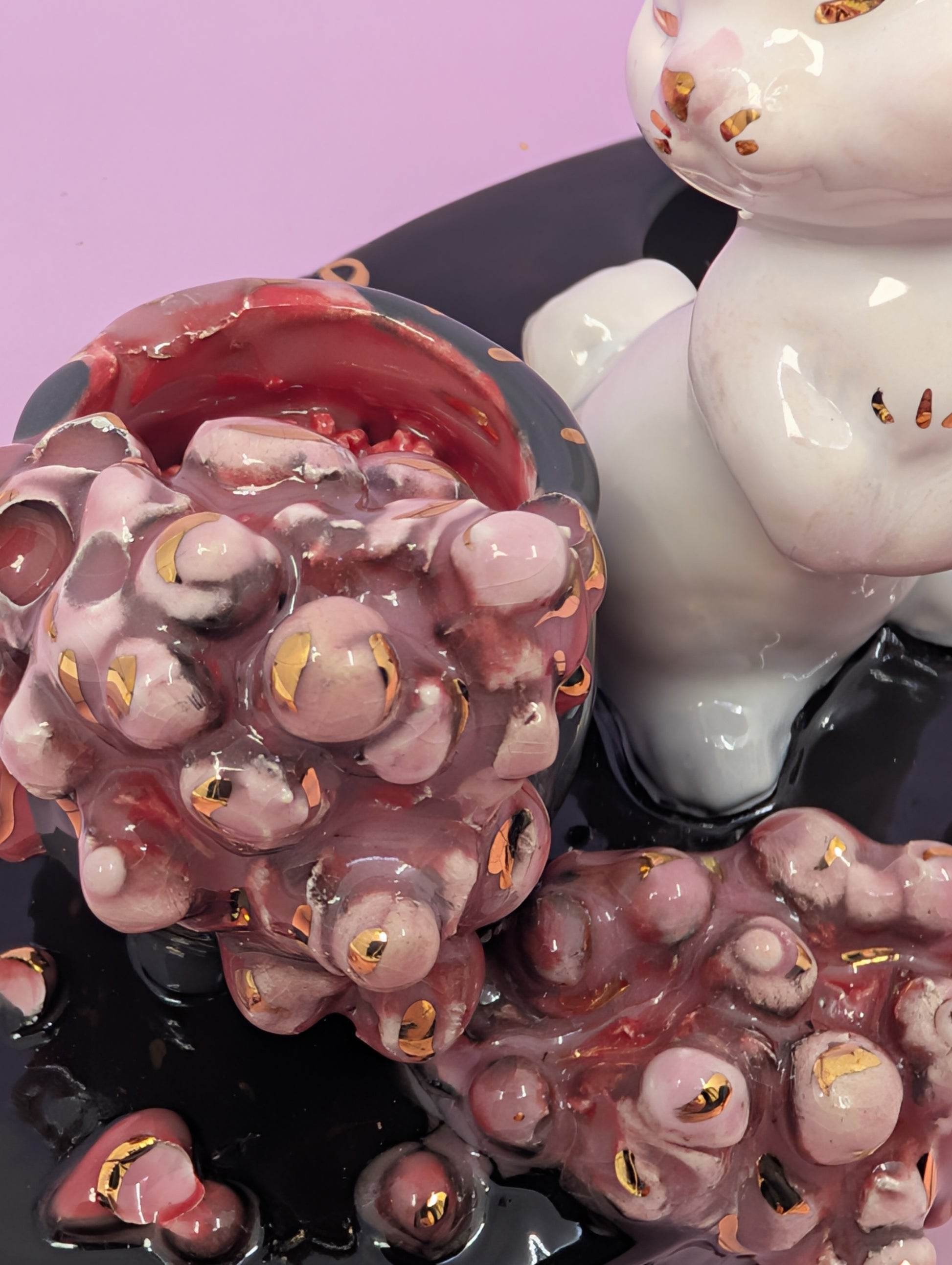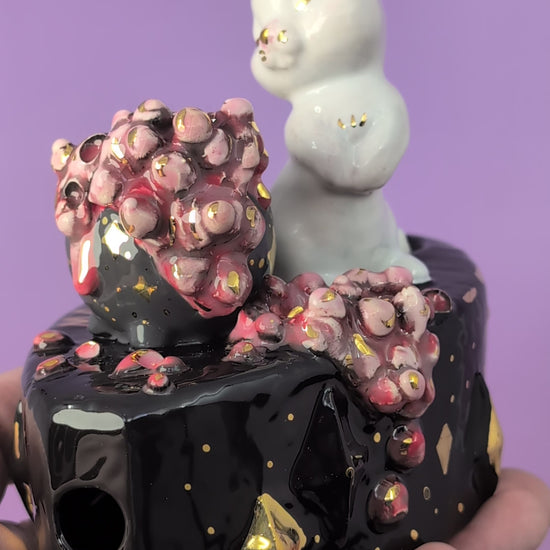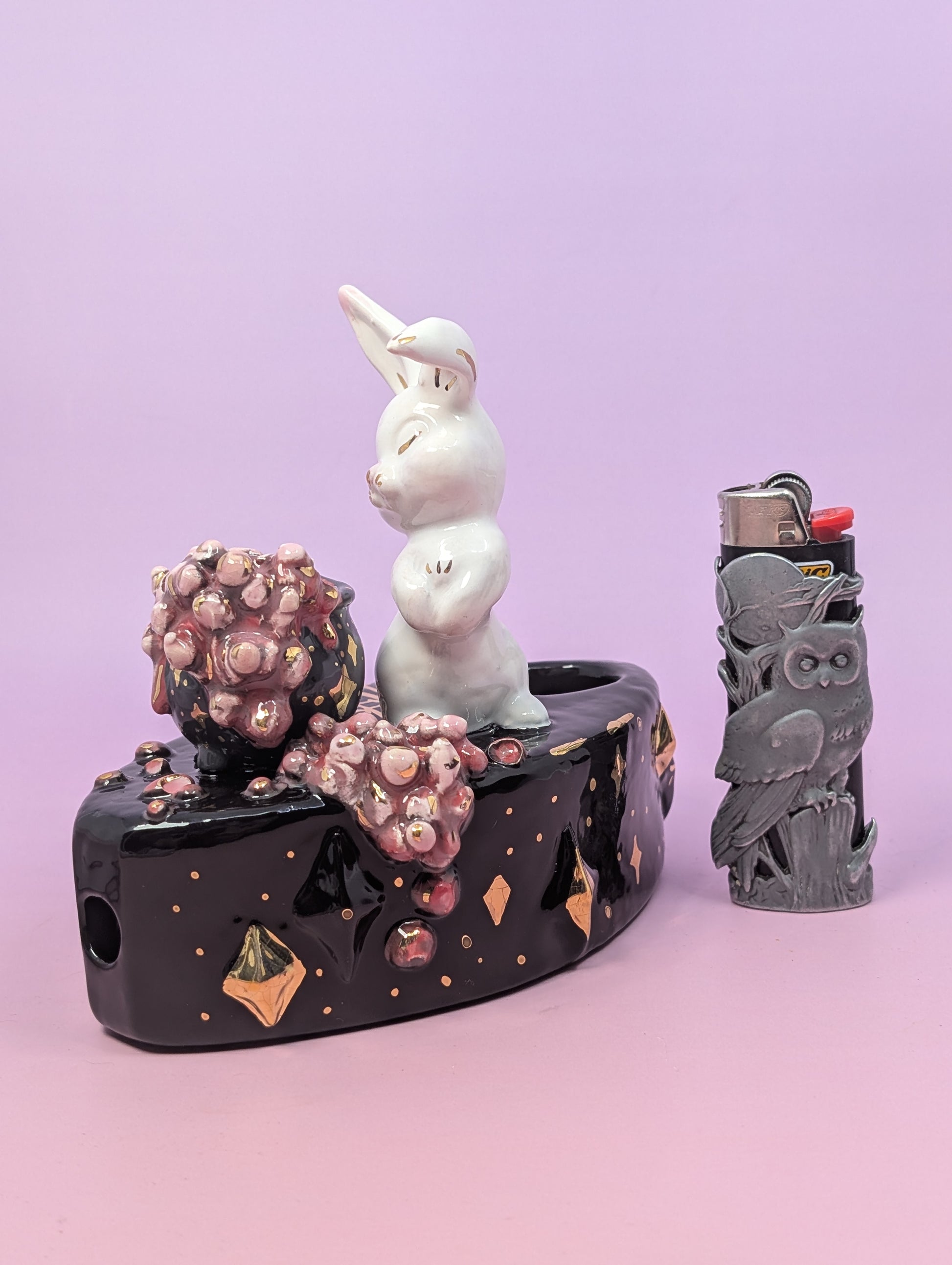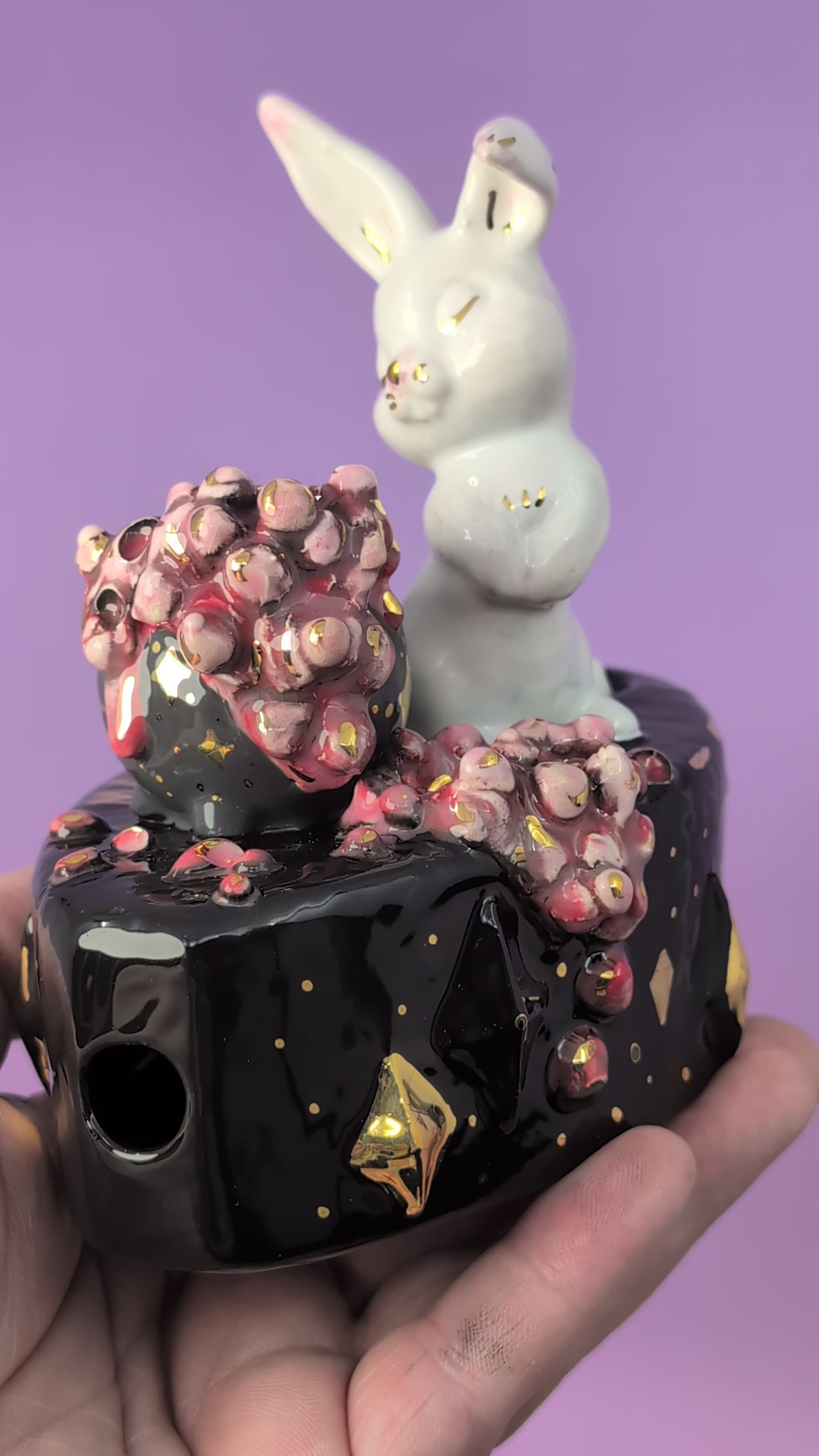 Handmade bunny pipe featuring a tiny witchy bunny in front of her bubbling cauldron. Surrounded by golden stars with a magical message, she’s here to bless your sesh, stir up good vibes, and remind you that magic and mischief go hand in hand.