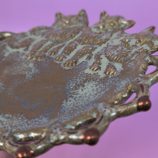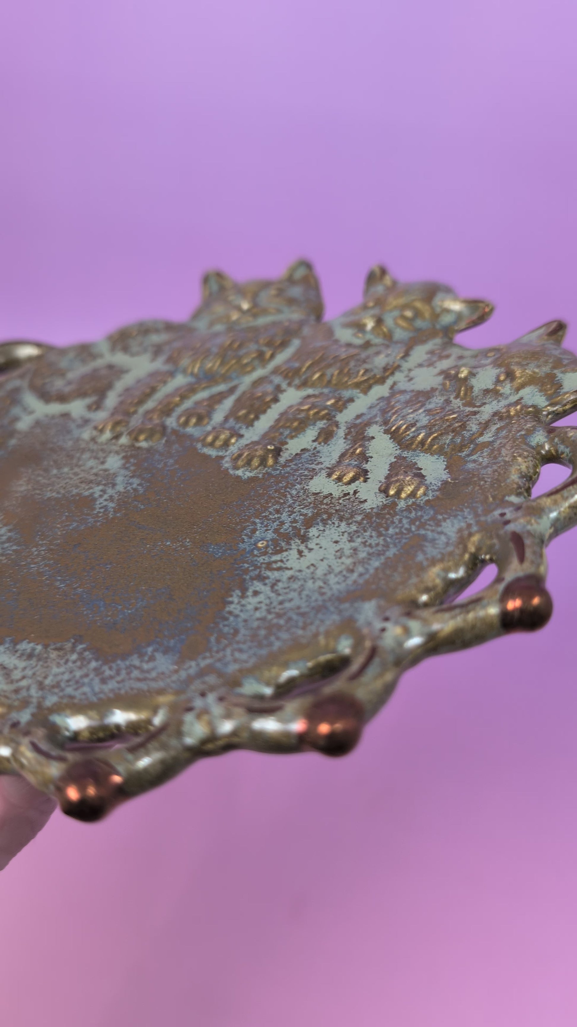 This kitty tray could be used for many things – her deep green glaze and her copper accents make this curious kitty tray most magical. Be sure to check out the back for a special message.