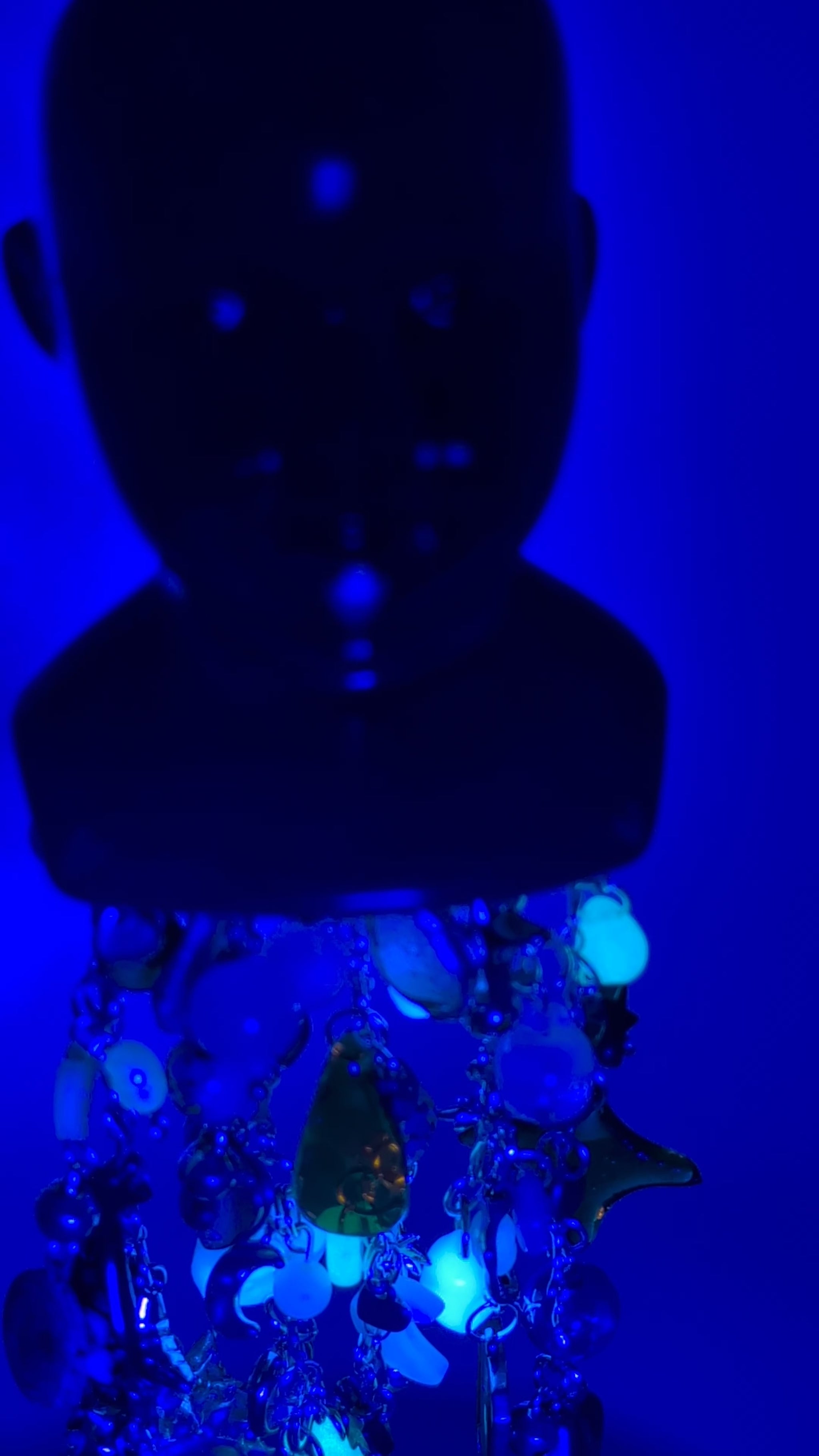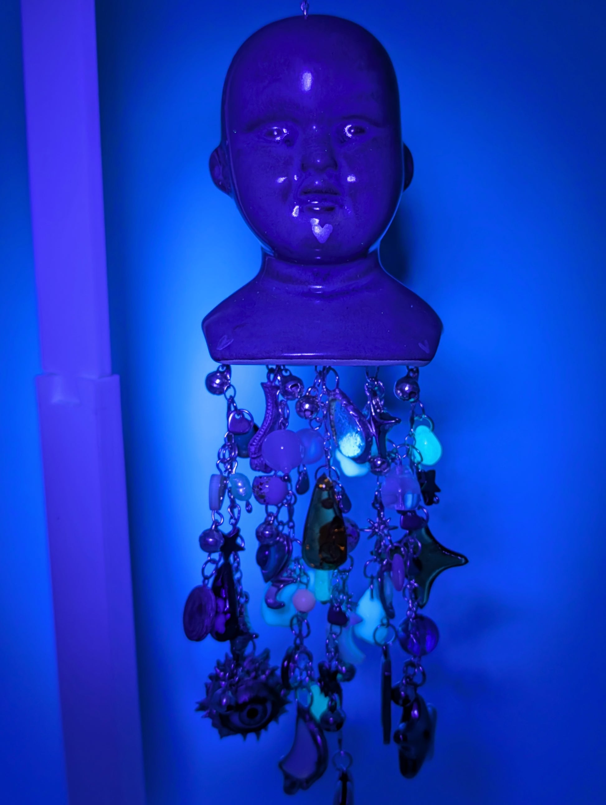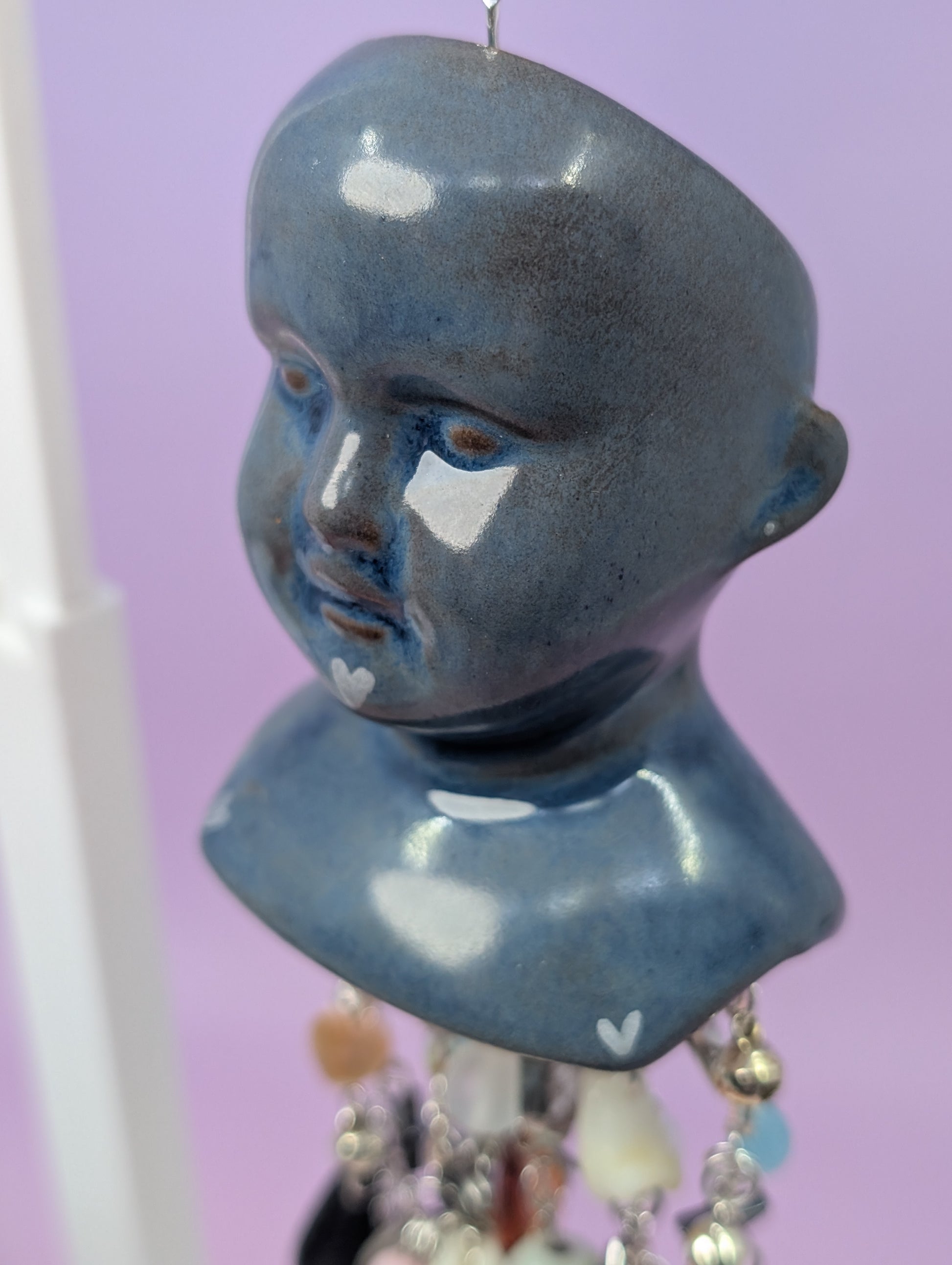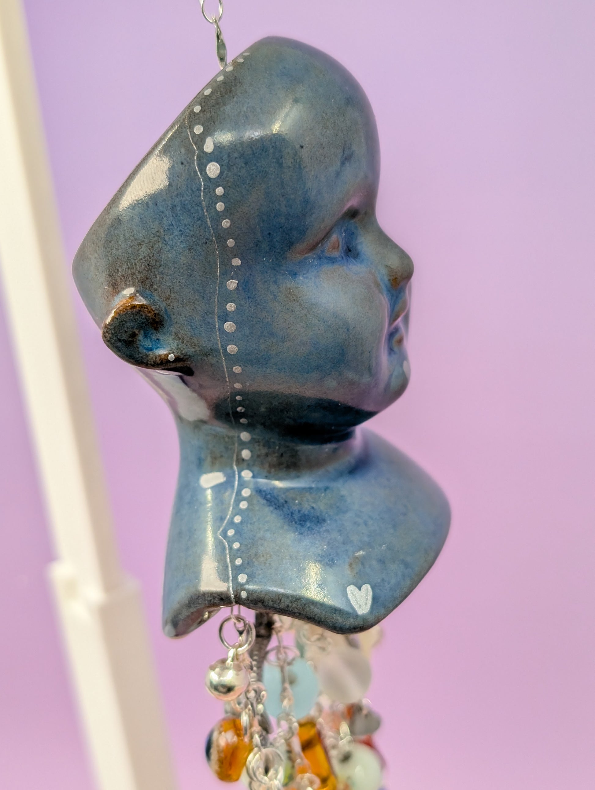 This babe in cobalt is inspired by the celestial. When I made the bust she cracked in the kiln. Just a small bit of space separated by fire was supposed to make her unusable – but I repaired her and adorned her cobalt skin with a lovely silver. I didn’t want to hide her imperfection, I wanted to highlight it, it gives her muchness. Her bust was made from a vintage mold from 1974 and she is being held from a delicate silver chain – don’t worry, it's strong. The bust herself holds onto lovely strands of magic in the form of vintage, handmade, and modern charms. These include: new glass beads that are UV reactive, vintage beads including Japanese lampwork glass beads from the 60s, vintage German cloud bead, vintage lockets and one with a gorgeous green patina, a vintage roller skate charm from the 70s, hand made fused glass starbursts, teardrop, and droplet, modern charms like the chrome bubble star, moons, and tiny stars, a moonstone moon that I soldered (she is drippy and gorgeous), a hand soldered doll eye that opens and closes, 3D printed teeth that I dipped in resin, drilled, and turned into charms, modern silver bells, modern silver heart locket with a vintage cobalt blue glass cabochon, drilled pink stone heart, vintage silver cut glass charm, vintage acrylic celestial bead, a cute little pink bead from 70s Germany, hand fused clear glass teardrop that I soldered, modern balloon style silver starburst.