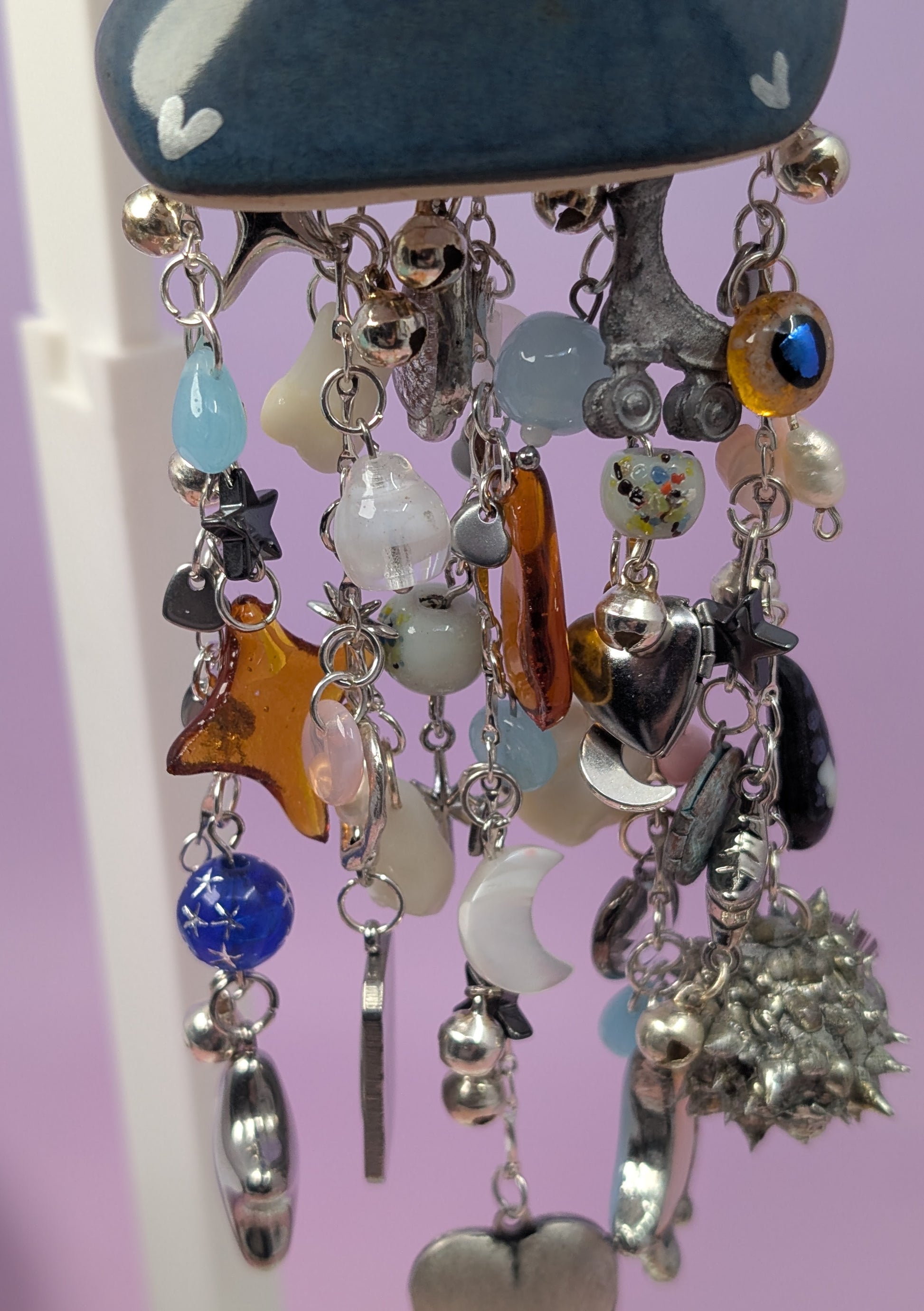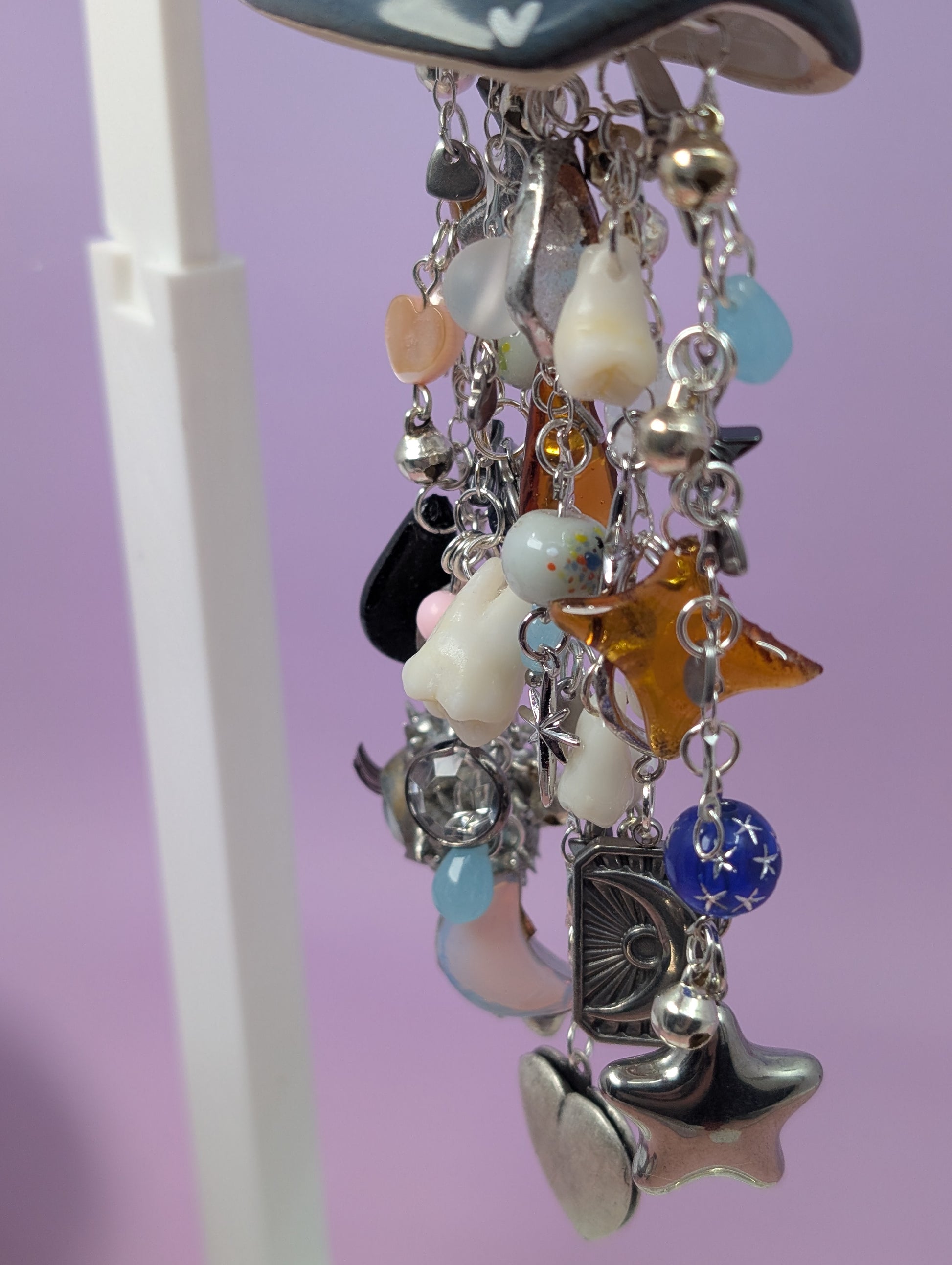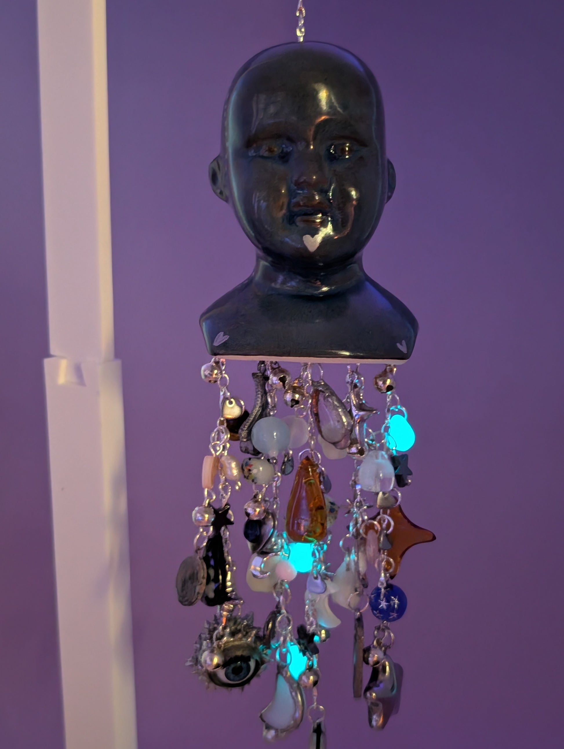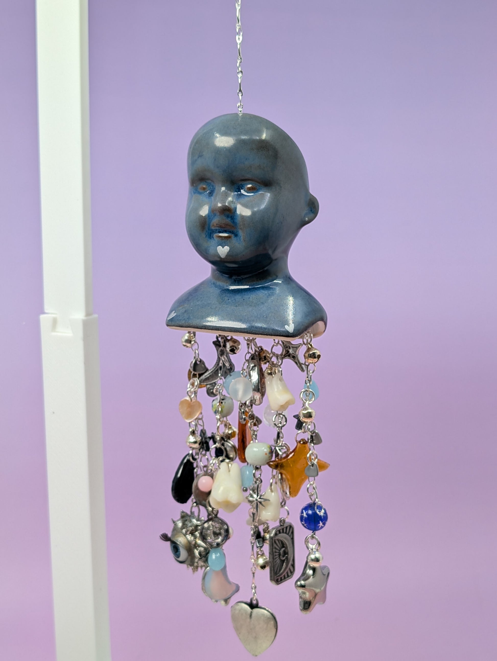 This babe in cobalt is inspired by the celestial. When I made the bust she cracked in the kiln. Just a small bit of space separated by fire was supposed to make her unusable – but I repaired her and adorned her cobalt skin with a lovely silver. I didn’t want to hide her imperfection, I wanted to highlight it, it gives her muchness. Her bust was made from a vintage mold from 1974 and she is being held from a delicate silver chain – don’t worry, it's strong. The bust herself holds onto lovely strands of magic in the form of vintage, handmade, and modern charms. These include: new glass beads that are UV reactive, vintage beads including Japanese lampwork glass beads from the 60s, vintage German cloud bead, vintage lockets and one with a gorgeous green patina, a vintage roller skate charm from the 70s, hand made fused glass starbursts, teardrop, and droplet, modern charms like the chrome bubble star, moons, and tiny stars, a moonstone moon that I soldered (she is drippy and gorgeous), a hand soldered doll eye that opens and closes, 3D printed teeth that I dipped in resin, drilled, and turned into charms, modern silver bells, modern silver heart locket with a vintage cobalt blue glass cabochon, drilled pink stone heart, vintage silver cut glass charm, vintage acrylic celestial bead, a cute little pink bead from 70s Germany, hand fused clear glass teardrop that I soldered, modern balloon style silver starburst.