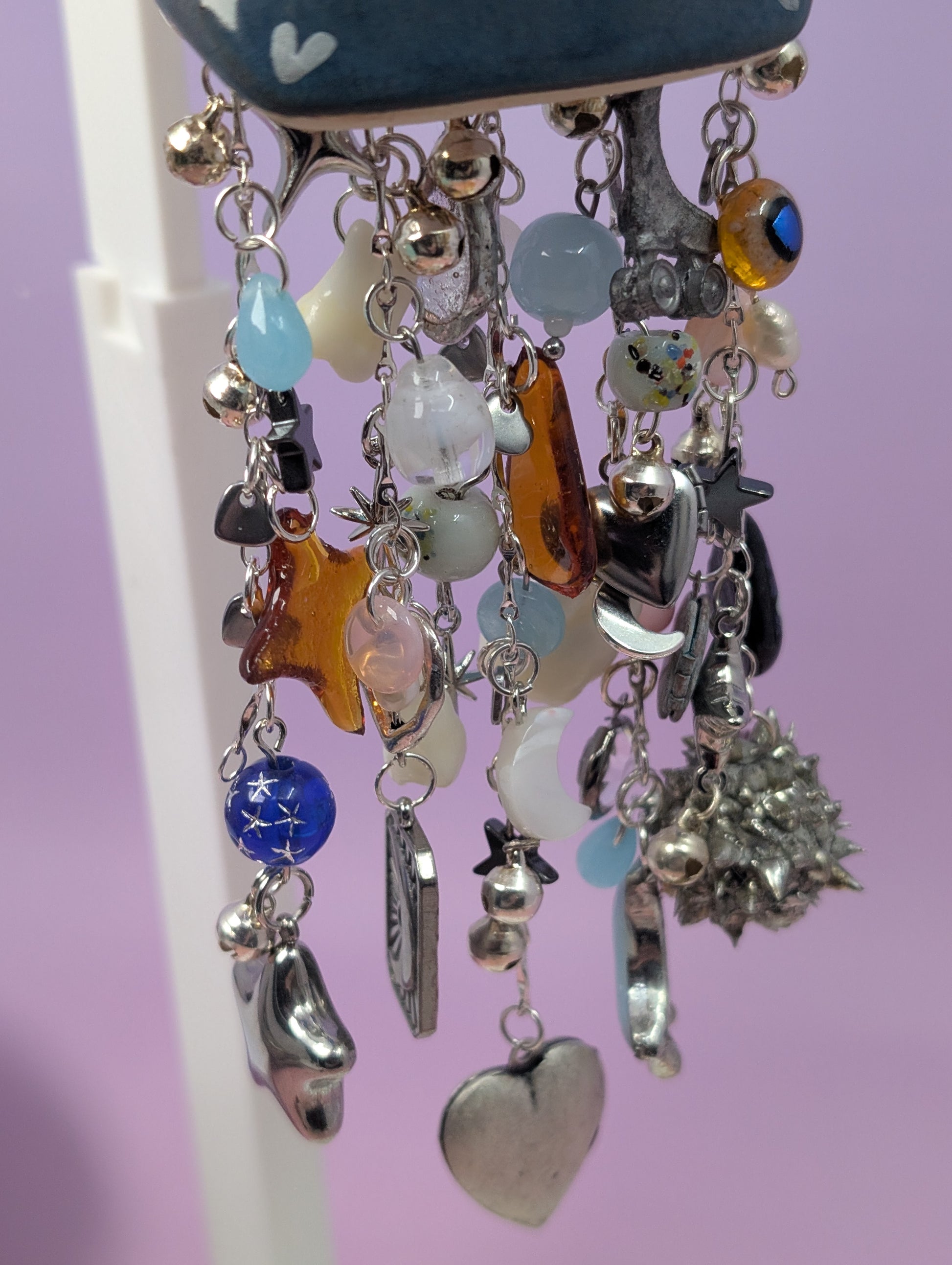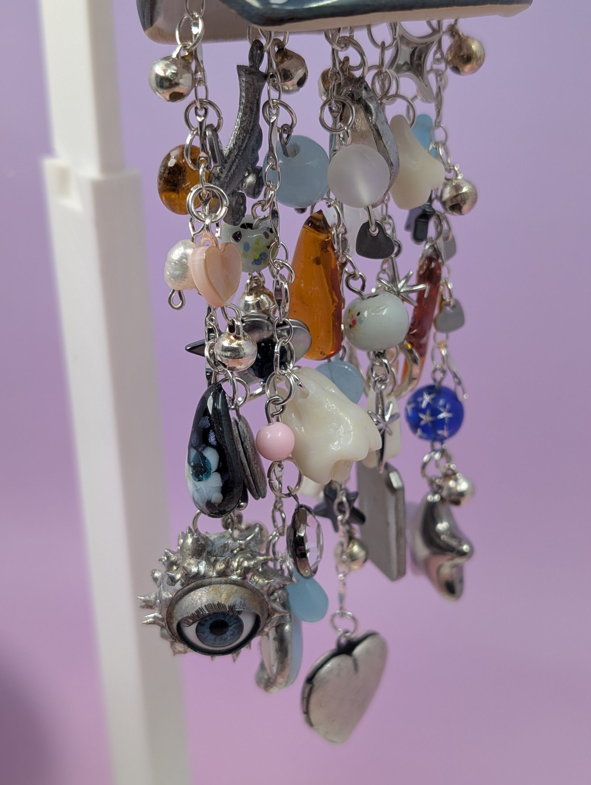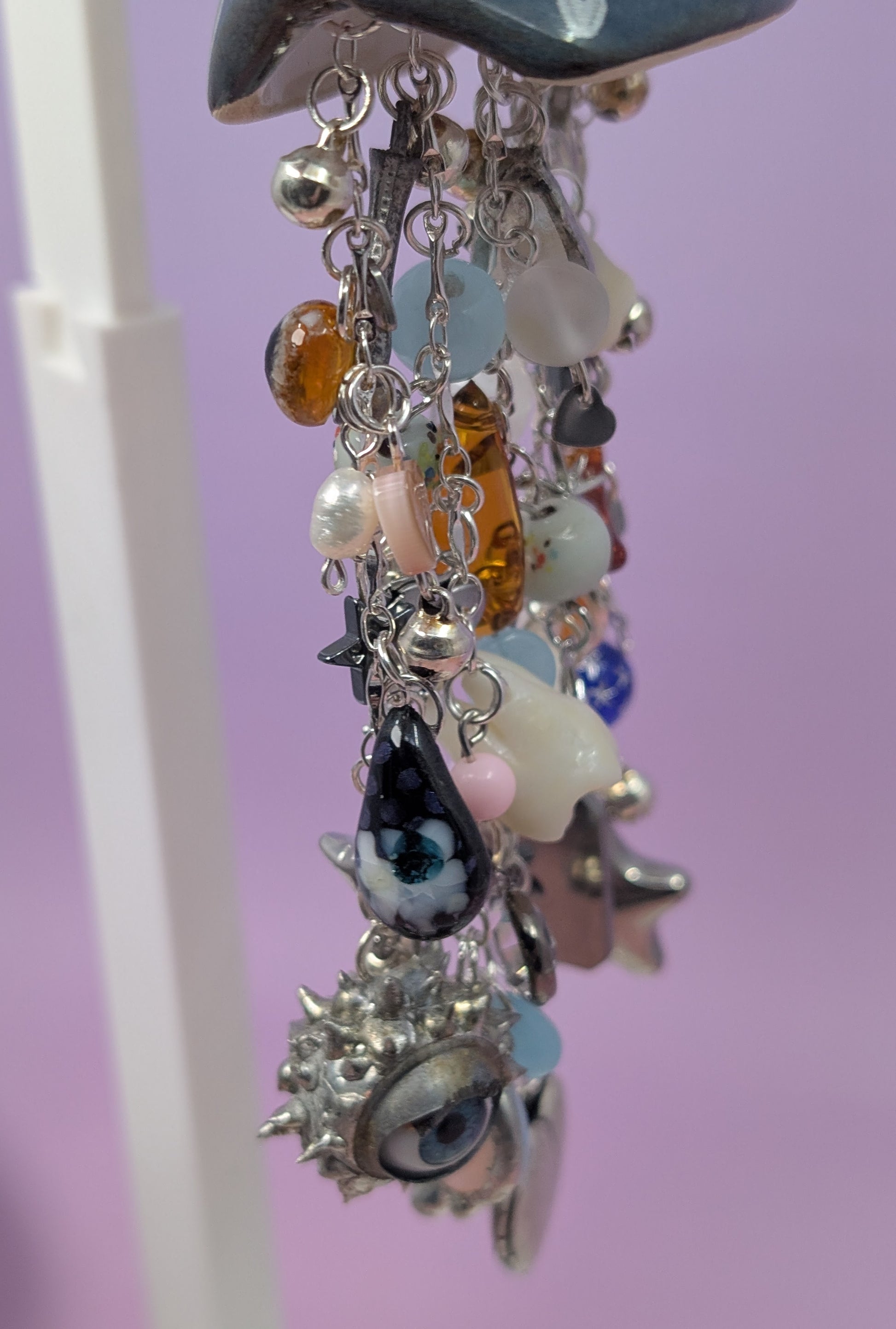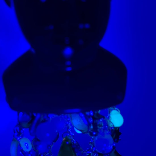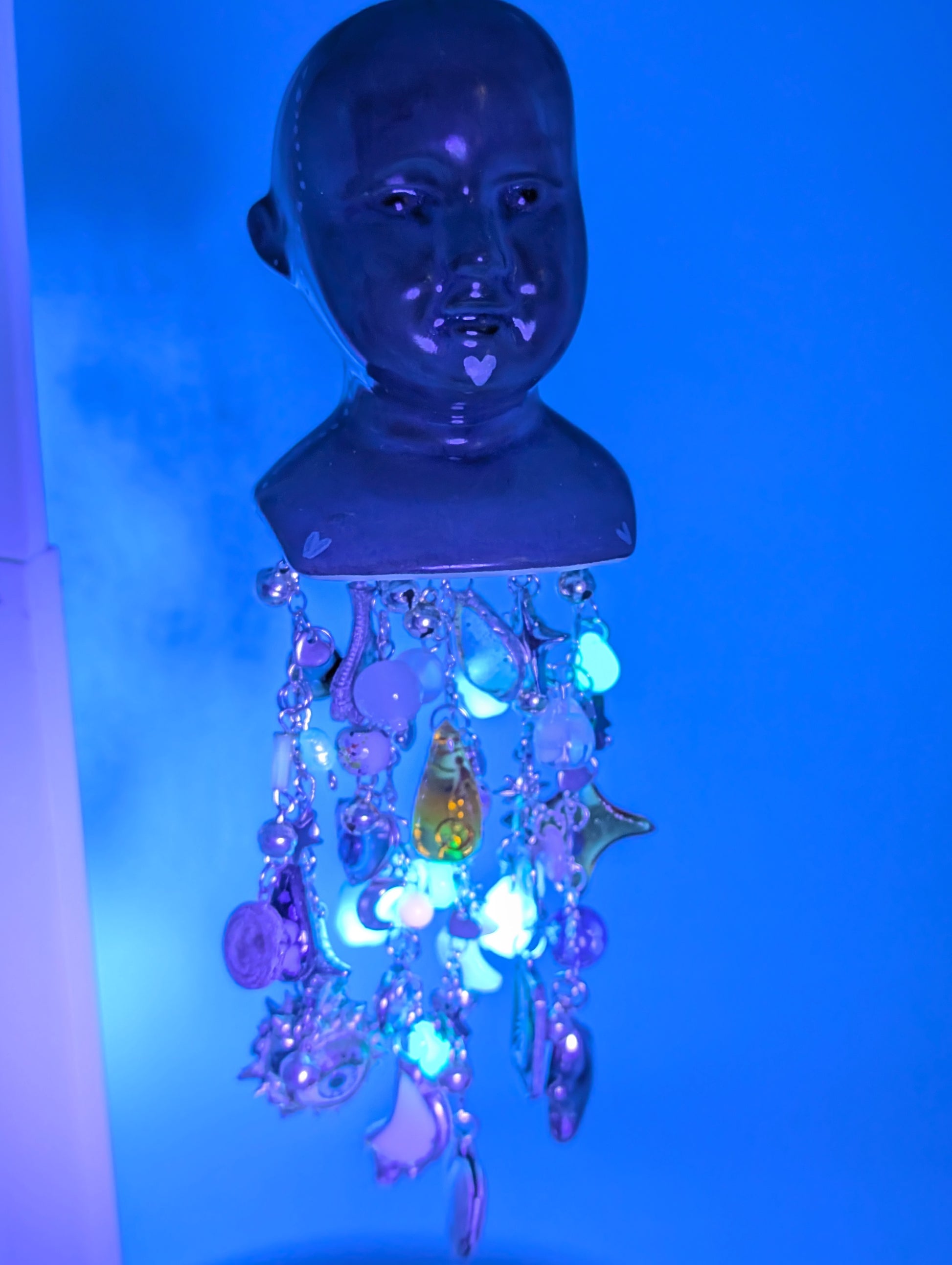 This babe in cobalt is inspired by the celestial. When I made the bust she cracked in the kiln. Just a small bit of space separated by fire was supposed to make her unusable – but I repaired her and adorned her cobalt skin with a lovely silver. I didn’t want to hide her imperfection, I wanted to highlight it, it gives her muchness. Her bust was made from a vintage mold from 1974 and she is being held from a delicate silver chain – don’t worry, it's strong. The bust herself holds onto lovely strands of magic in the form of vintage, handmade, and modern charms. These include: new glass beads that are UV reactive, vintage beads including Japanese lampwork glass beads from the 60s, vintage German cloud bead, vintage lockets and one with a gorgeous green patina, a vintage roller skate charm from the 70s, hand made fused glass starbursts, teardrop, and droplet, modern charms like the chrome bubble star, moons, and tiny stars, a moonstone moon that I soldered (she is drippy and gorgeous), a hand soldered doll eye that opens and closes, 3D printed teeth that I dipped in resin, drilled, and turned into charms, modern silver bells, modern silver heart locket with a vintage cobalt blue glass cabochon, drilled pink stone heart, vintage silver cut glass charm, vintage acrylic celestial bead, a cute little pink bead from 70s Germany, hand fused clear glass teardrop that I soldered, modern balloon style silver starburst.