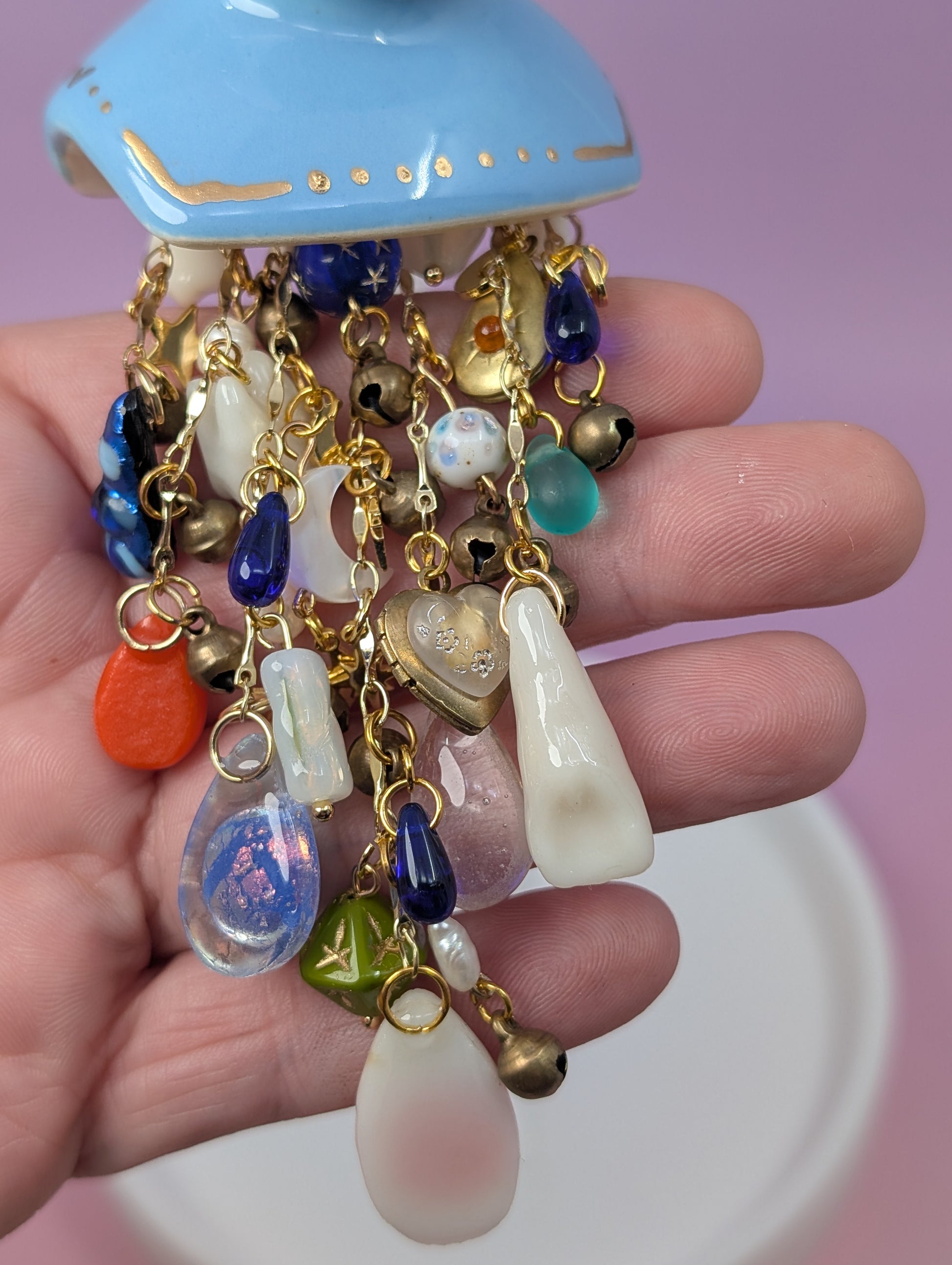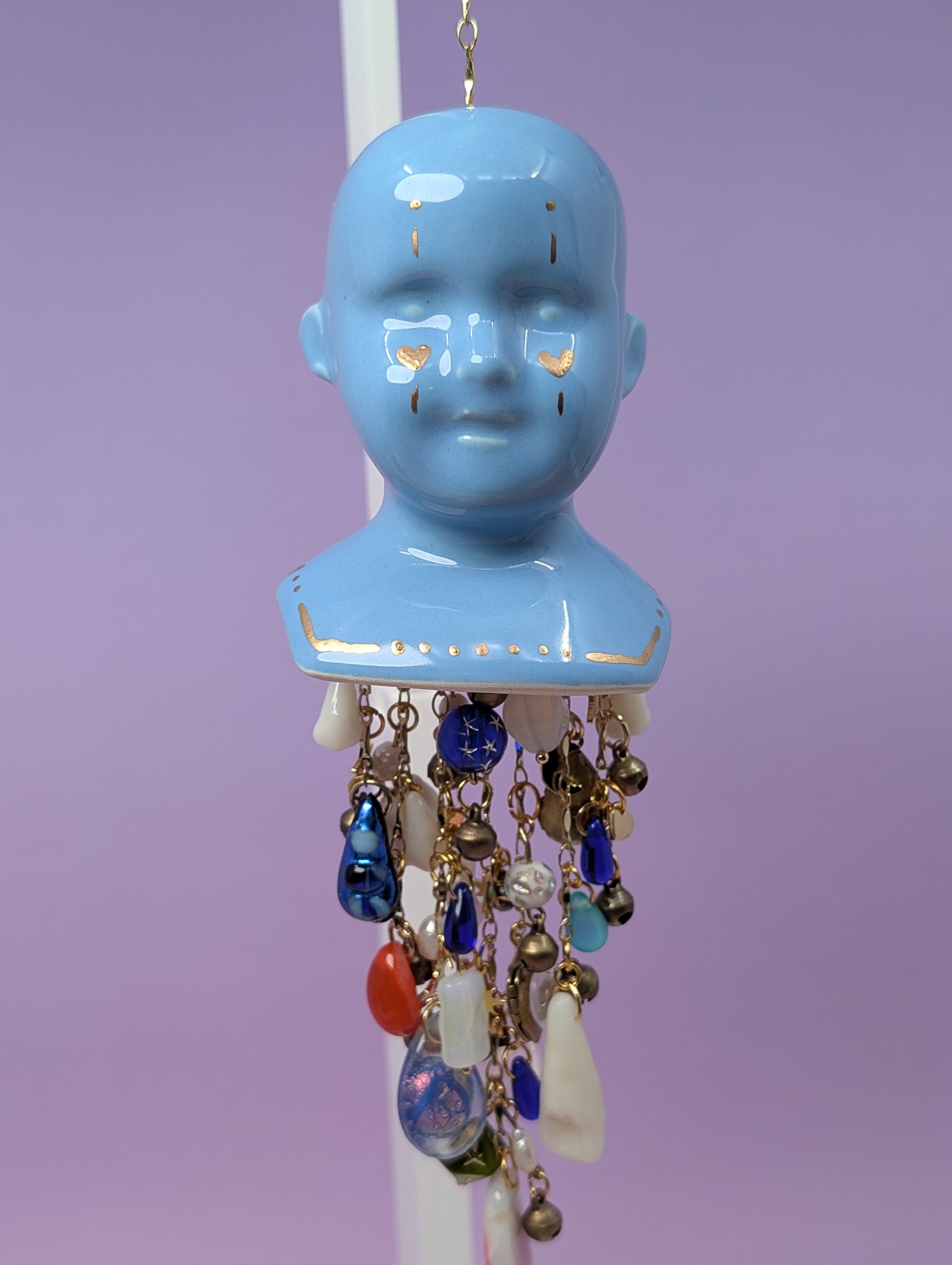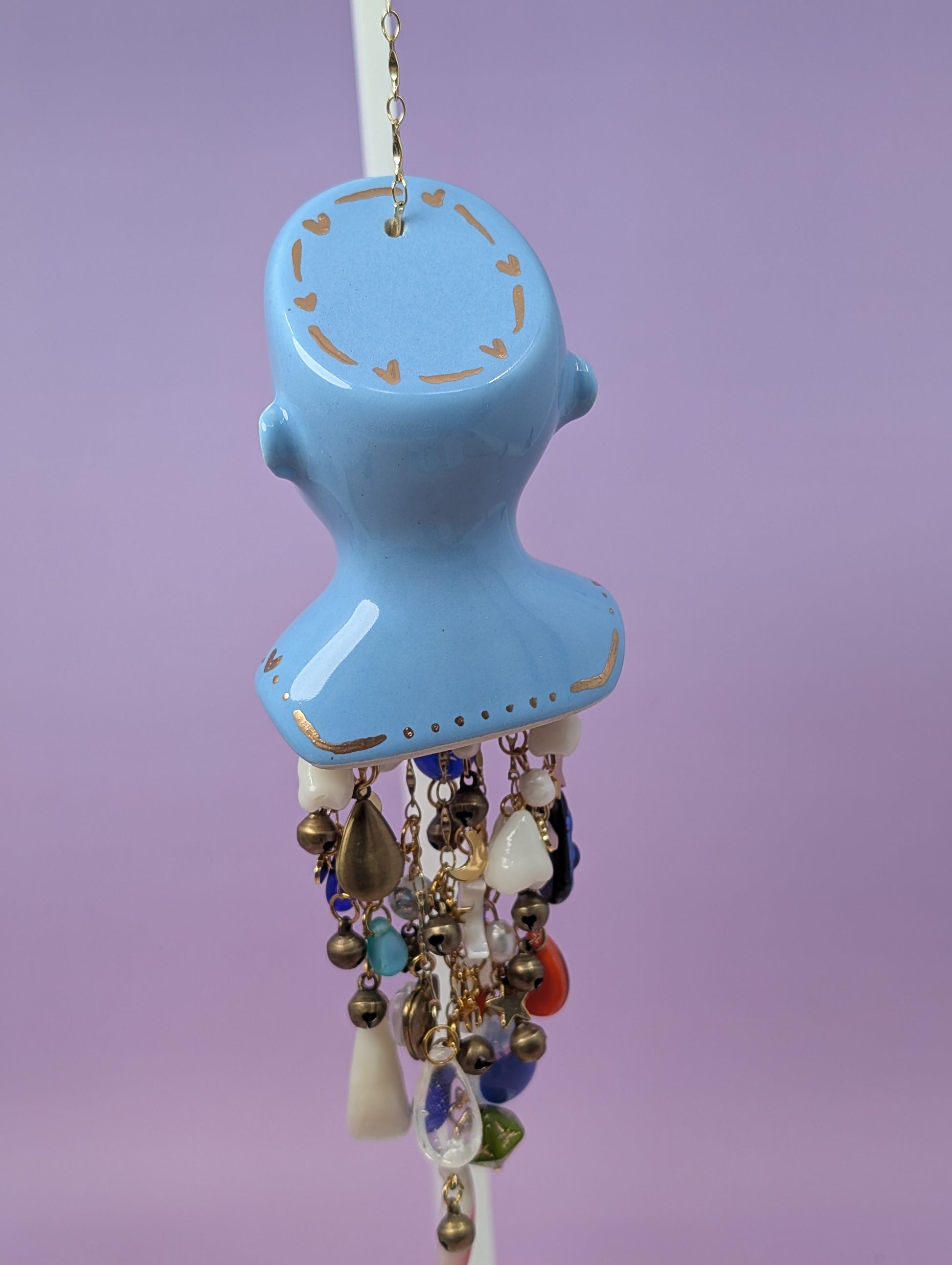 This was the first chime I made for this series. Her bust is from vintage mold from 1974. Her glaze is a true baby blue and she is adorned with gold enamel. Her chimes fall from a delicate piece of blue rod glass and each strand contains vintage, handmade, and modern charms. These include: hand fused glass teardrops of many different colors, vintage lockets from the 70s and 80s, 3D printed teeth from our studio and then they are dipped in resin, drilled, and turned into charms, vintage brass bells, vintage glass beads including a Japanese lampwork bead from the 60s (which I have had in my collection for a couple of years), beads from the 80s, and modern glass beads. They also contain a couple of drilled freshwater pearls, a mother of pearl crescent moon, modern gold stars, moons, and hearts. And lastly the star of the show a vintage Vaseline glass/uranium glass bead. The uranium glass bead along with a couple of the other beads are UV reactive. All of this is being held by a delicate (but strong) gold chain.