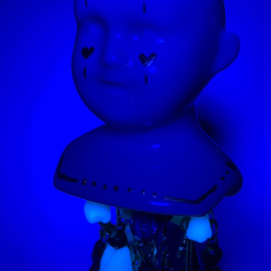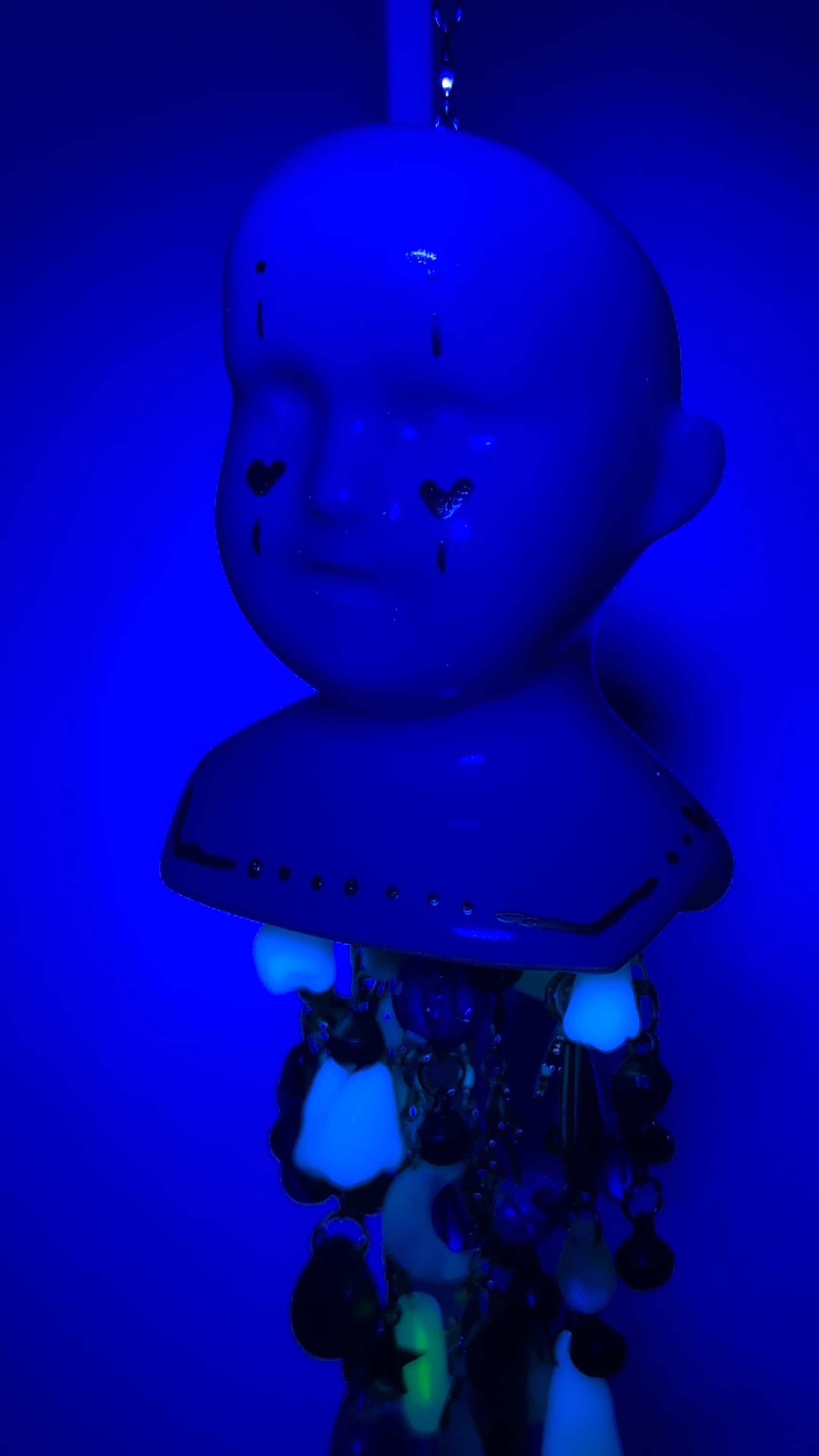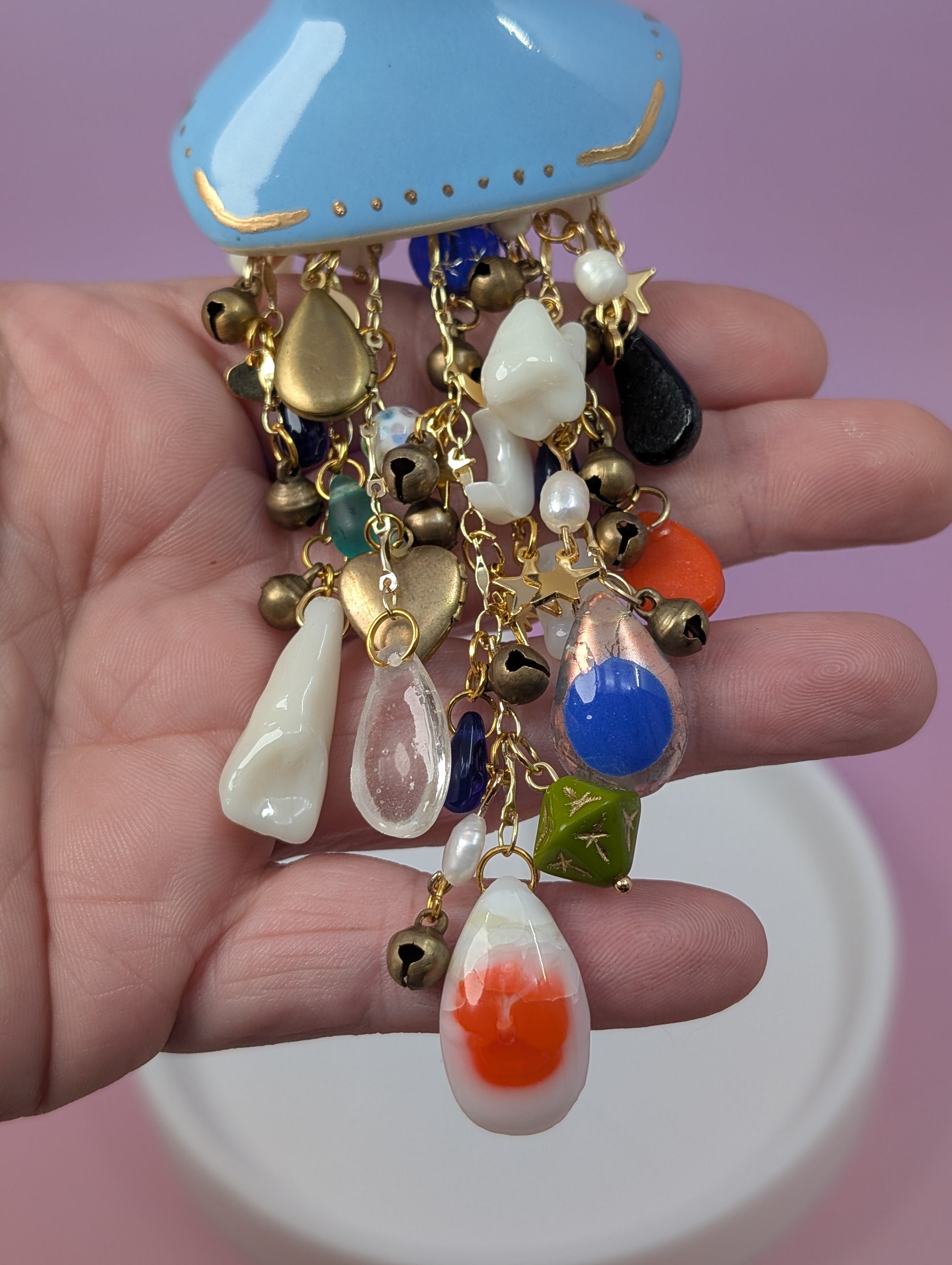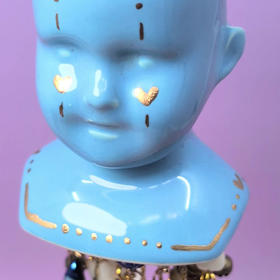 This was the first chime I made for this series. Her bust is from vintage mold from 1974. Her glaze is a true baby blue and she is adorned with gold enamel. Her chimes fall from a delicate piece of blue rod glass and each strand contains vintage, handmade, and modern charms. These include: hand fused glass teardrops of many different colors, vintage lockets from the 70s and 80s, 3D printed teeth from our studio and then they are dipped in resin, drilled, and turned into charms, vintage brass bells, vintage glass beads including a Japanese lampwork bead from the 60s (which I have had in my collection for a couple of years), beads from the 80s, and modern glass beads. They also contain a couple of drilled freshwater pearls, a mother of pearl crescent moon, modern gold stars, moons, and hearts. And lastly the star of the show a vintage Vaseline glass/uranium glass bead. The uranium glass bead along with a couple of the other beads are UV reactive. All of this is being held by a delicate (but strong) gold chain.