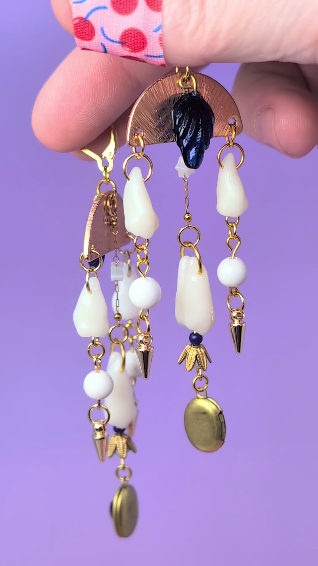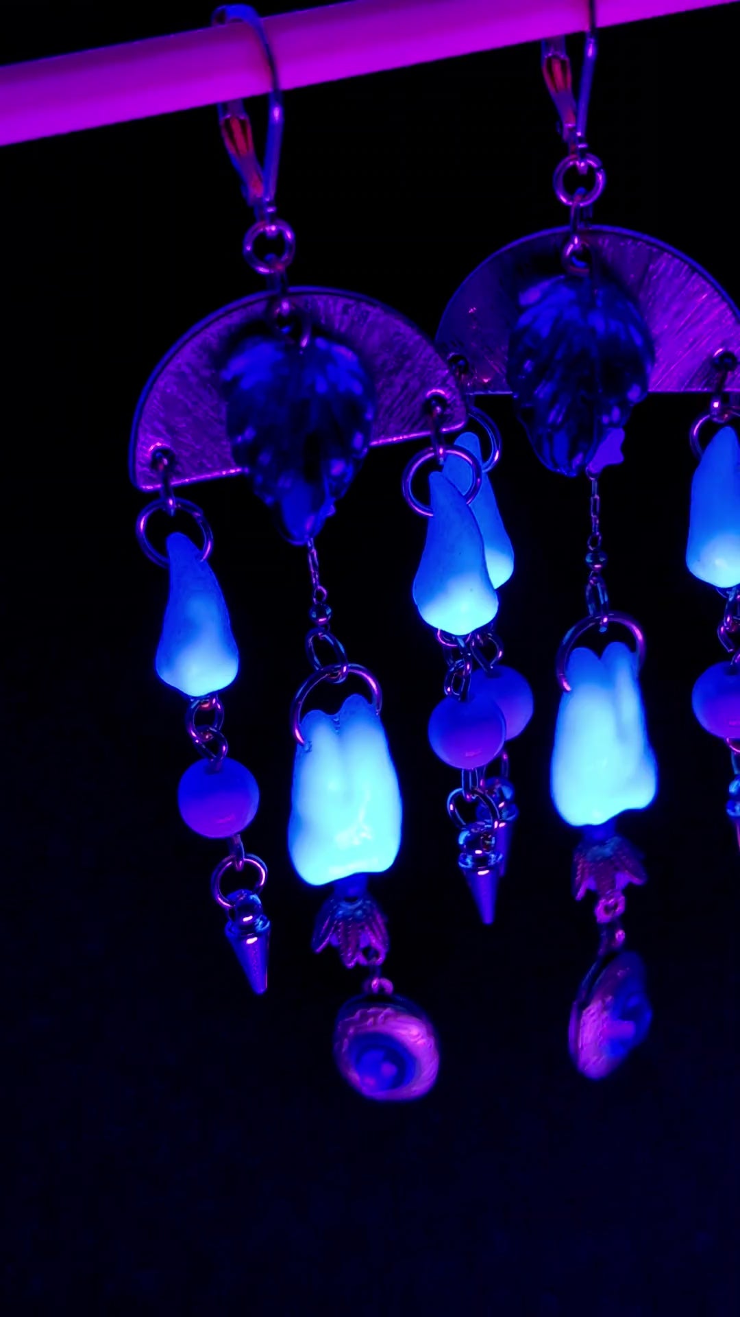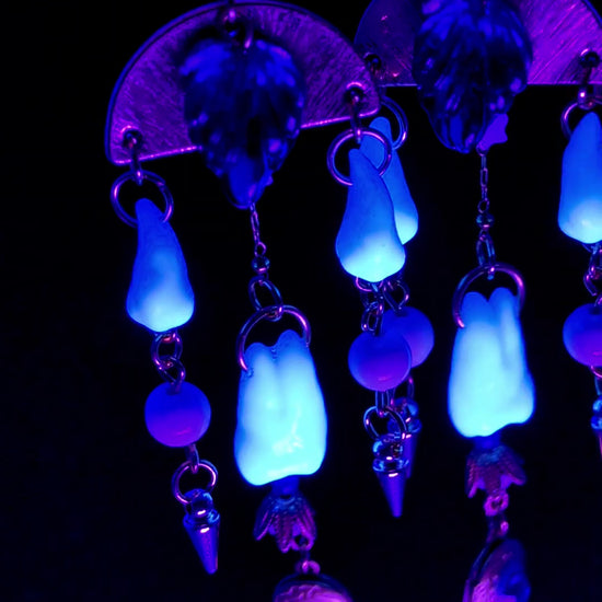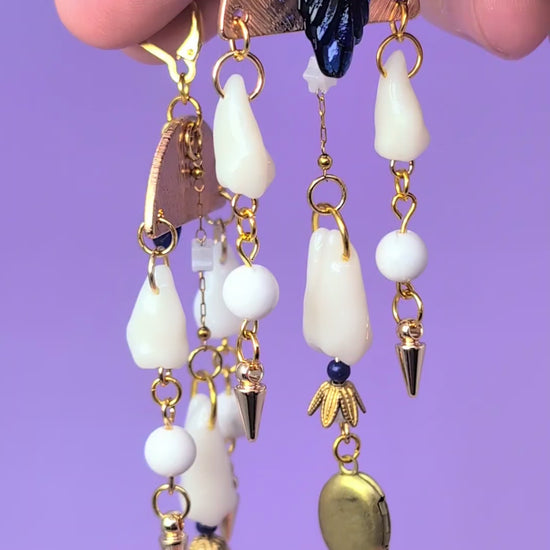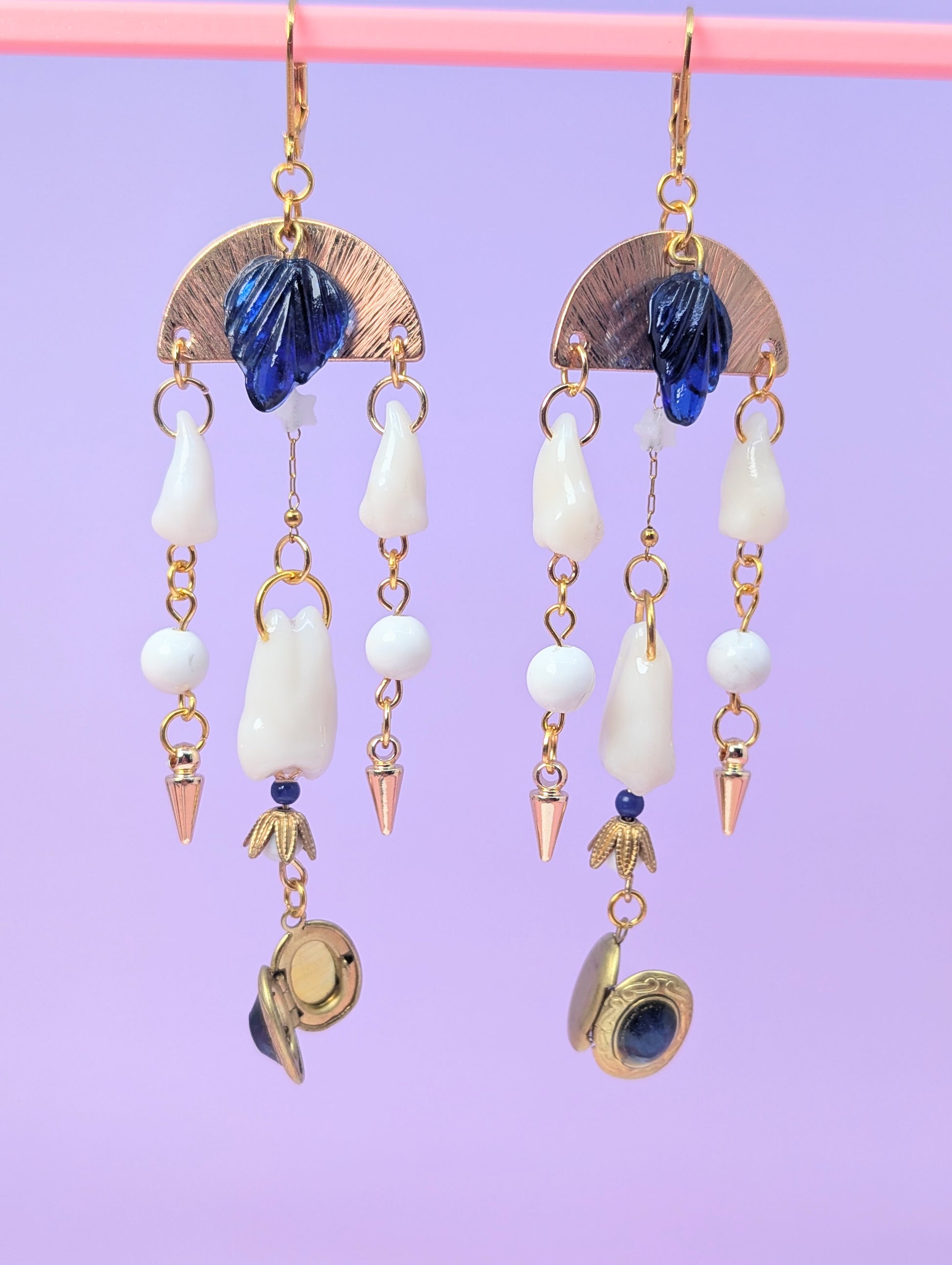 These are UV reactive! 24k gold plated lever back earrings featuring hand textured gold-plated brass half-moons adorned with vintage 50s cobalt blue pressed glass leaves. The outer chains feature handmade in our studio 3D printed and resin dipped human canine teeth, howlite stone beads, and adorable little gold spikes. The middle chain features another handmade human molar tooth, with vintage glass cobalt beads, vintage Mirium Haskell brass leaf findings, and vintage brass lockets that have vintage cobalt blue cut glass. I think these lockets would be lovely holding a tiny amount of herbs or magical goodness.
