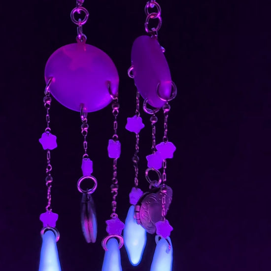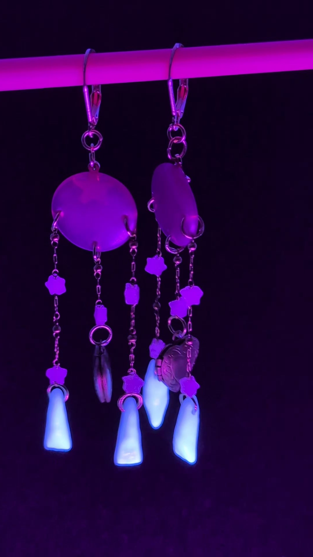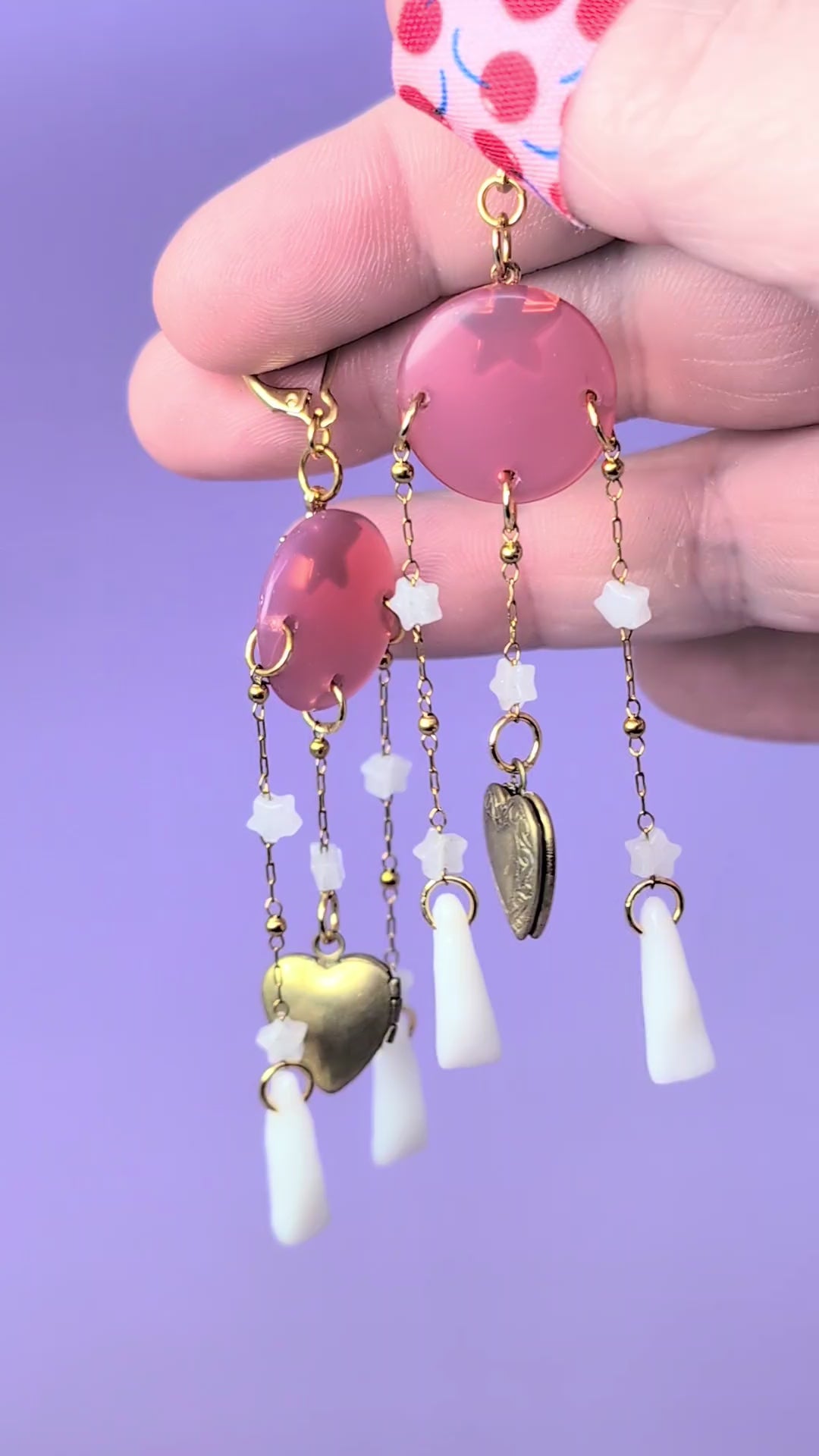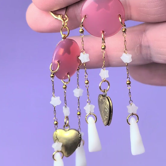 These are UV reactive! These 24k gold plated lever back earrings feature my favorite beads I own - made in Germany in the 60s these pink glass discs drip down 3 delicate gold chains that have tiny moonstone stars - the middle chain dangles a lovely vintage brass heart locket and each locket is framed with a 3D printed, in our studio, and resin dipped ivory human lateral incisor tooth. I think these lockets would be lovely holding a tiny amount of herbs or magical goodness.