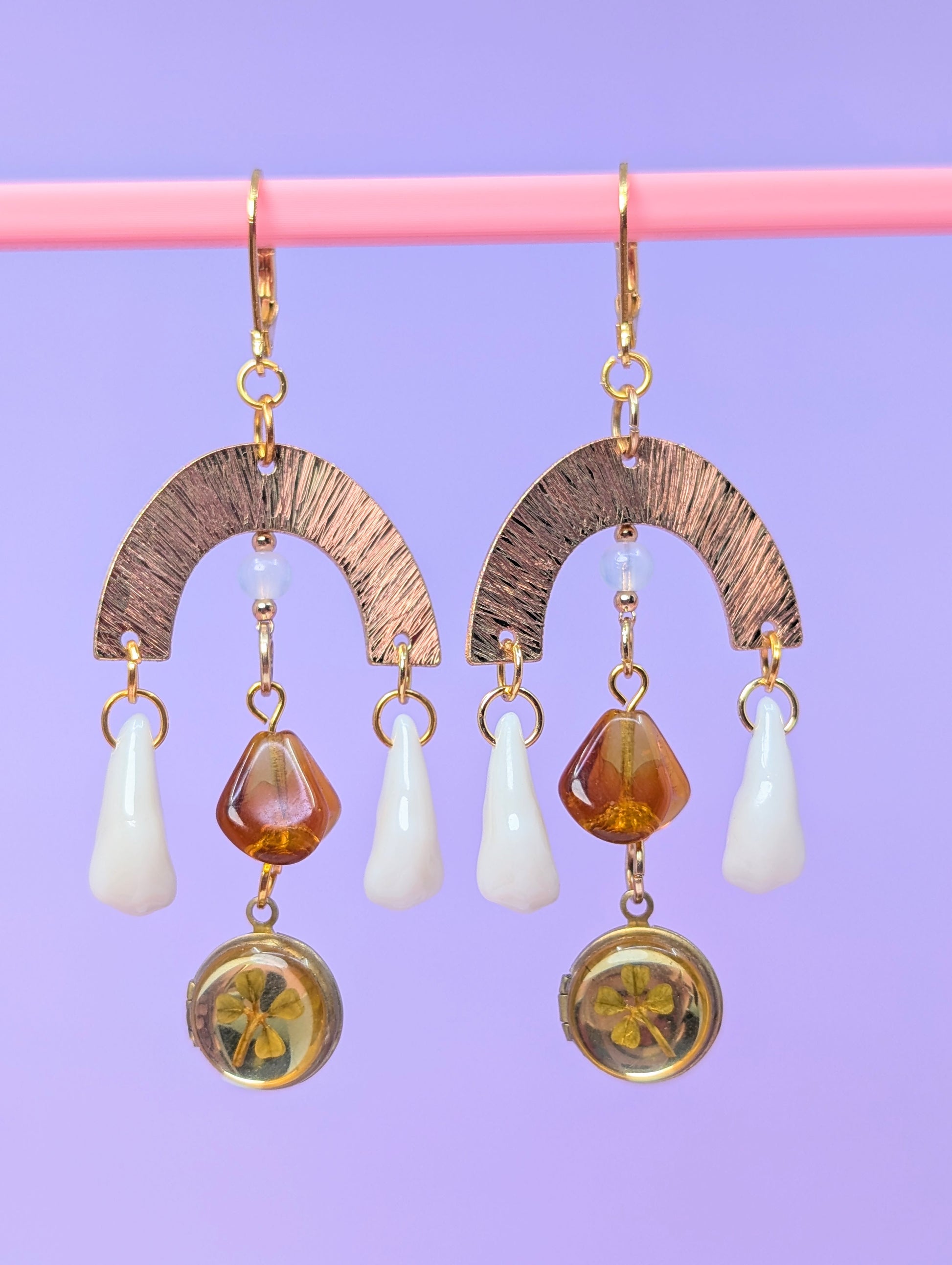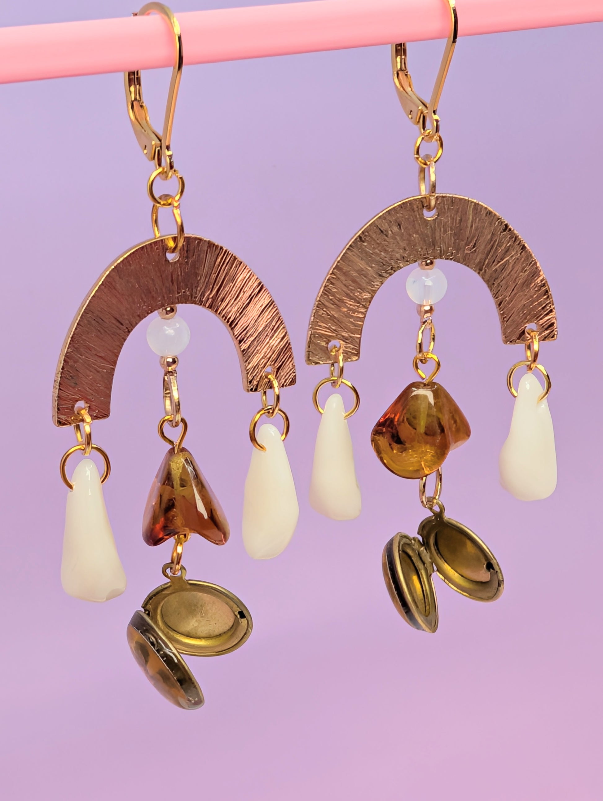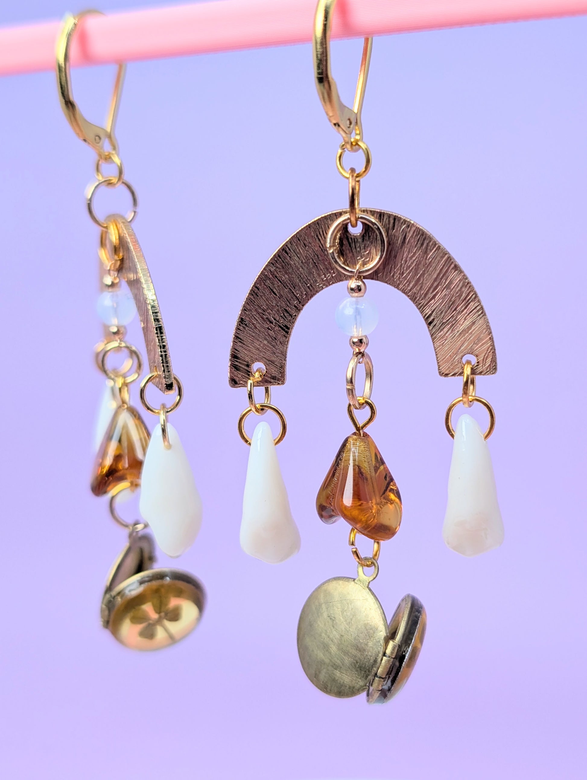 These are UV reactive! These 24k gold-plated leverback earrings feature a hand textured gold plated brass archway - each archway dripping with vintage topaz uranium glass beads holding onto vintage brass lockets topped with a real vintage four leaf clover set in cabochon. Those are framed by 3D printed, in our studio, resin dipped ivory human canine teeth. I think these lockets would be lovely holding a tiny amount of herbs or magical goodness.