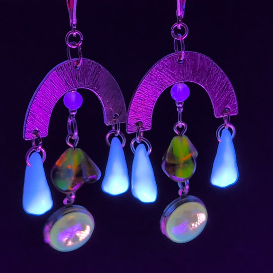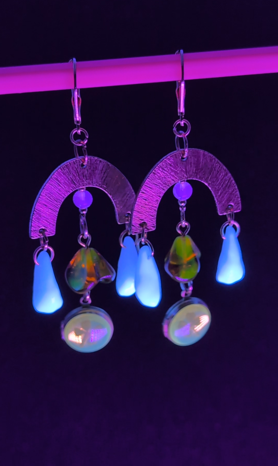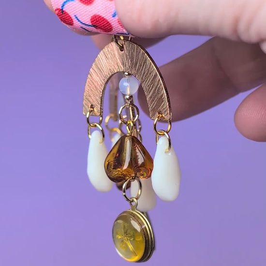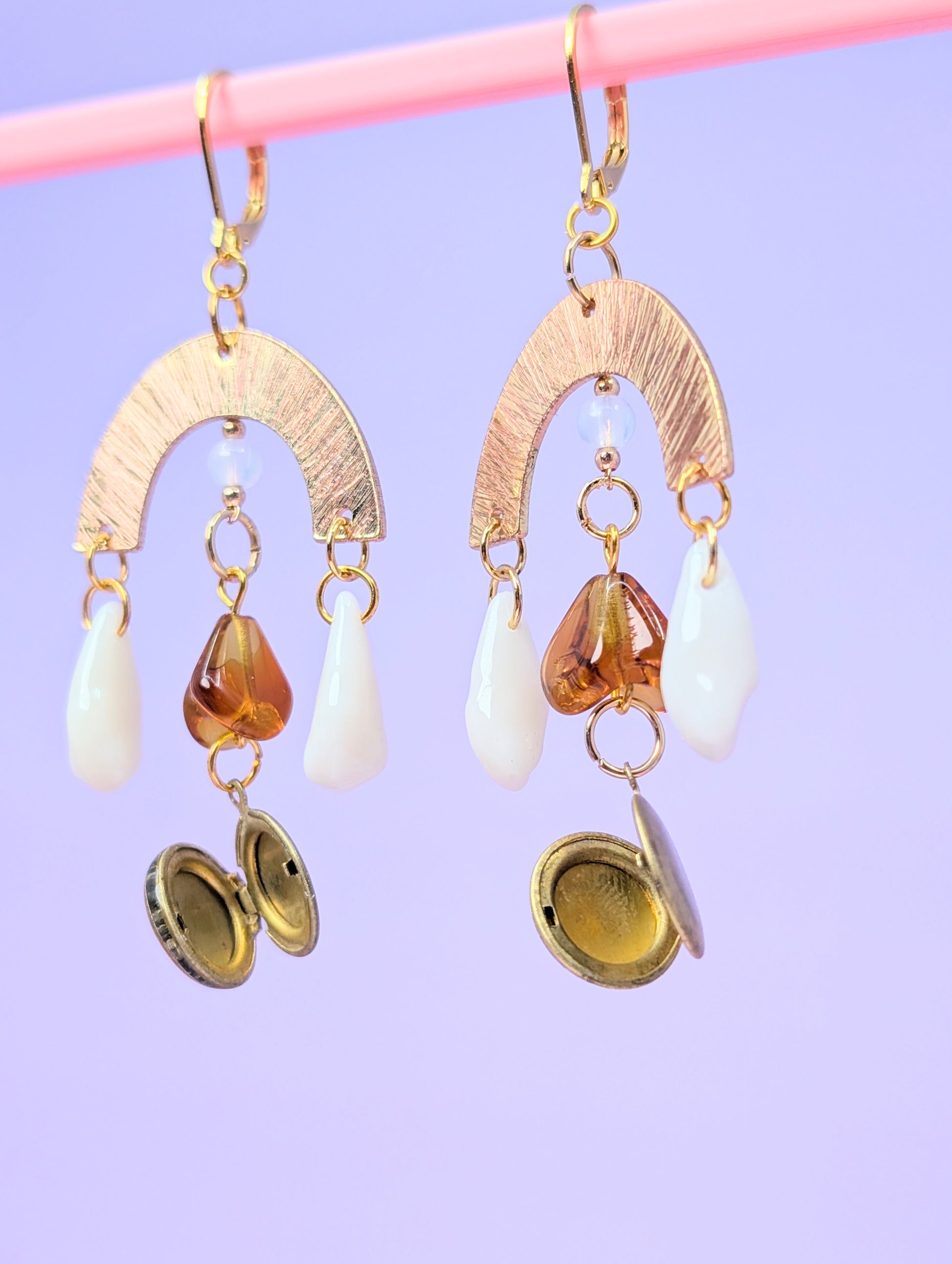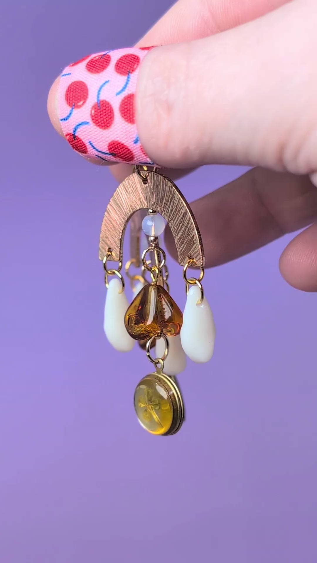 These are UV reactive! These 24k gold-plated leverback earrings feature a hand textured gold plated brass archway - each archway dripping with vintage topaz uranium glass beads holding onto vintage brass lockets topped with a real vintage four leaf clover set in cabochon. Those are framed by 3D printed, in our studio, resin dipped ivory human canine teeth. I think these lockets would be lovely holding a tiny amount of herbs or magical goodness.