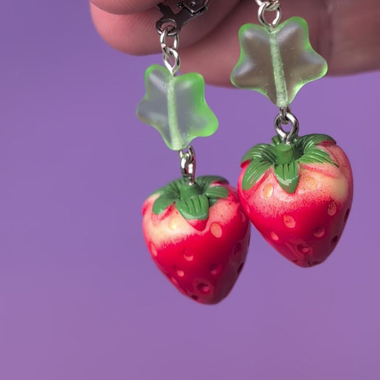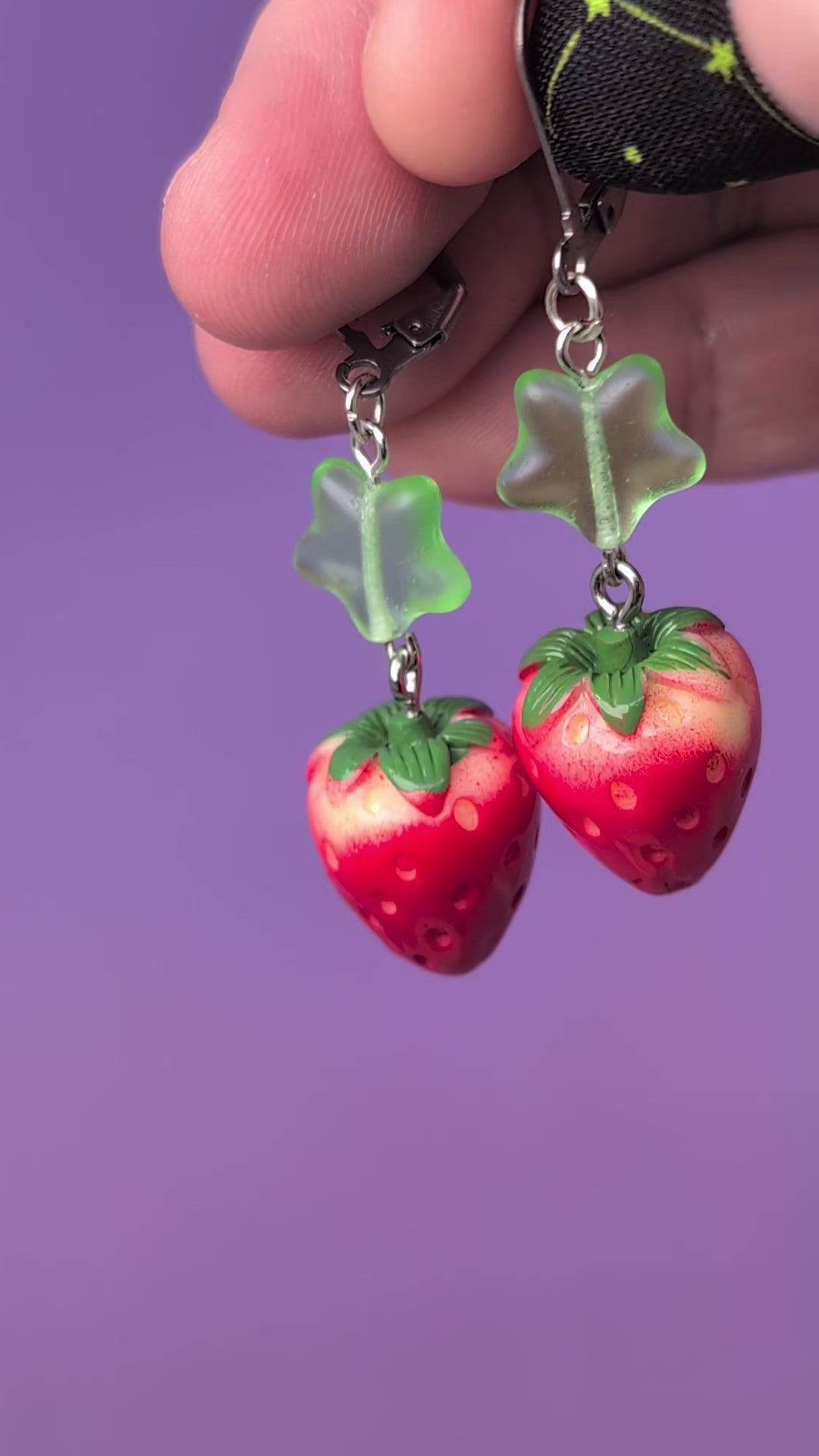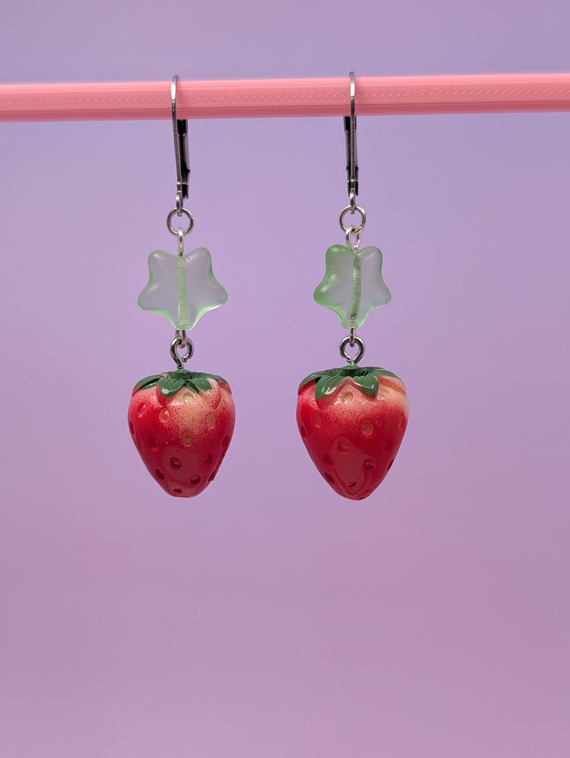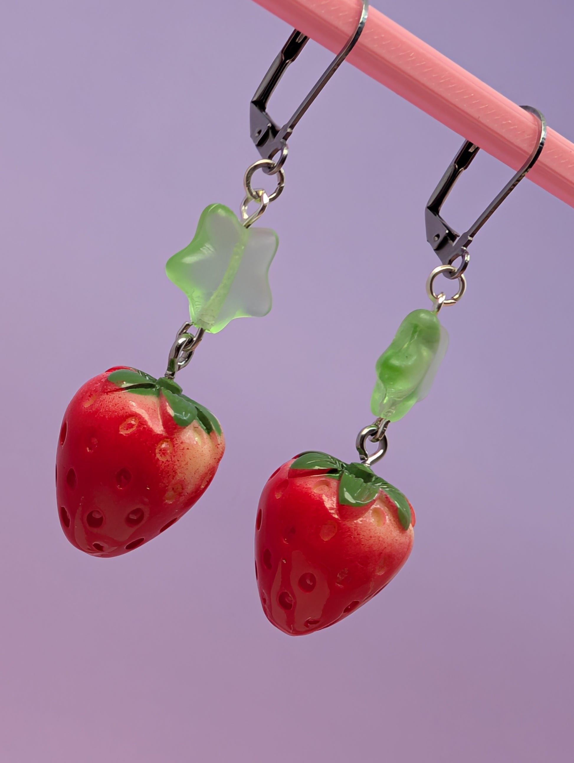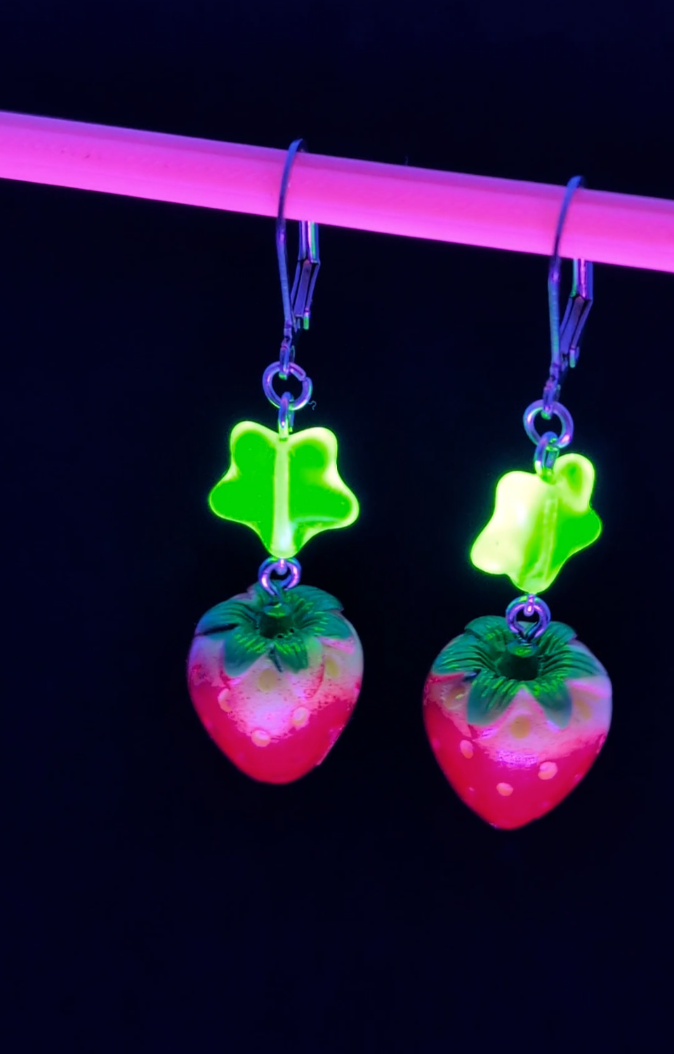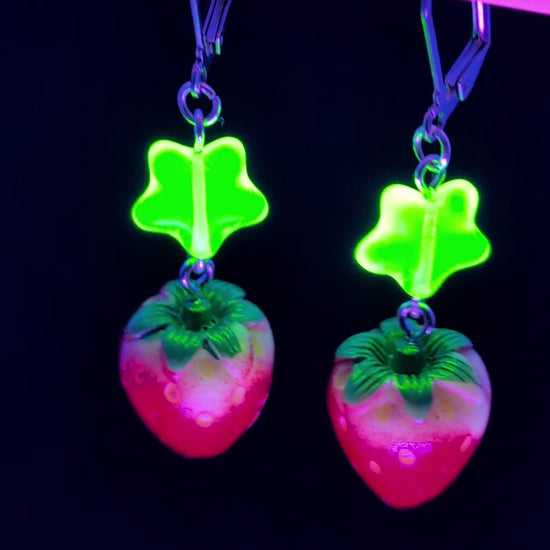 These are UV reactive! These are stainless steel, hypoallergenic lever back earrings featuring vintage uranium glass stars and vintage acrylic strawberry charms.