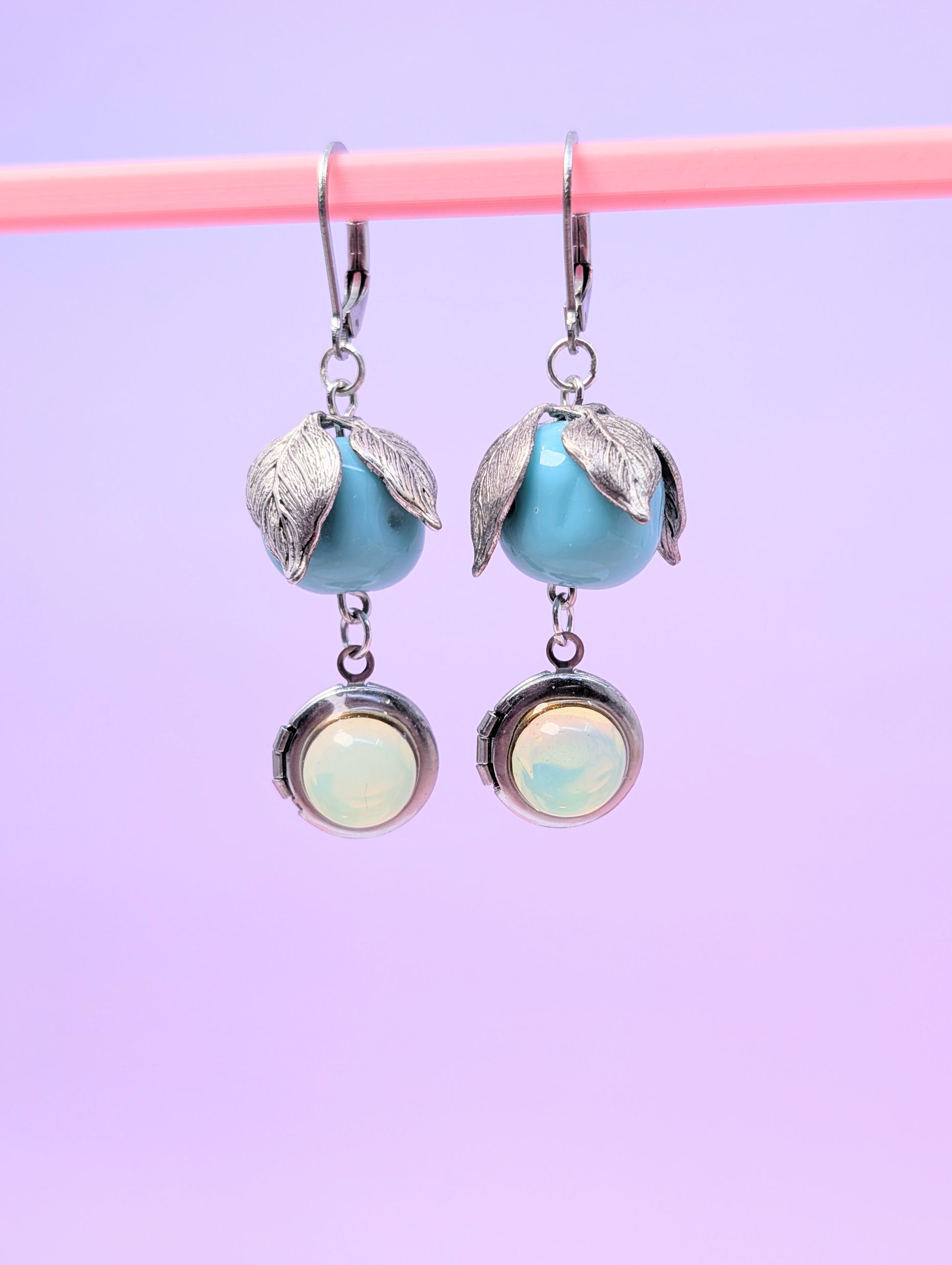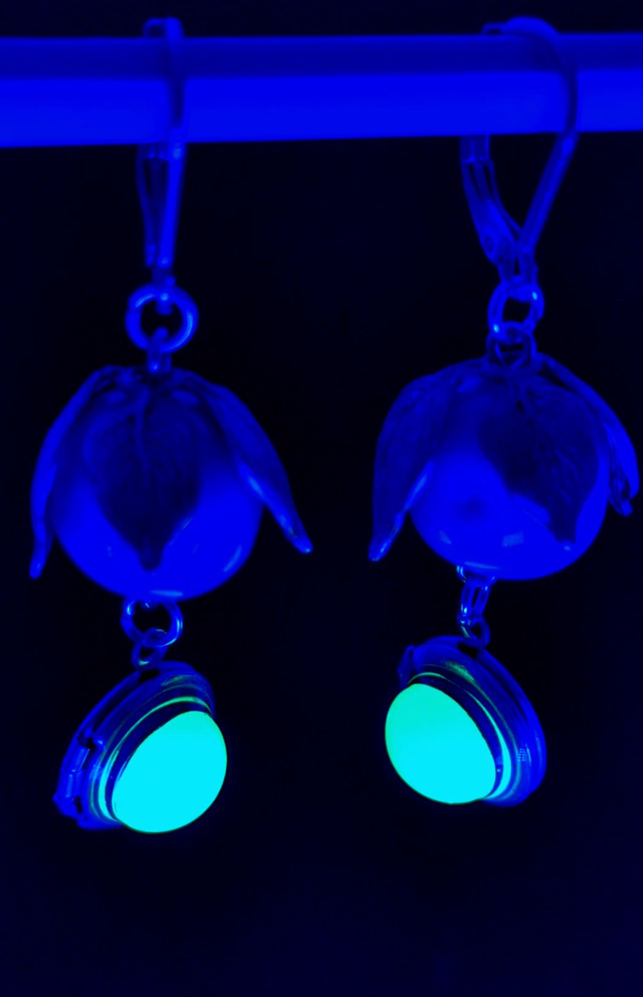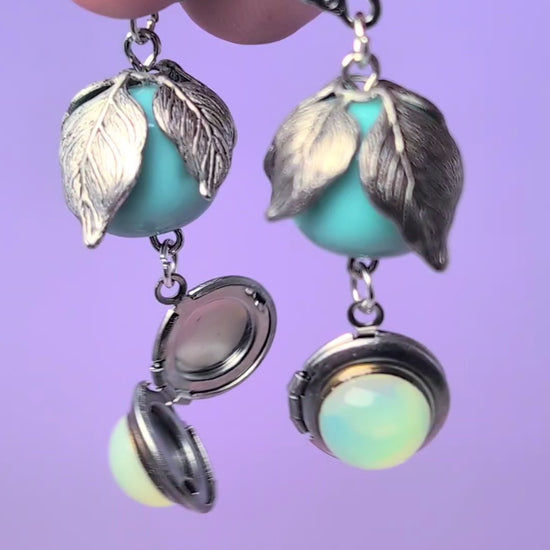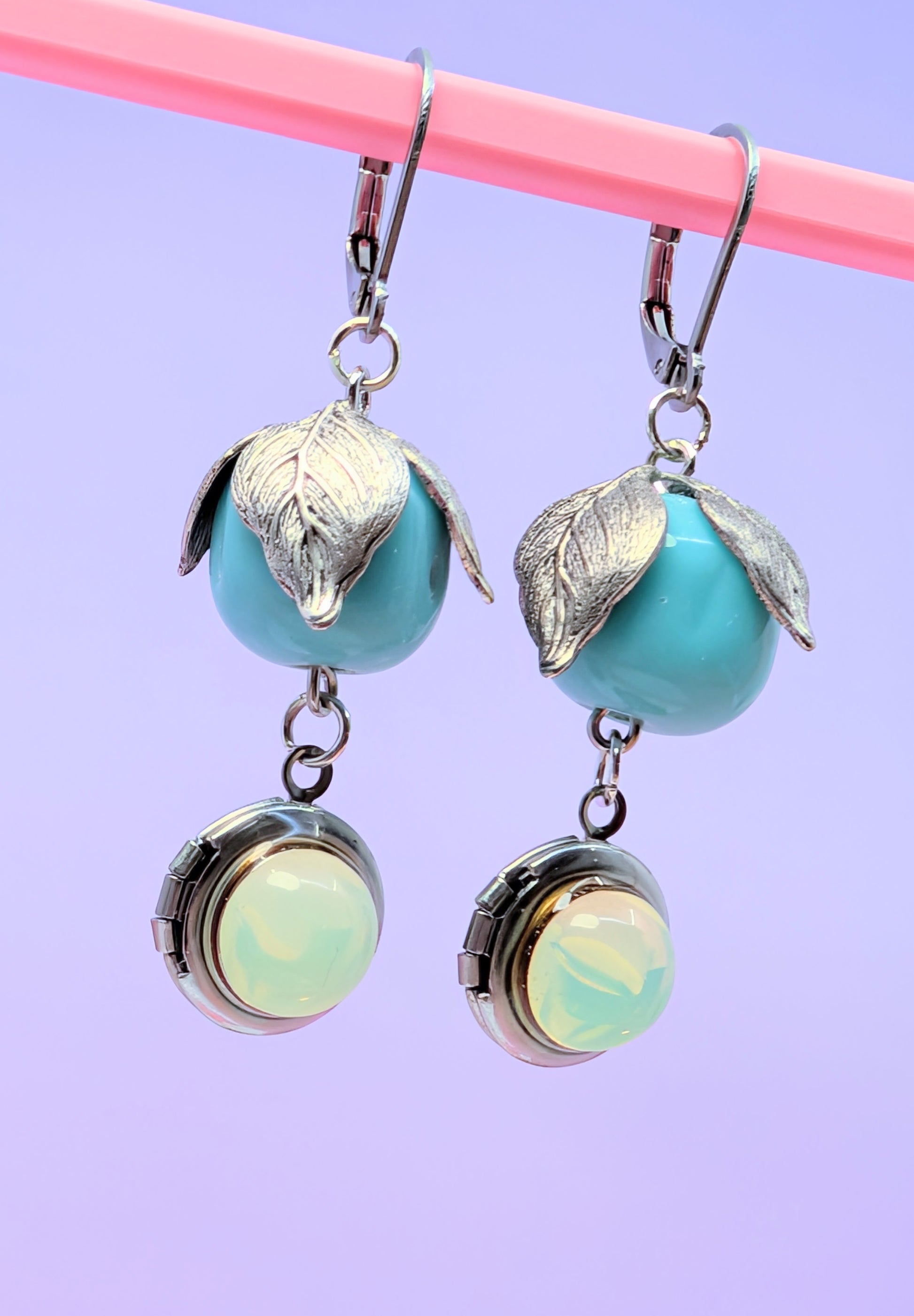 These are UV reactive! These are stainless steel, hypoallergenic lever back earrings feature adorable vintage pressed leaves topping cute vintage teal lampwork beads, round silver lockets topped with uranium glass cabochons.