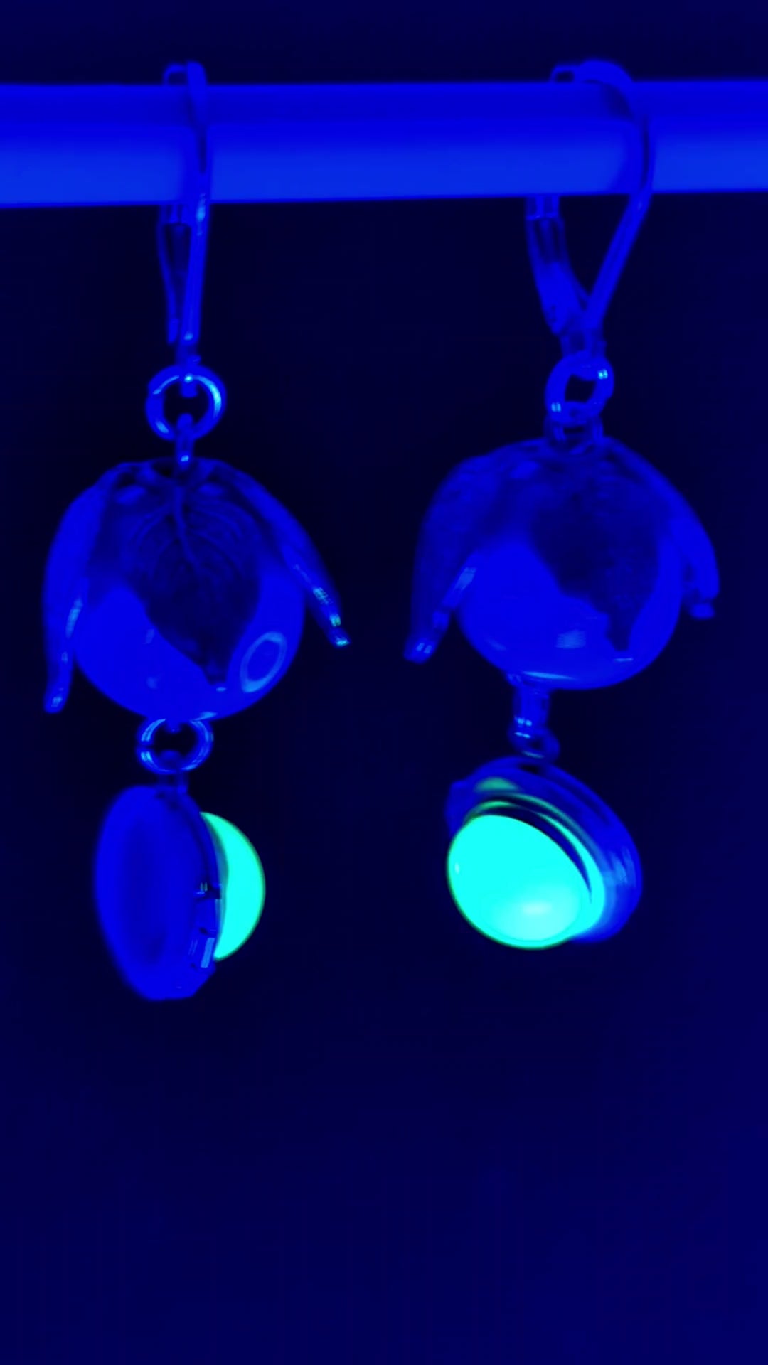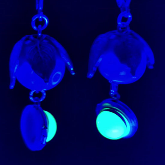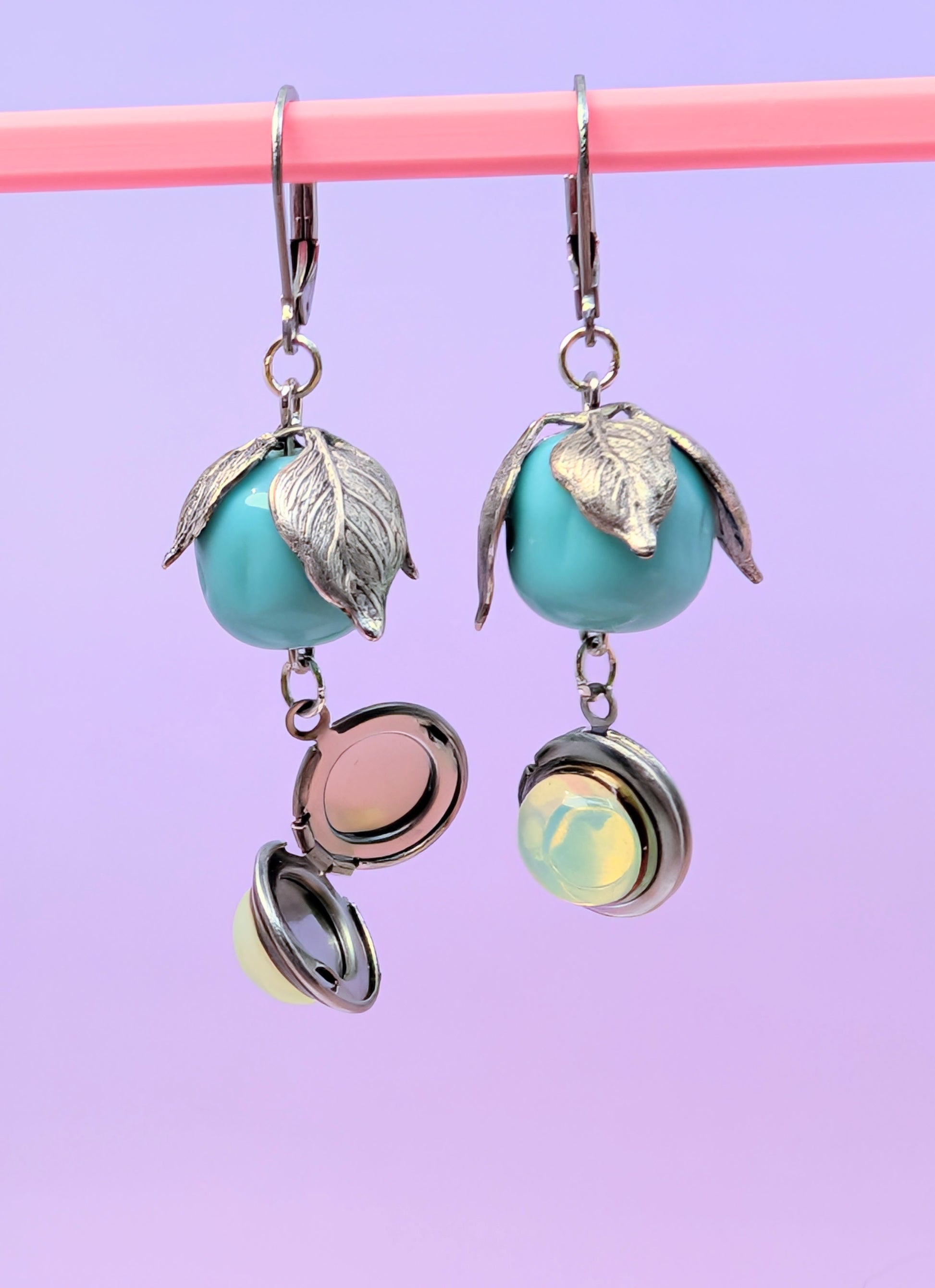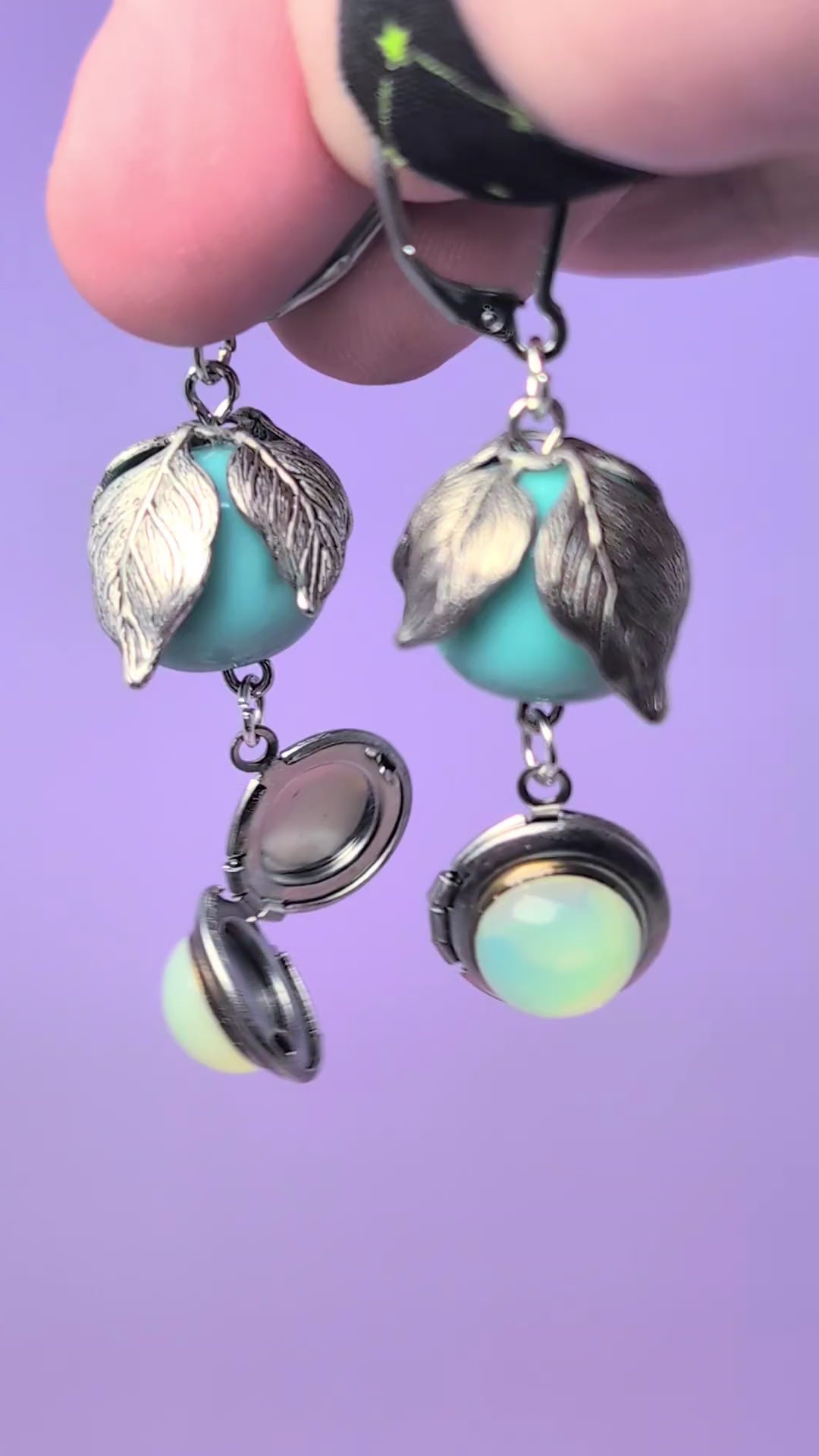 These are UV reactive! These are stainless steel, hypoallergenic lever back earrings feature adorable vintage pressed leaves topping cute vintage teal lampwork beads, round silver lockets topped with uranium glass cabochons.