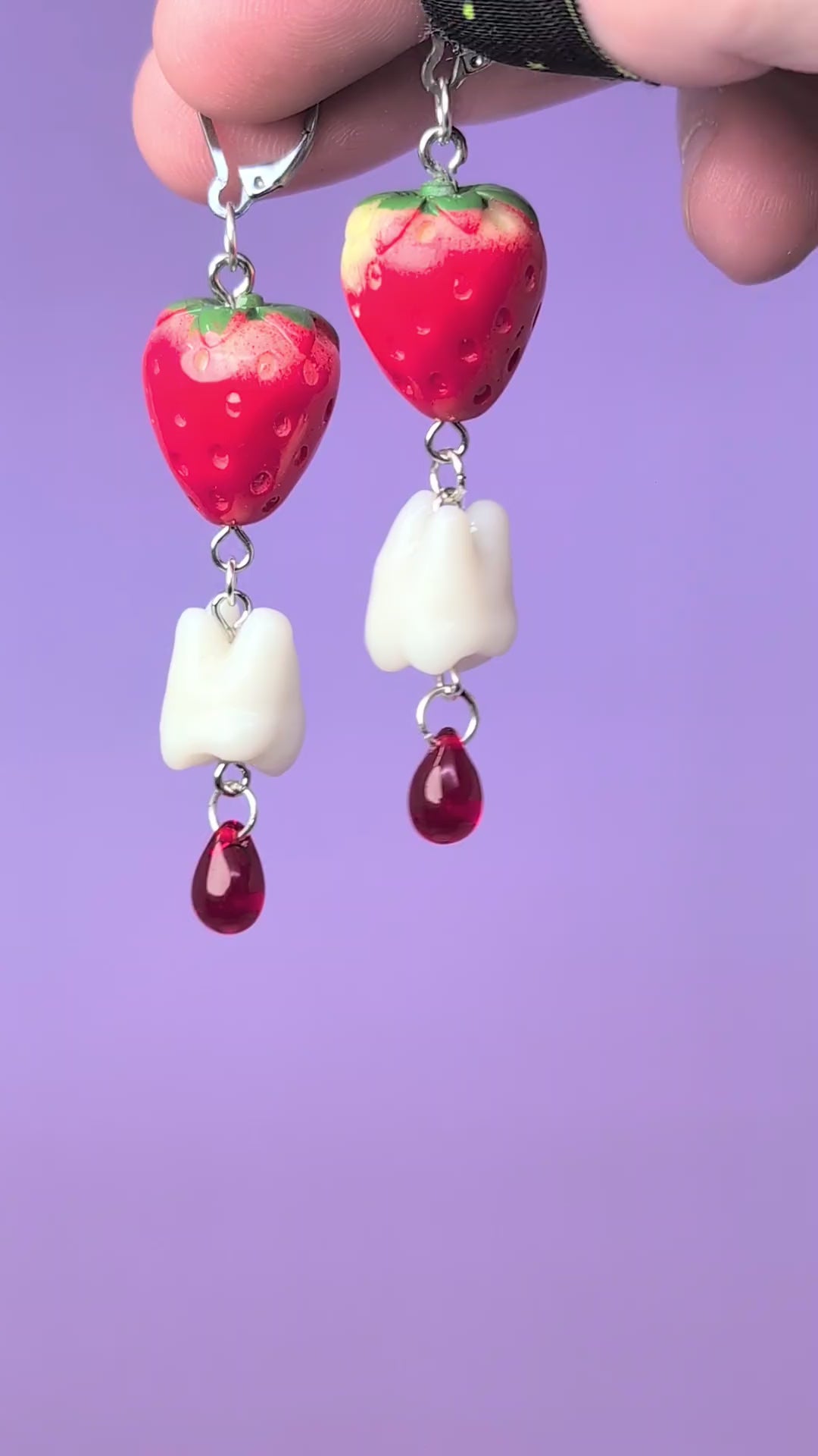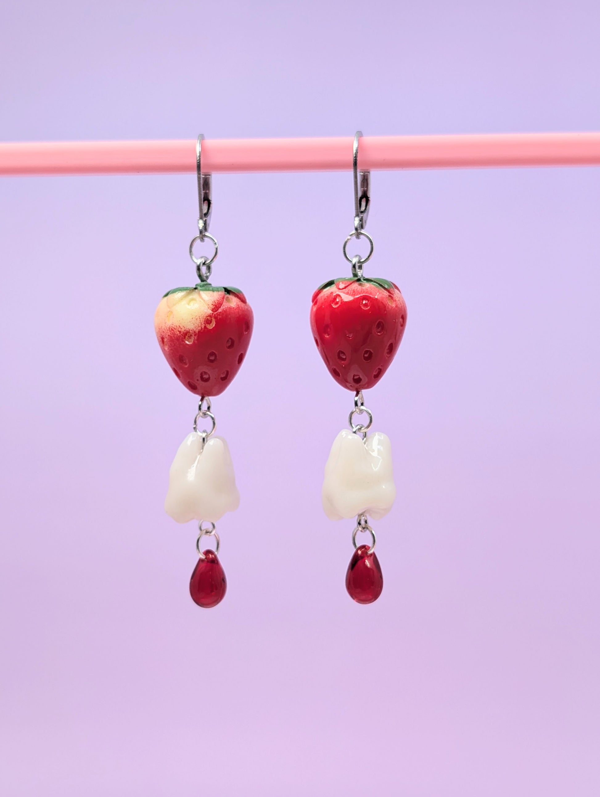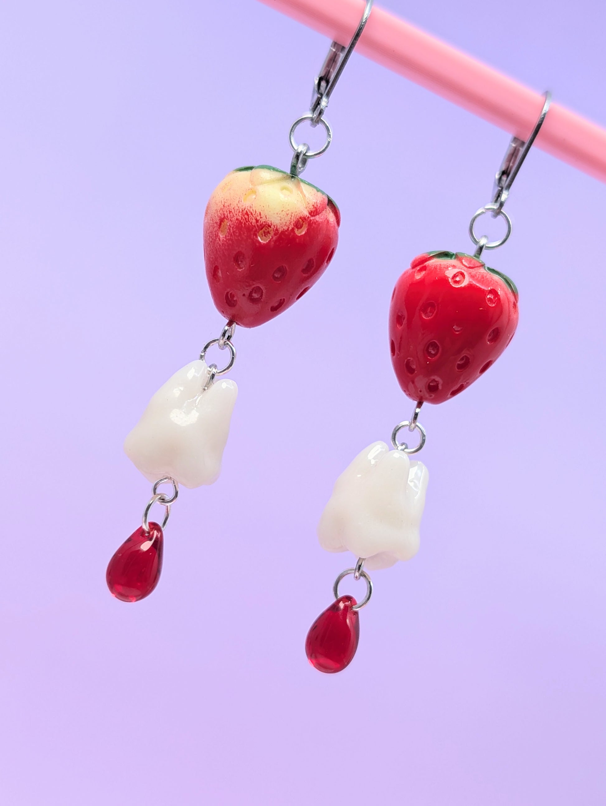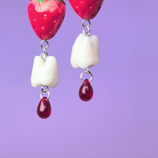 These are UV reactive! These are stainless steel, hypoallergenic lever back earrings feature adorable vintage acrylic strawberry beads, 3D printed, in our studio, resin dipped human molars, and ruby red glass drops.