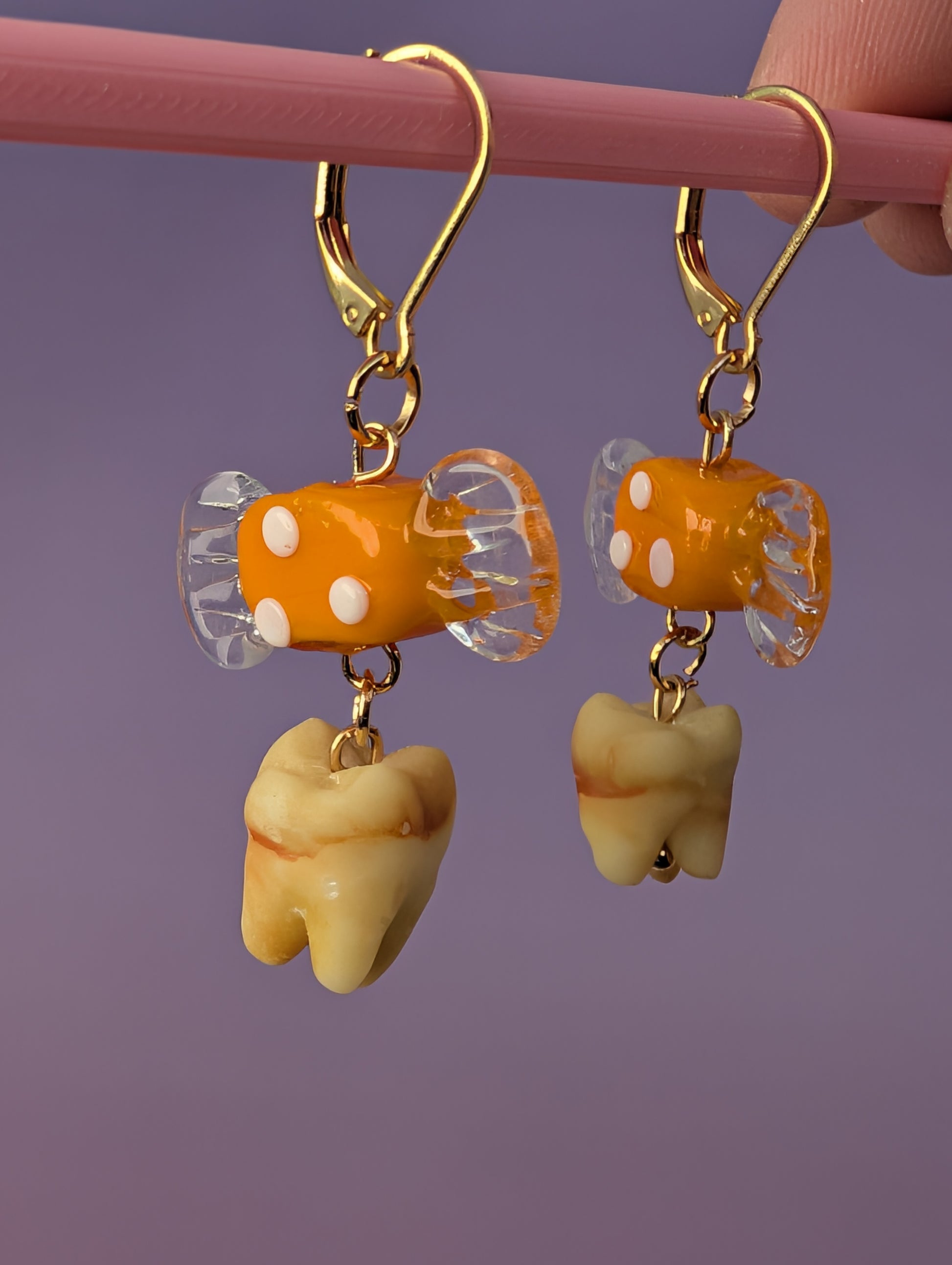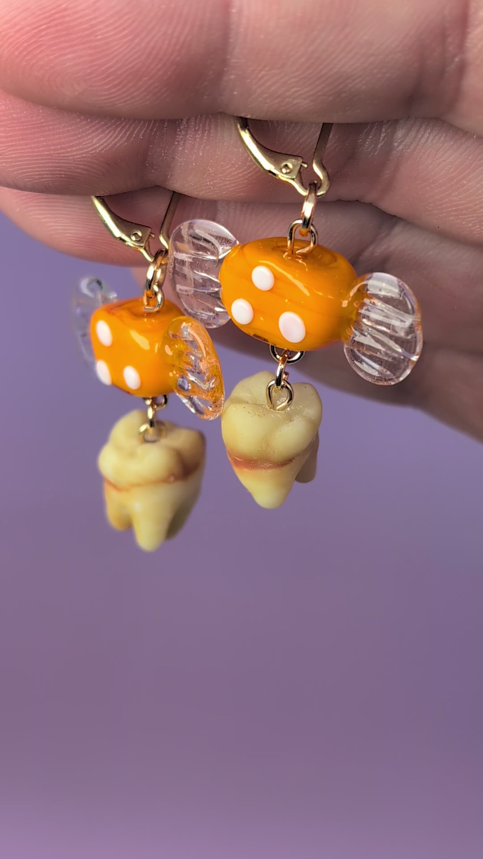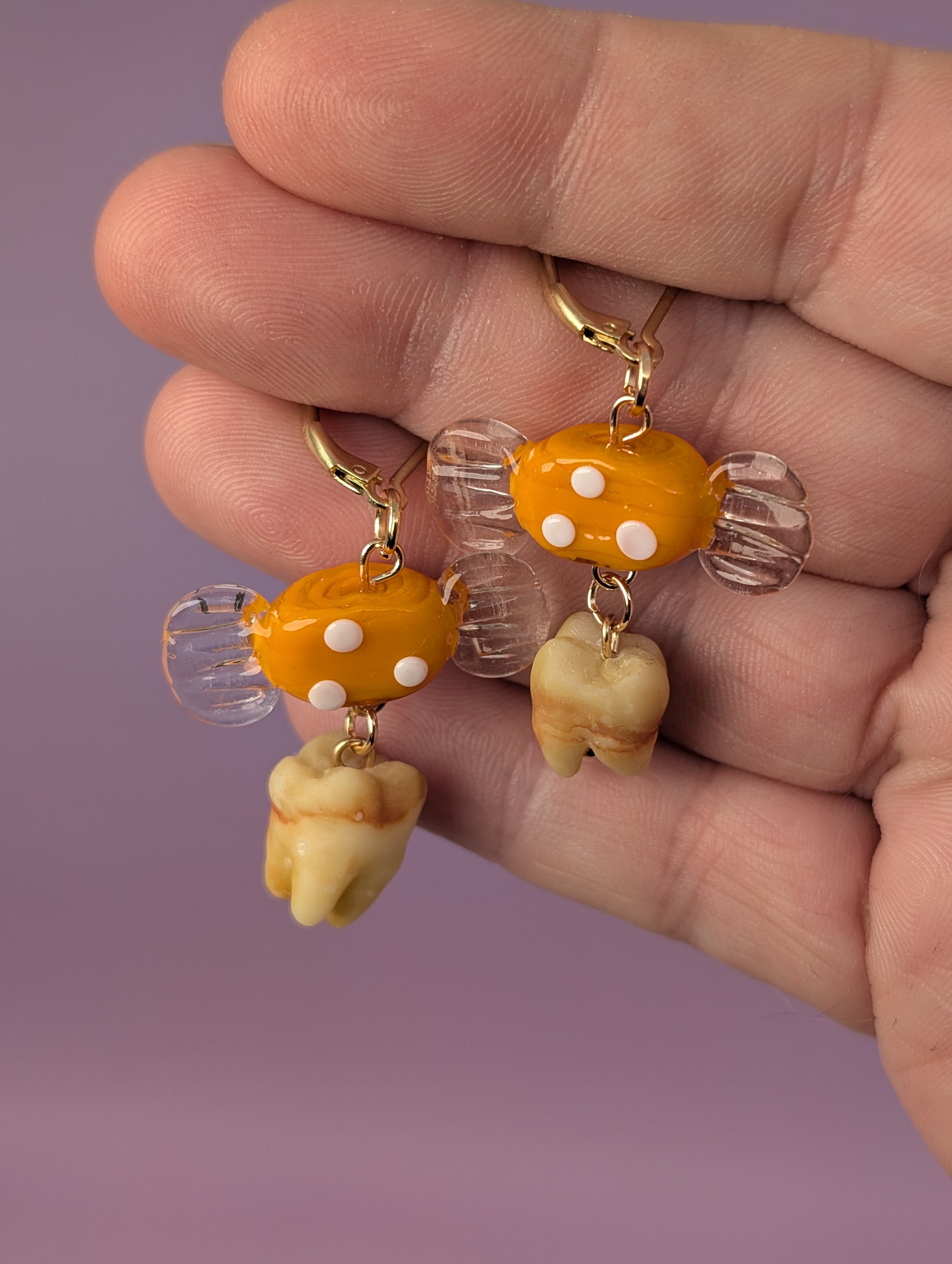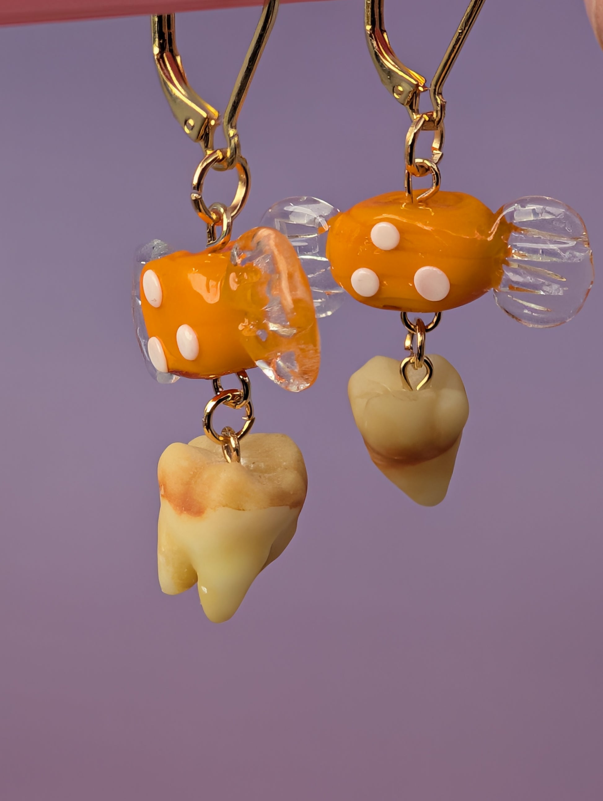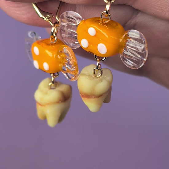 Adorable orange glass wrapped candies holding onto two absolutely foul human molars - 3D printed and hand painted. With 24k gold plated leverback earring clasps.