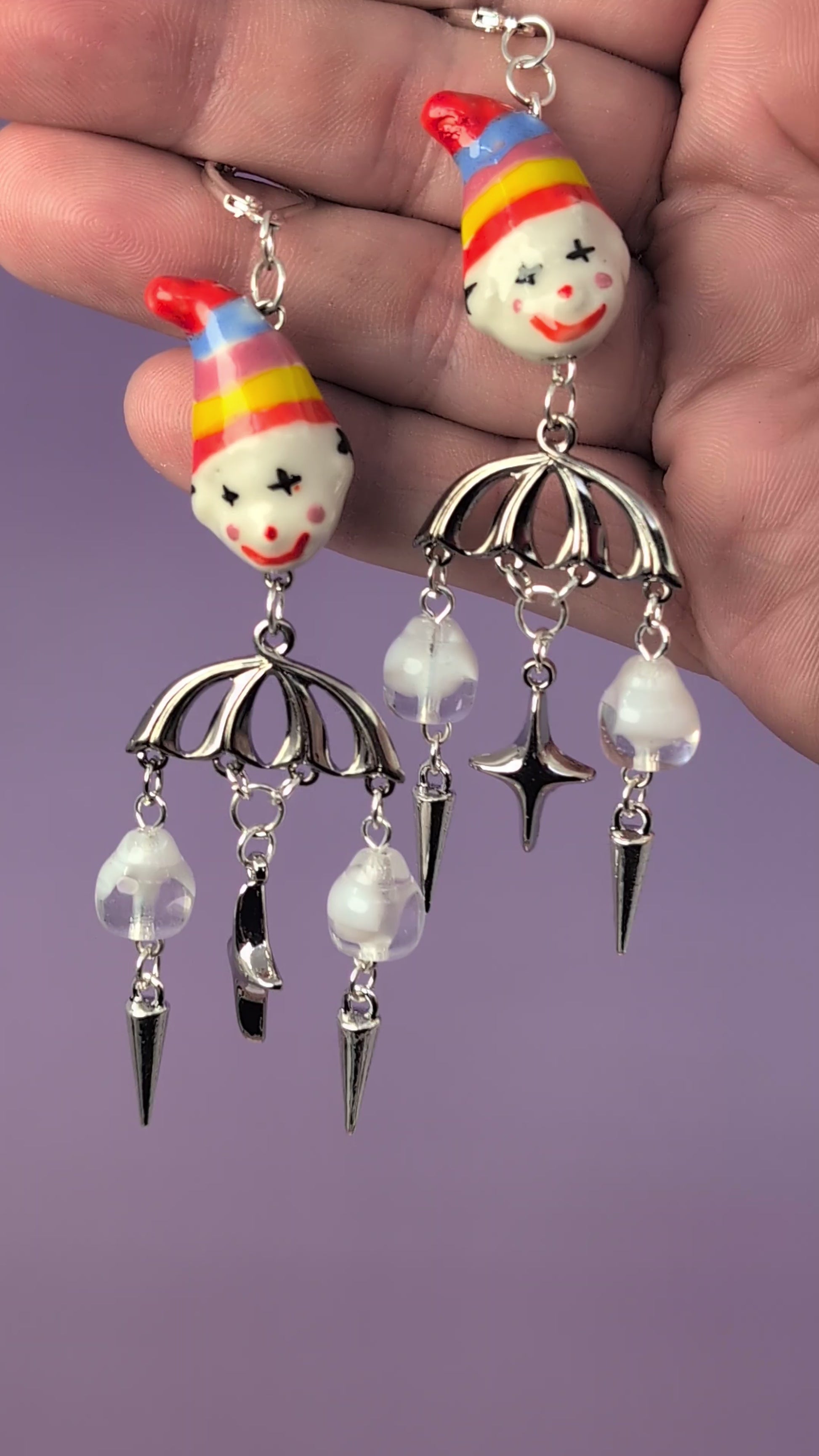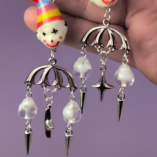 Two funky orange glass clowns with silver connectors, vintage german glass clouds, and silver stars and spikes. Silver sterling leverback earring clasps.