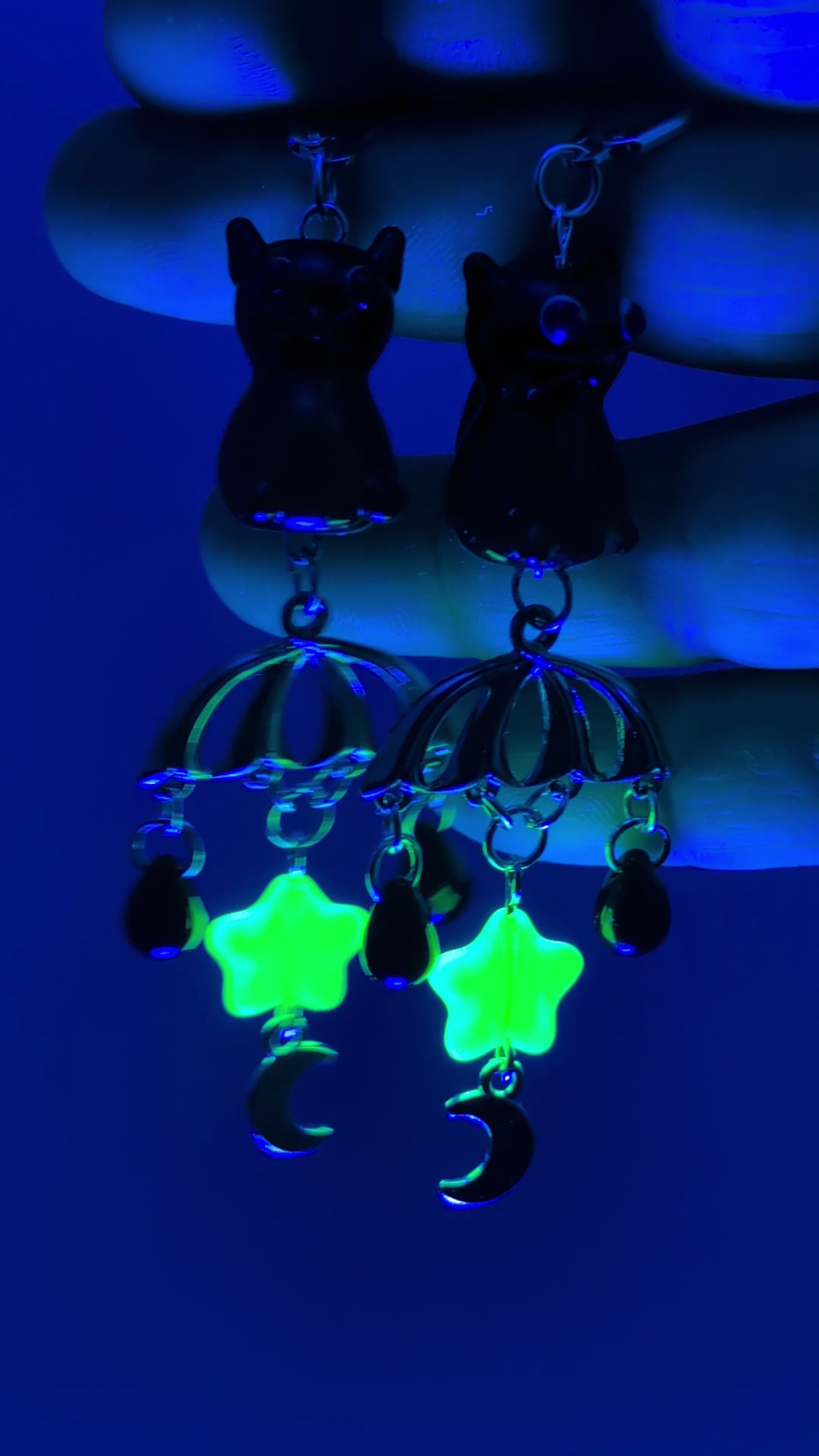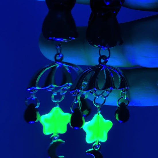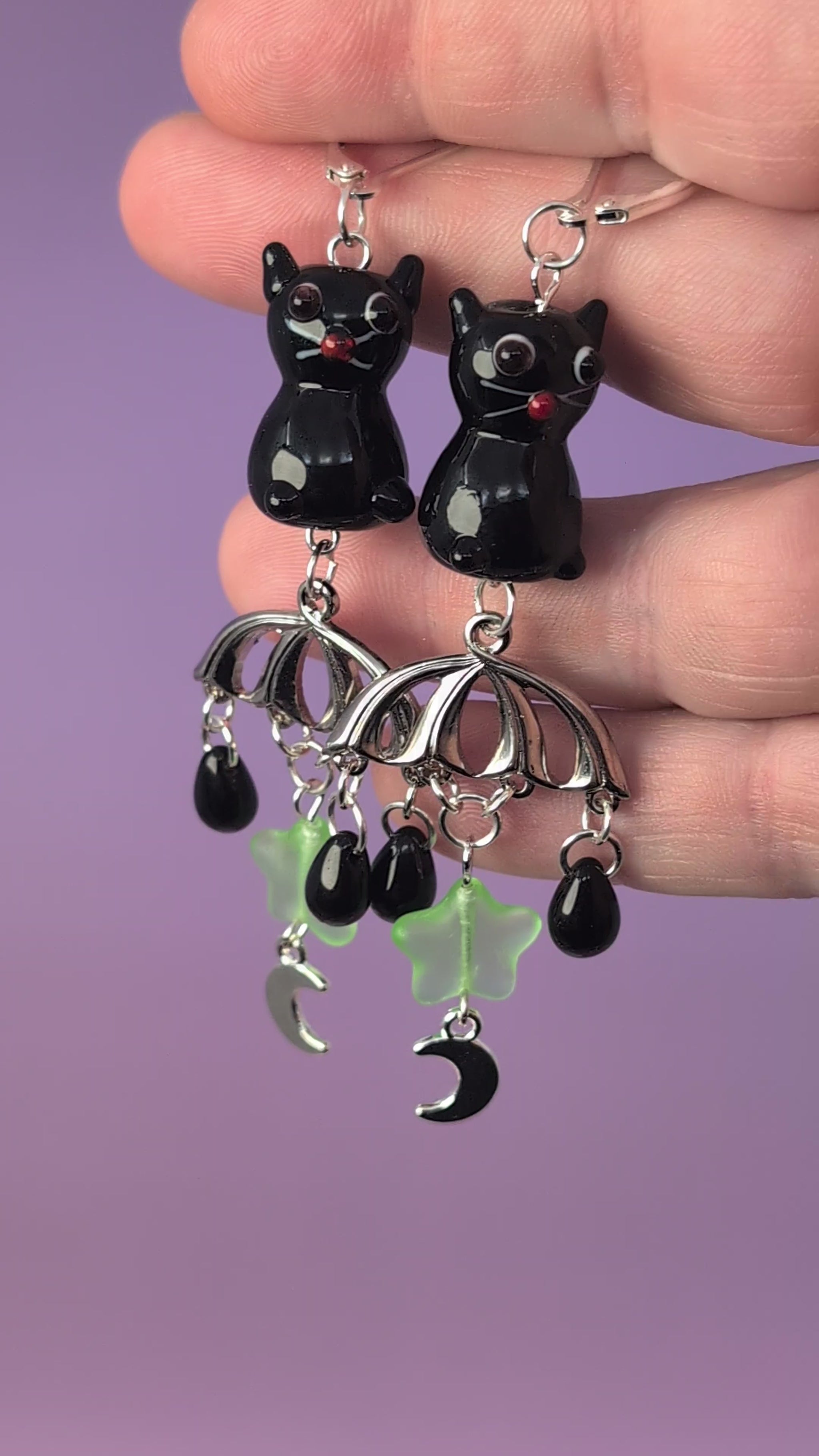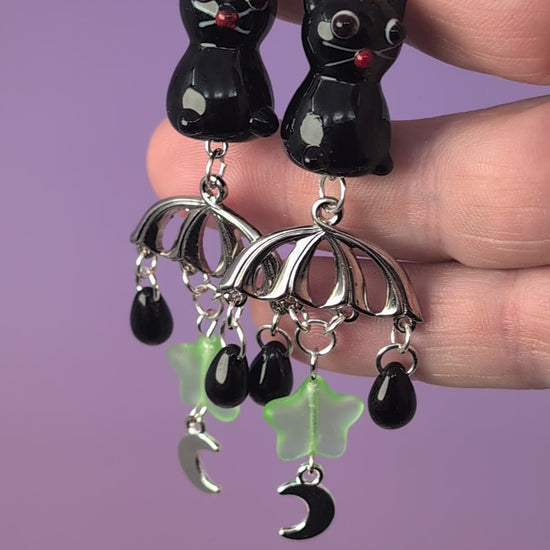 Two magical black glass kitties, silver connectors, vintage uranium stars that glow under UV, black glass teardrops, and silver crescent moons. With sterling silver leverback earring clasps.
