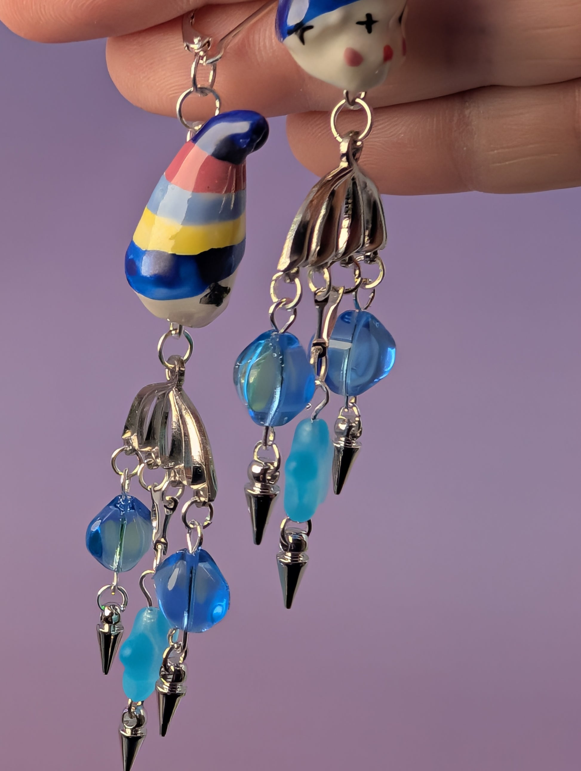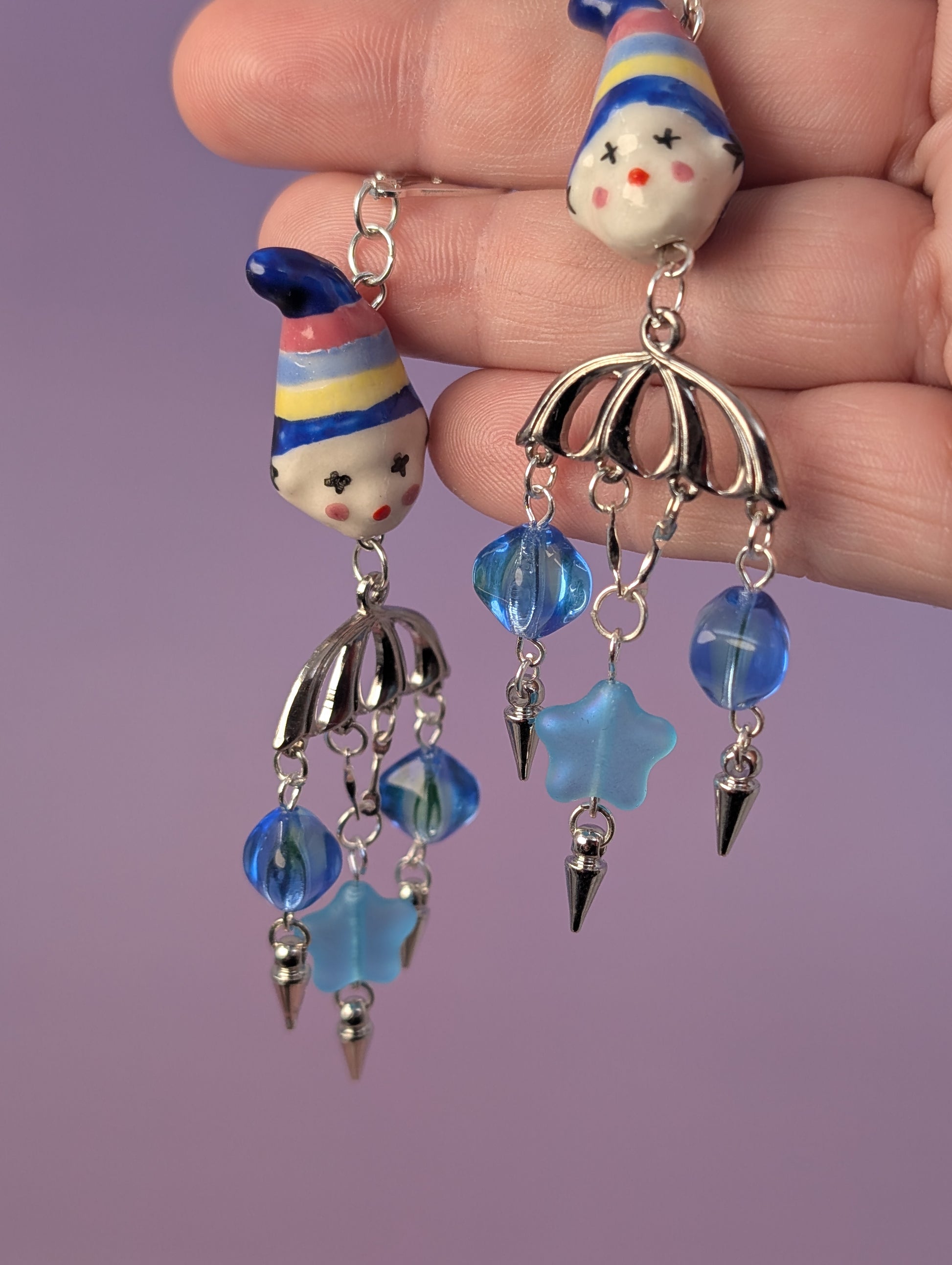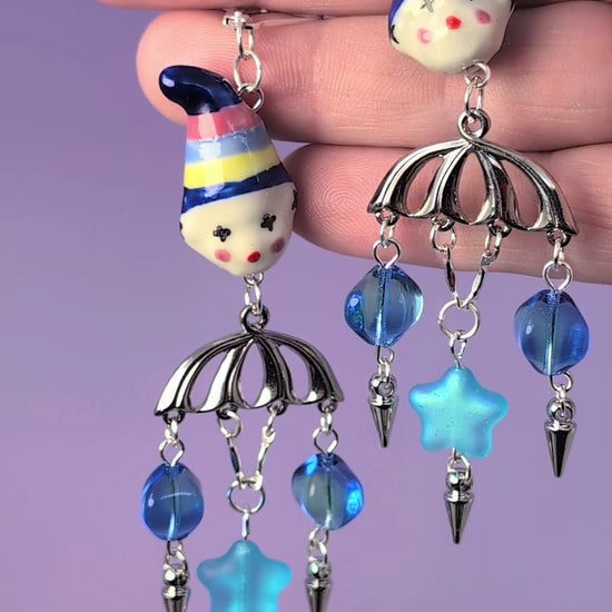 Two moody blue glass clowns, silver bodies, 90s vintage blue glass stars, uranium glass beads that glow under UV, silver spikes, and sterling silver leverback earring clasps.