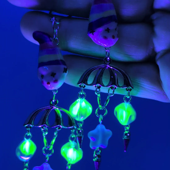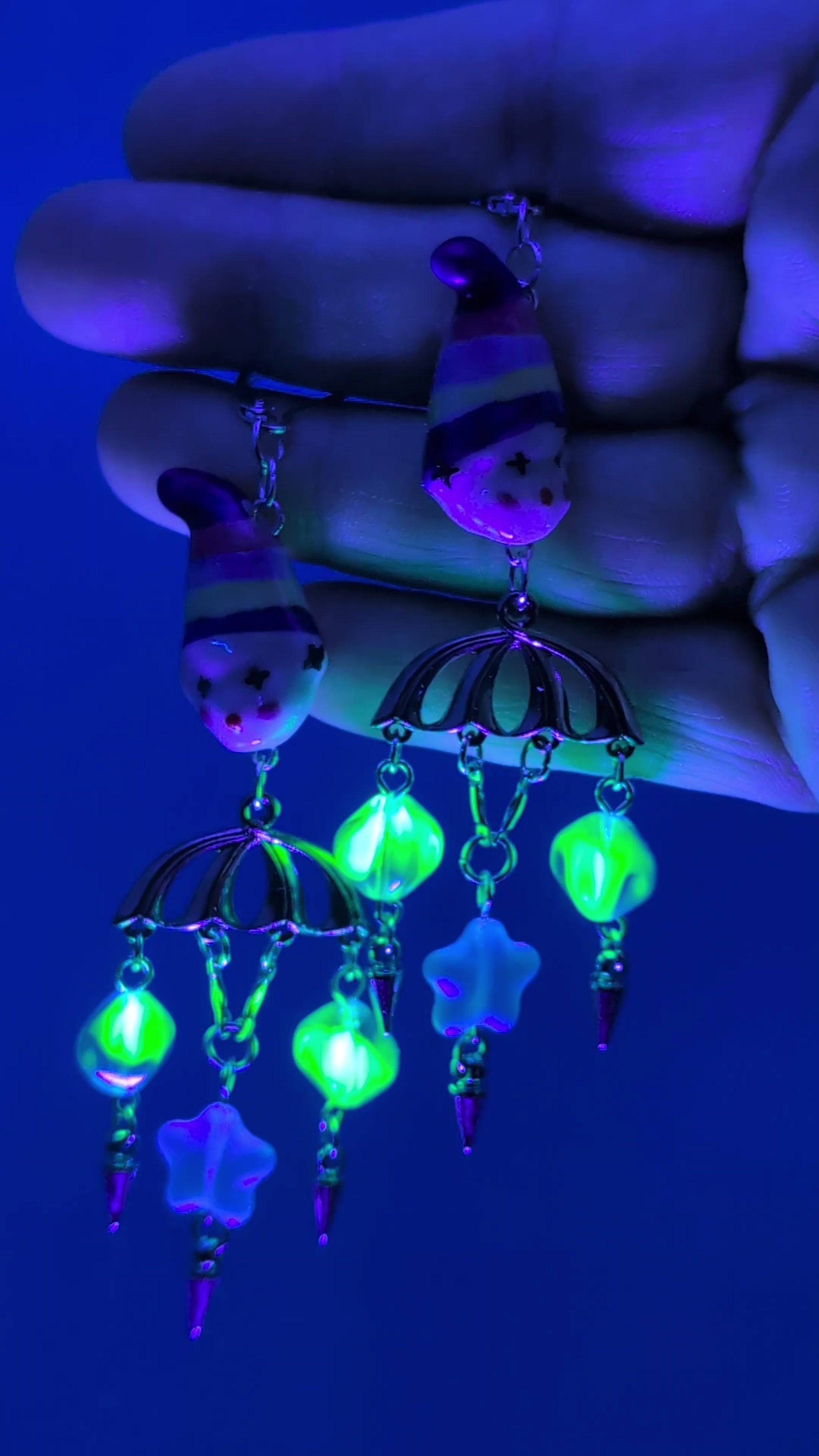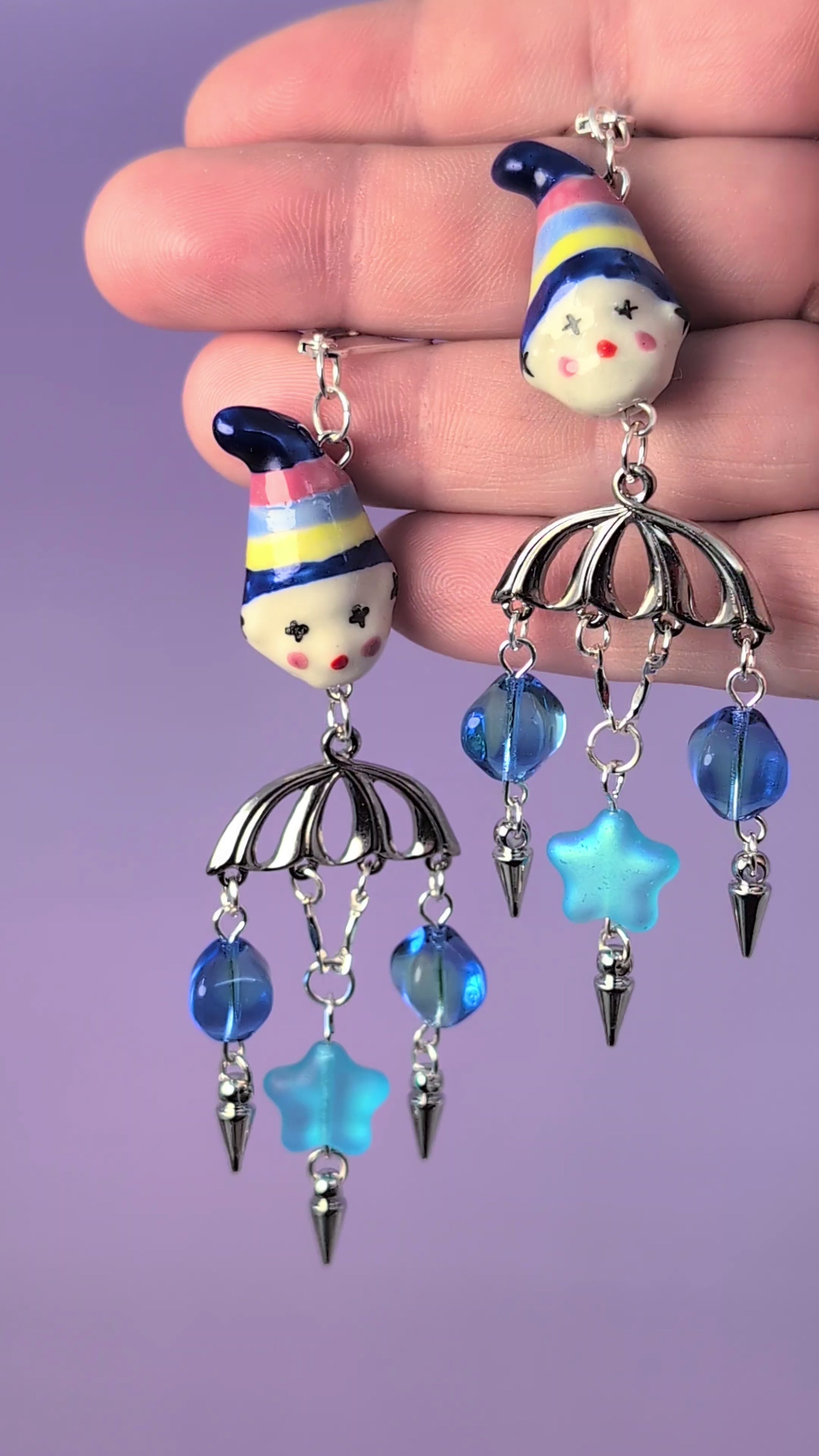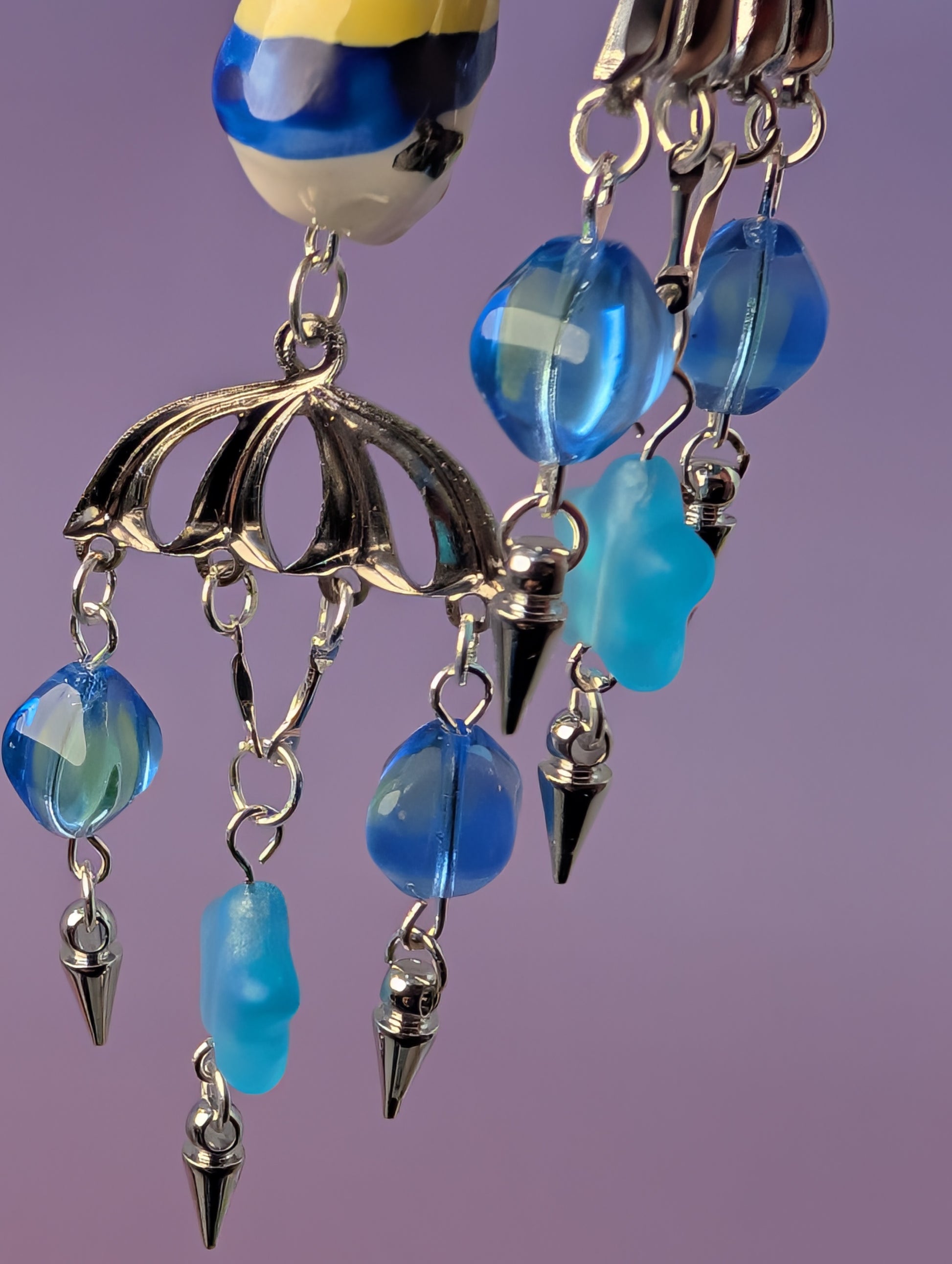 Two moody blue glass clowns, silver bodies, 90s vintage blue glass stars, uranium glass beads that glow under UV, silver spikes, and sterling silver leverback earring clasps.
