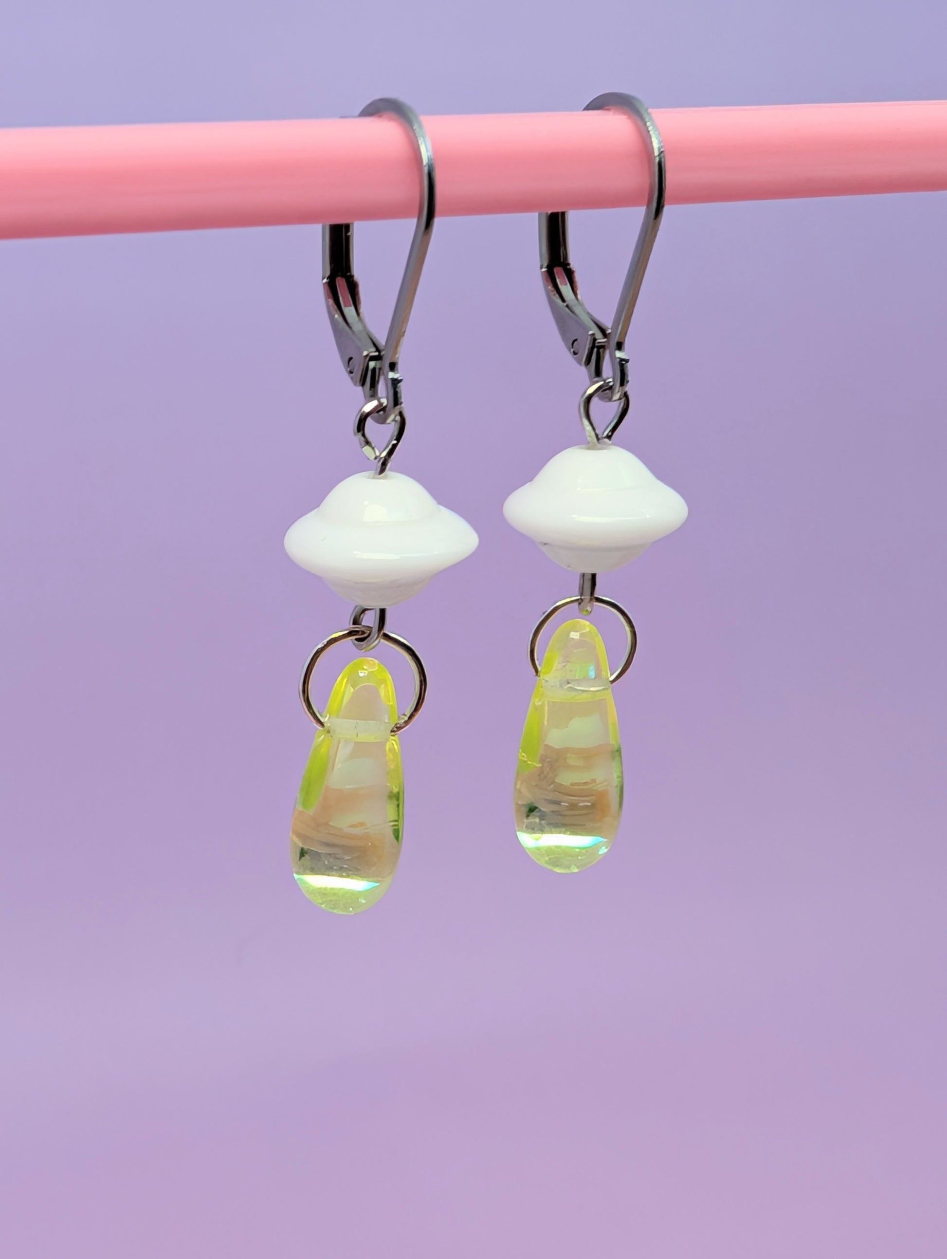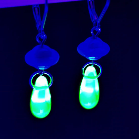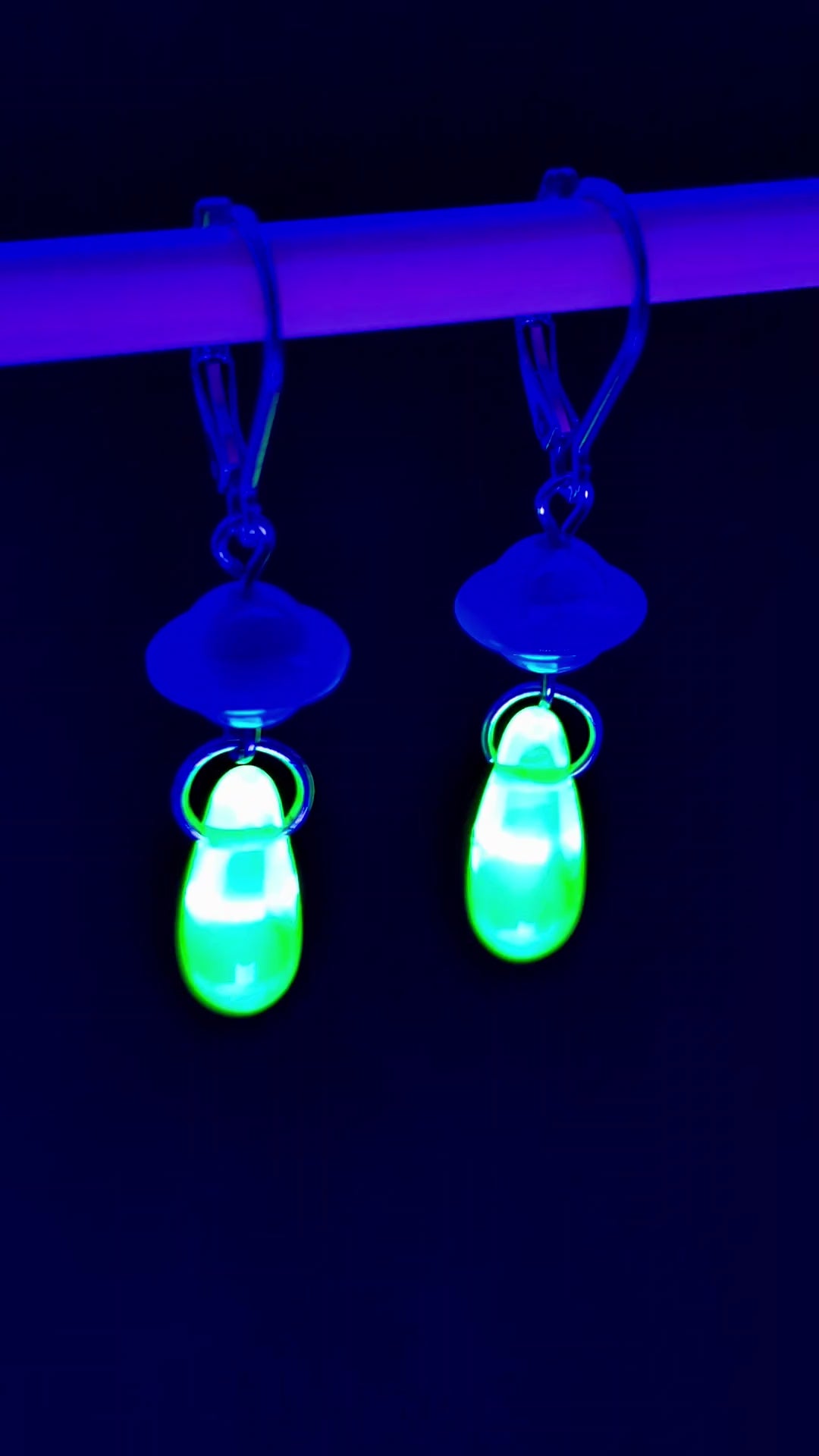 These are UV reactive! These are stainless steel, hypoallergenic lever back earrings featuring vintage 60s glass Saturn beads, and vintage Vaseline/uranium glass teardrops with iridescent backs.