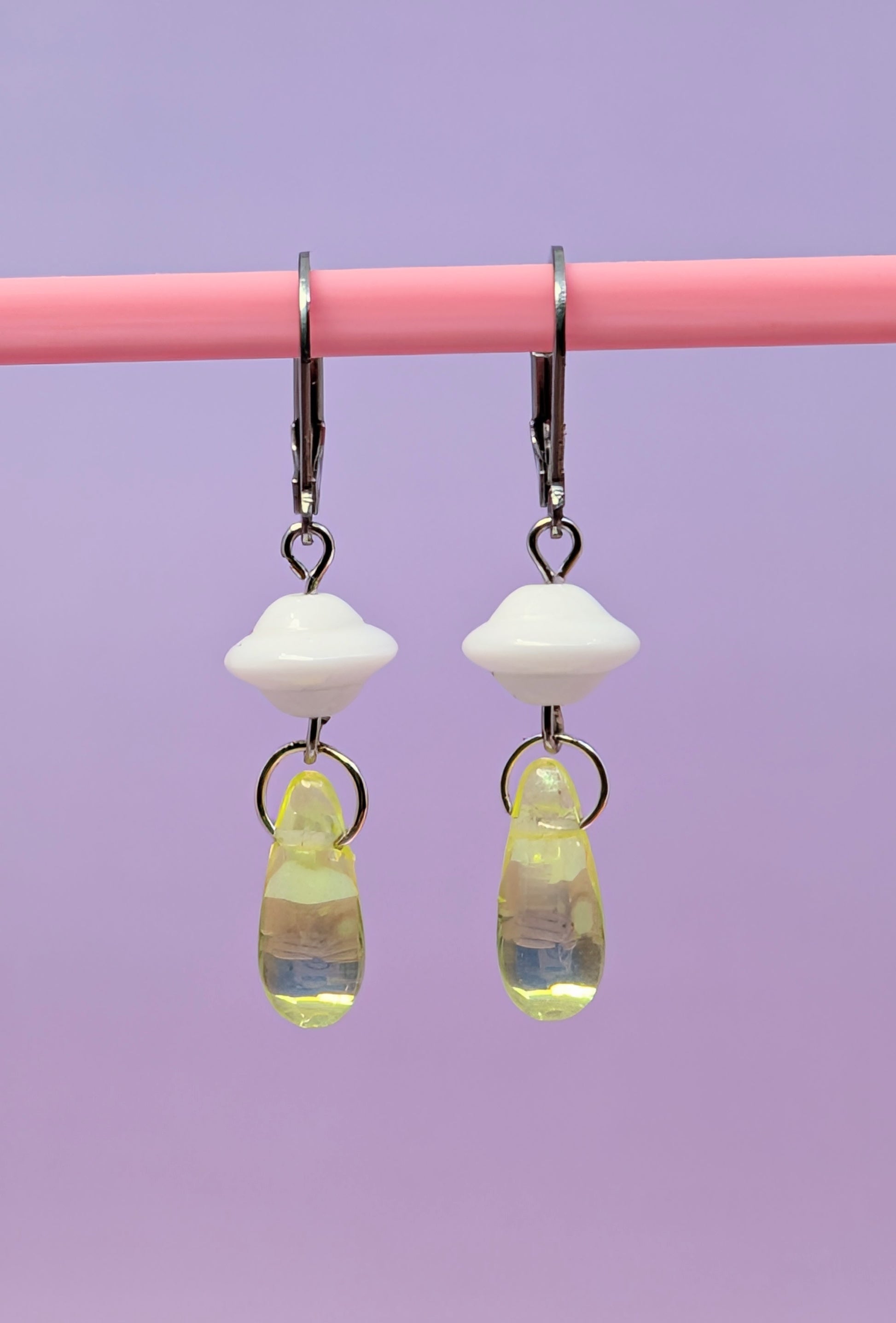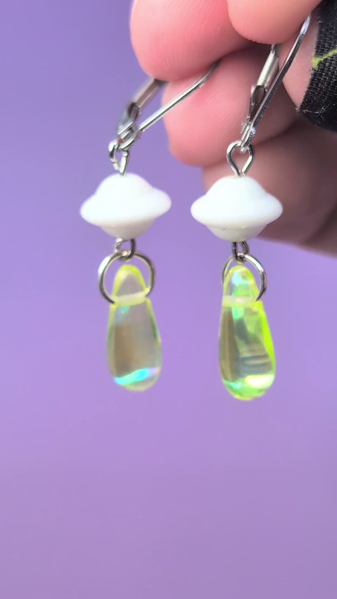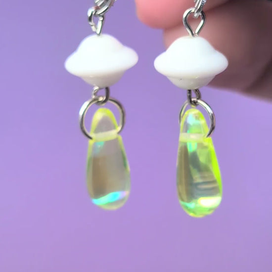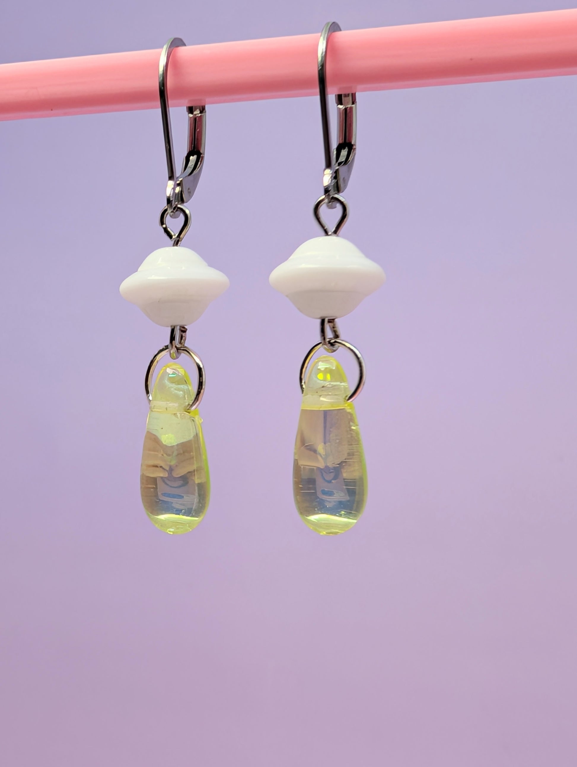These are UV reactive! These are stainless steel, hypoallergenic lever back earrings featuring vintage 60s glass Saturn beads, and vintage Vaseline/uranium glass teardrops with iridescent backs.