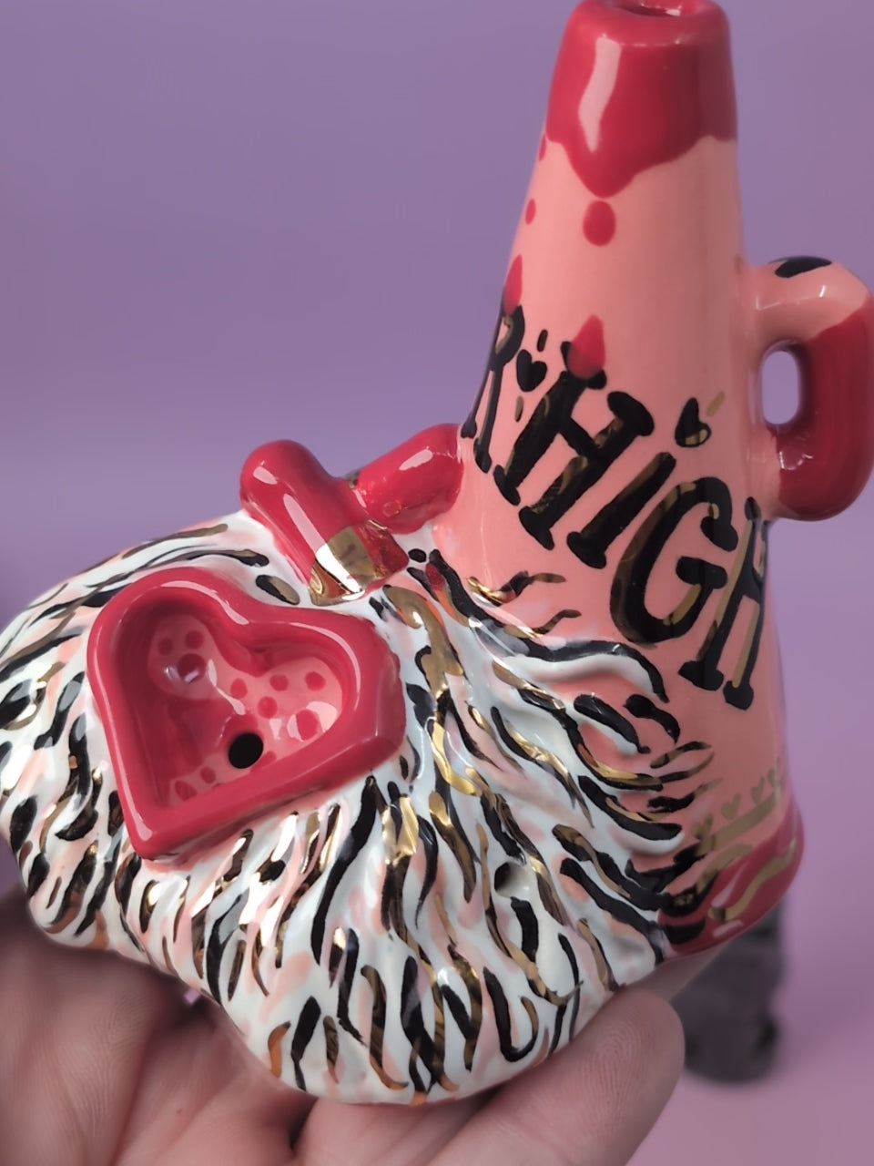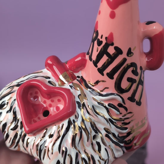 Welcome to Horror High, where the cheer squad tokes between exorcisms. Each pipe is handmade, glazed in soft pinks with flashes of gold, and is finished with the perfect balance of gore and bad-girl charm. Think pom-poms, pep rallies, and a little touch of hellfire.