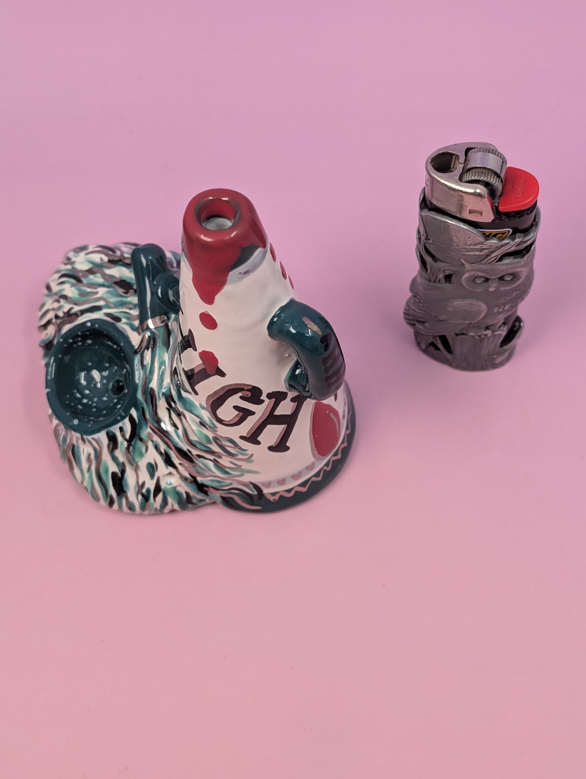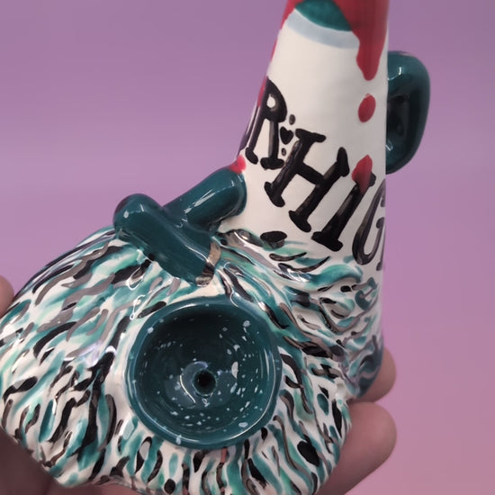 Welcome to Horror High, where the cheer squad tokes between exorcisms. Each pipe is handmade, glazed in bright teals with whisps of platinum gold, and is finished with the perfect balance of gore and bad-girl charm. Think pom-poms, pep rallies, and a little touch of hellfire