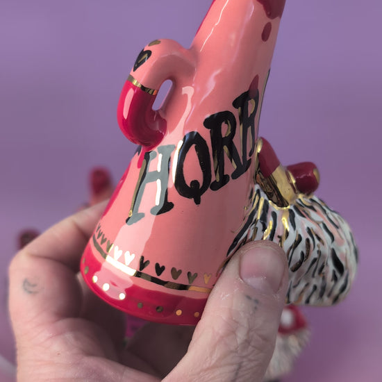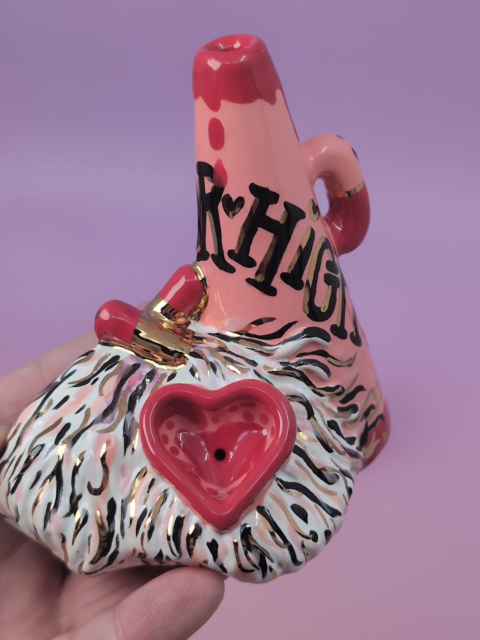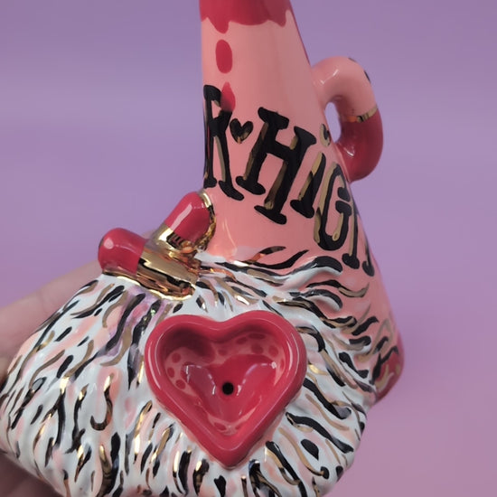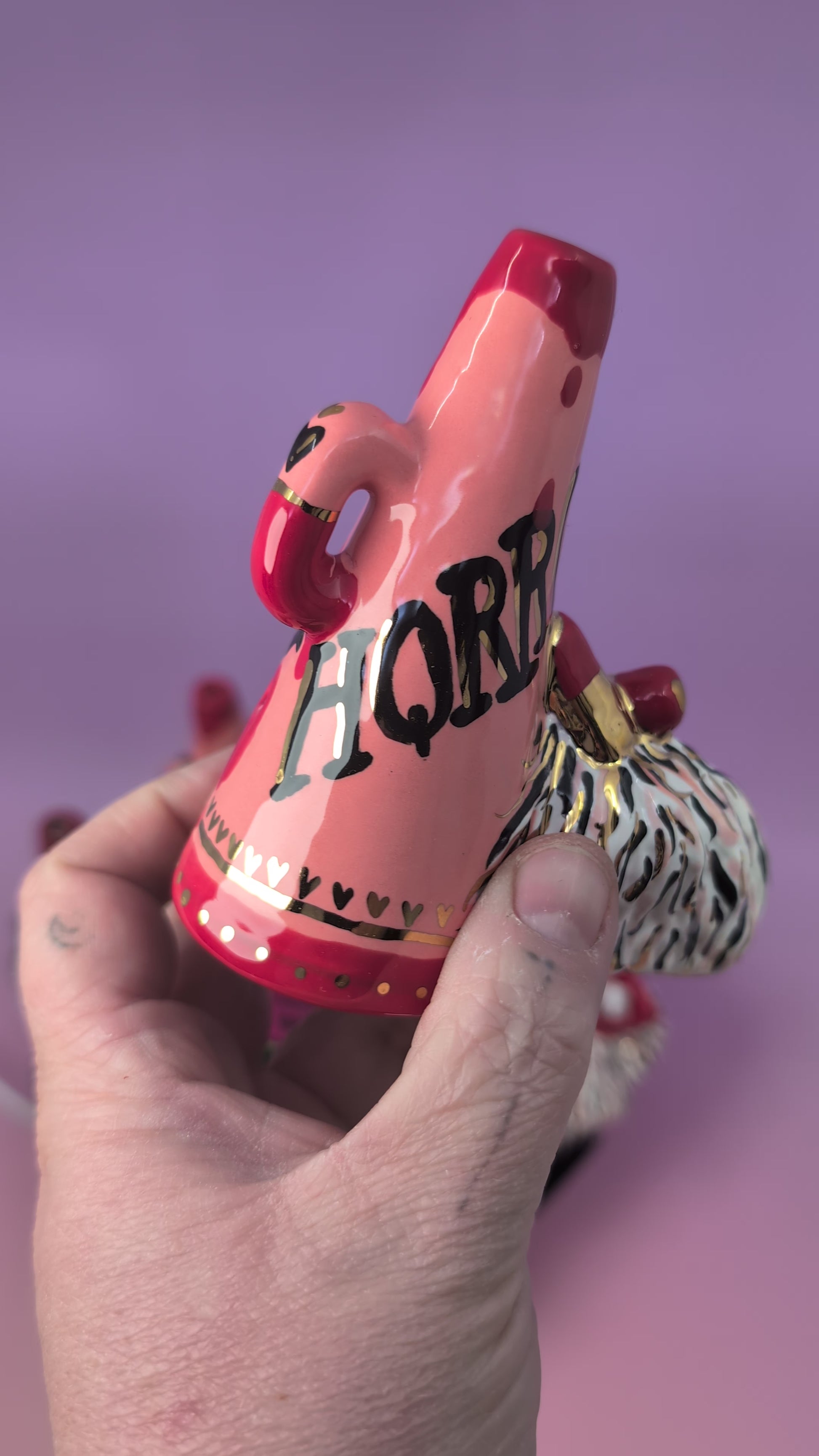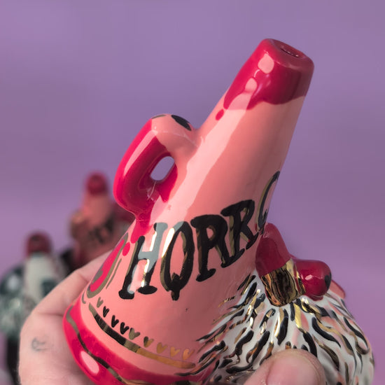 Welcome to Horror High, where the cheer squad tokes between exorcisms. Each pipe is handmade, glazed in soft pinks with flashes of gold, and is finished with the perfect balance of gore and bad-girl charm. Think pom-poms, pep rallies, and a little touch of hellfire.