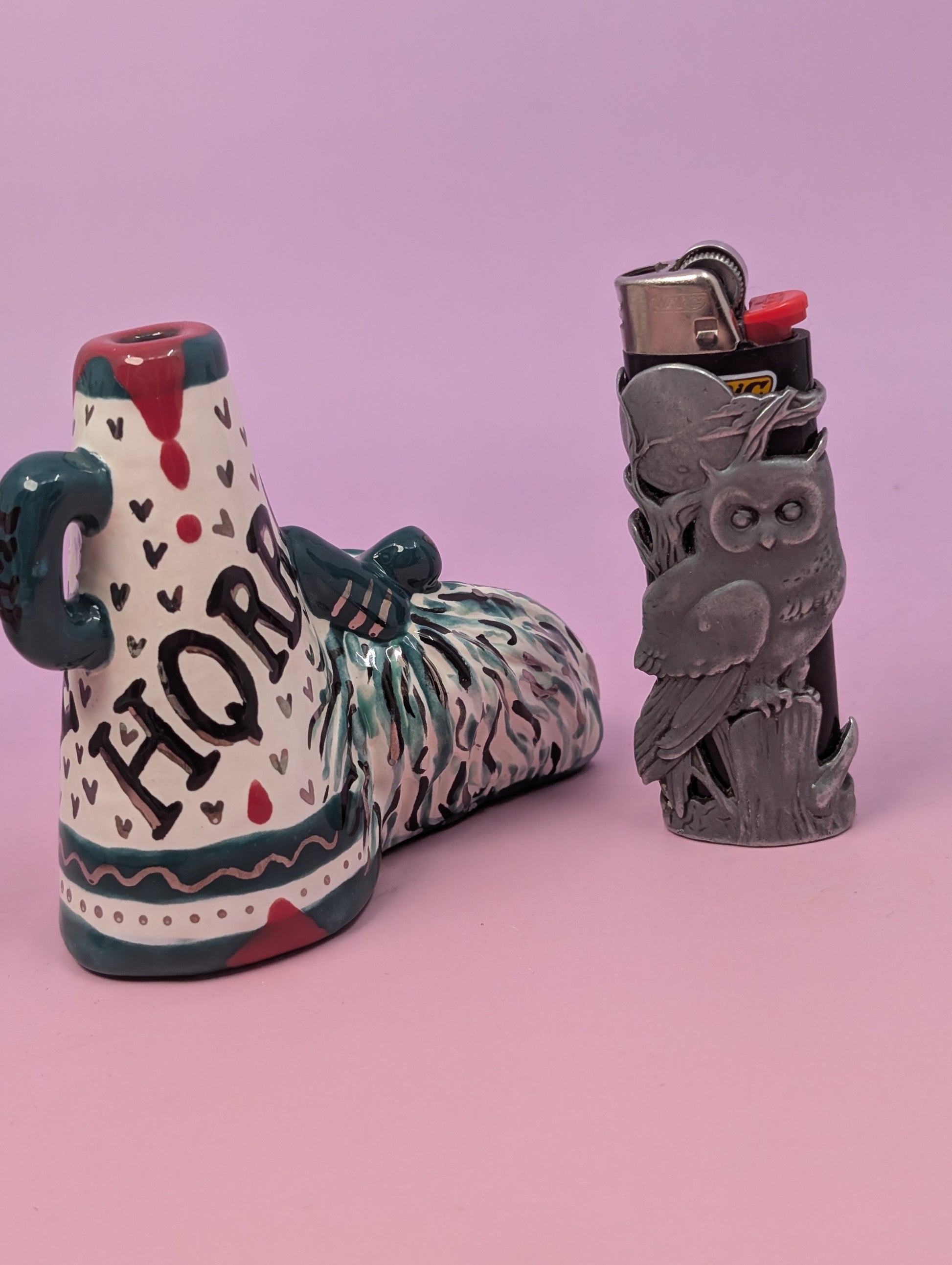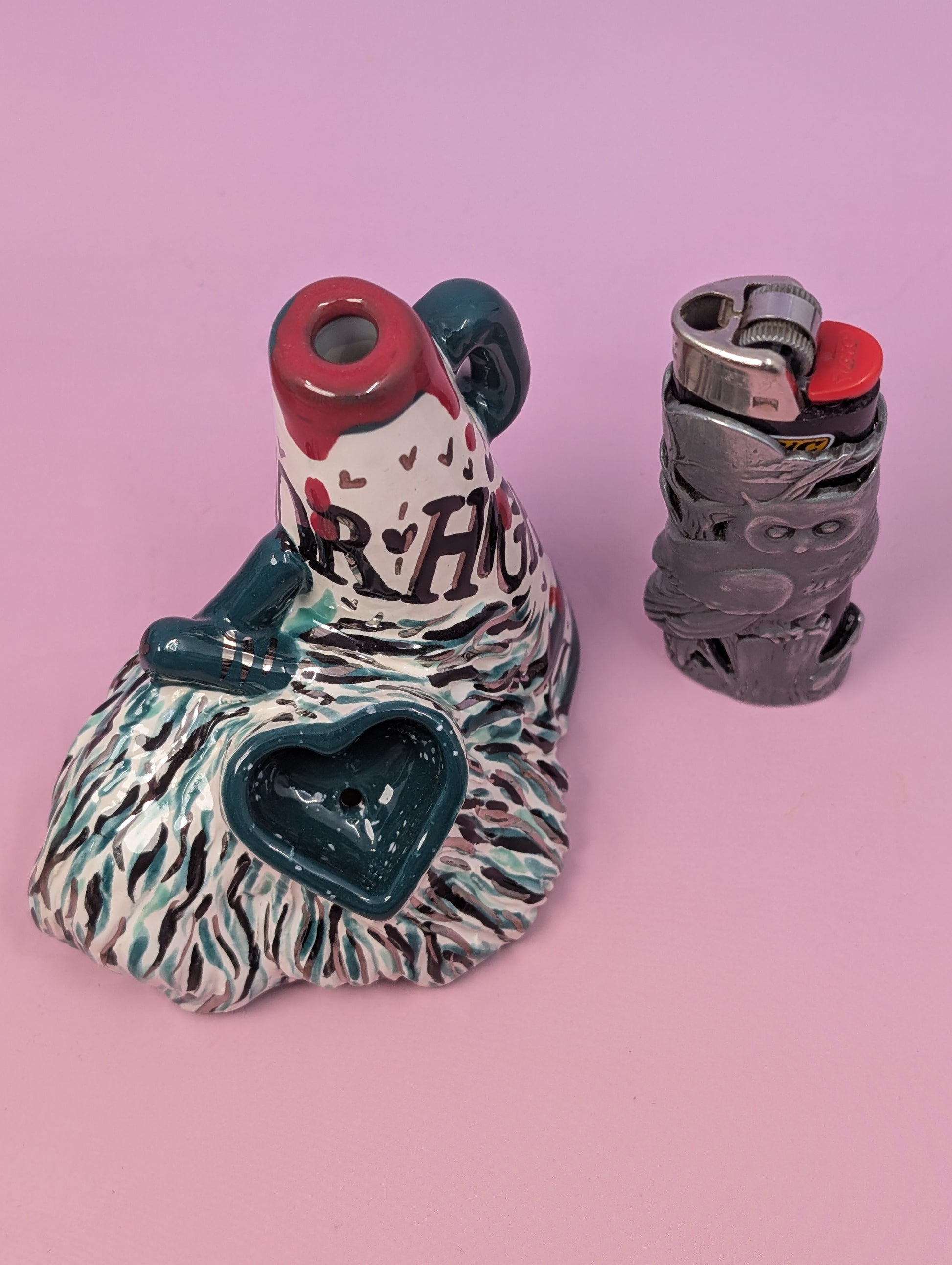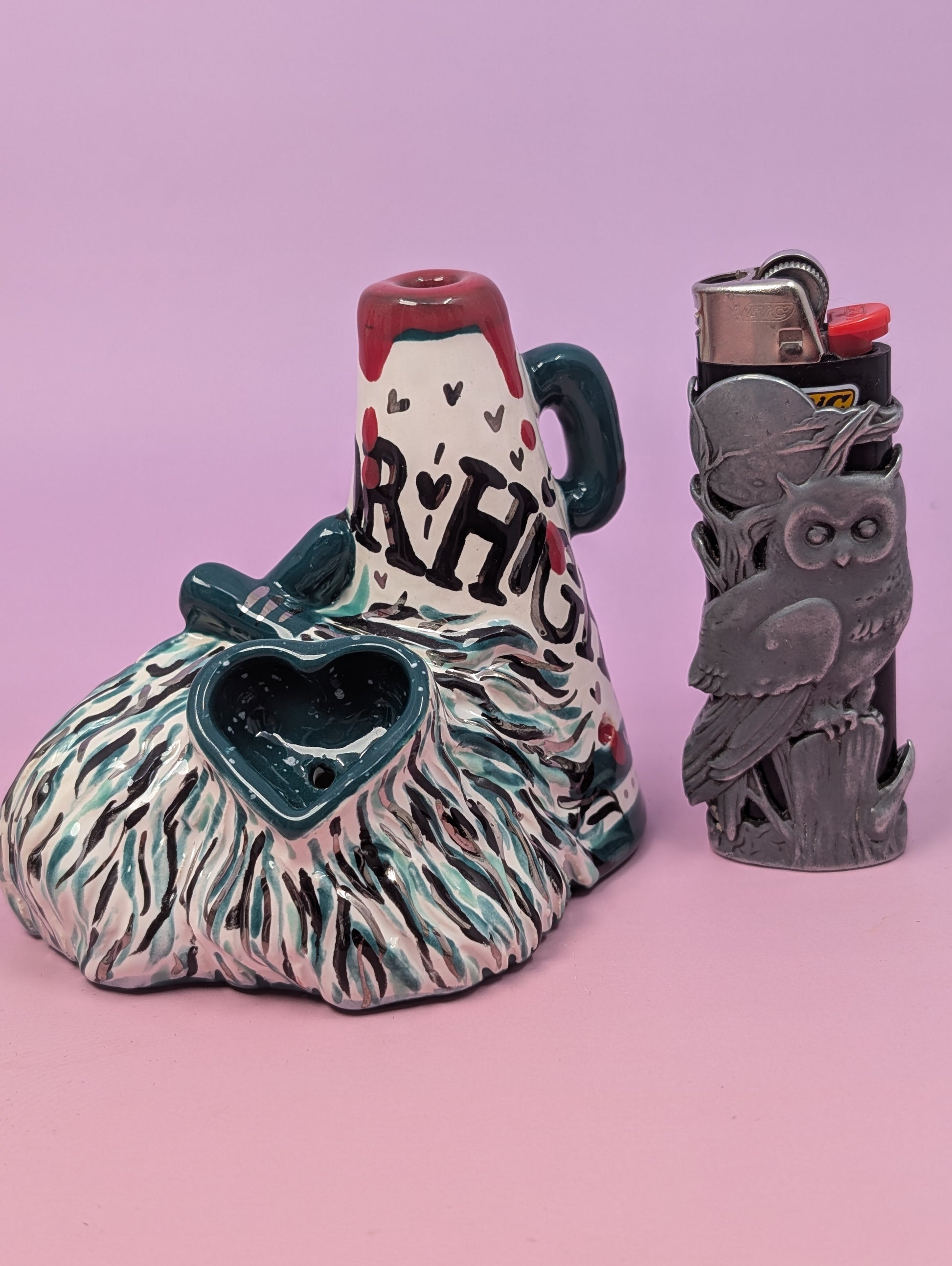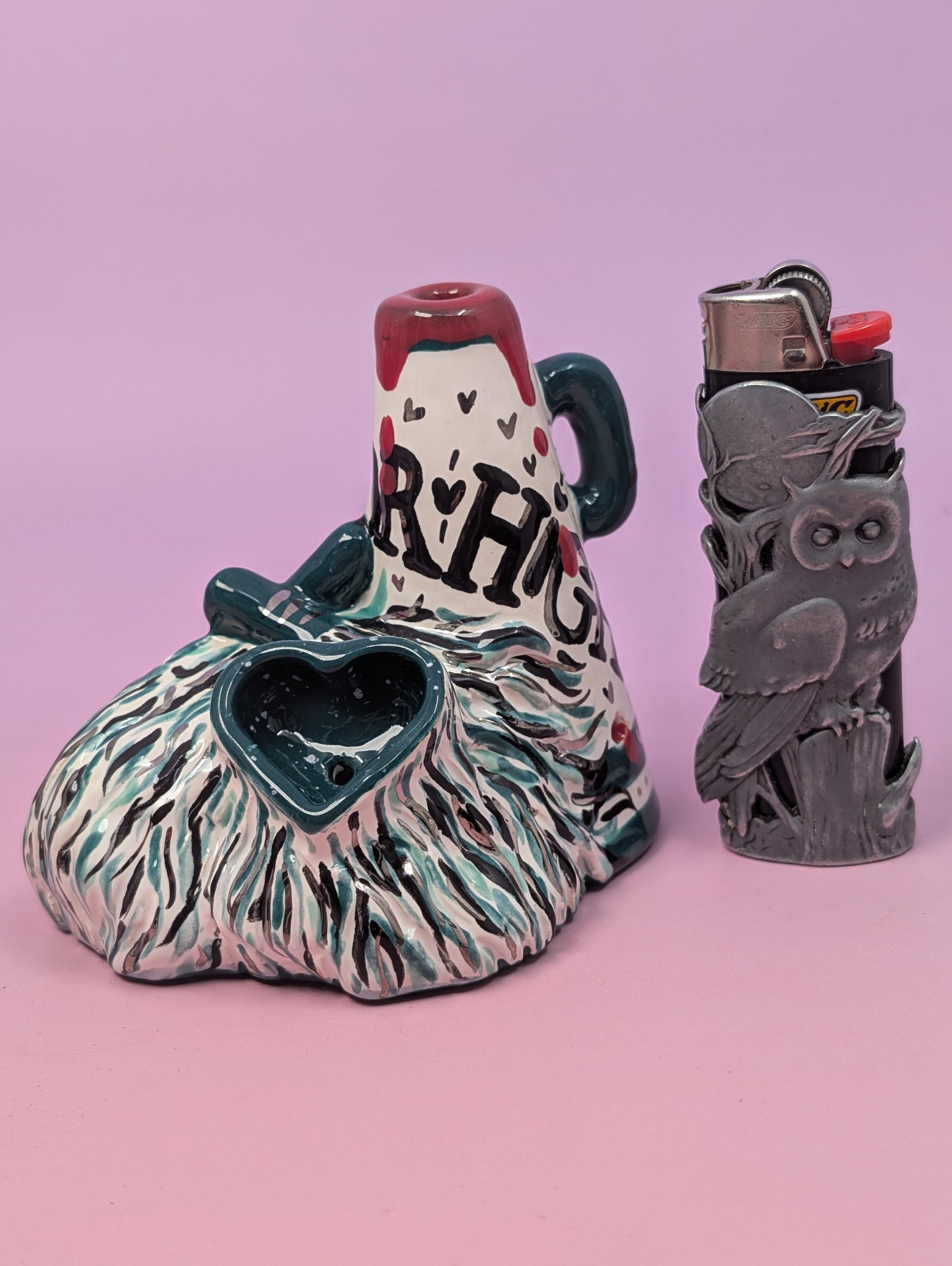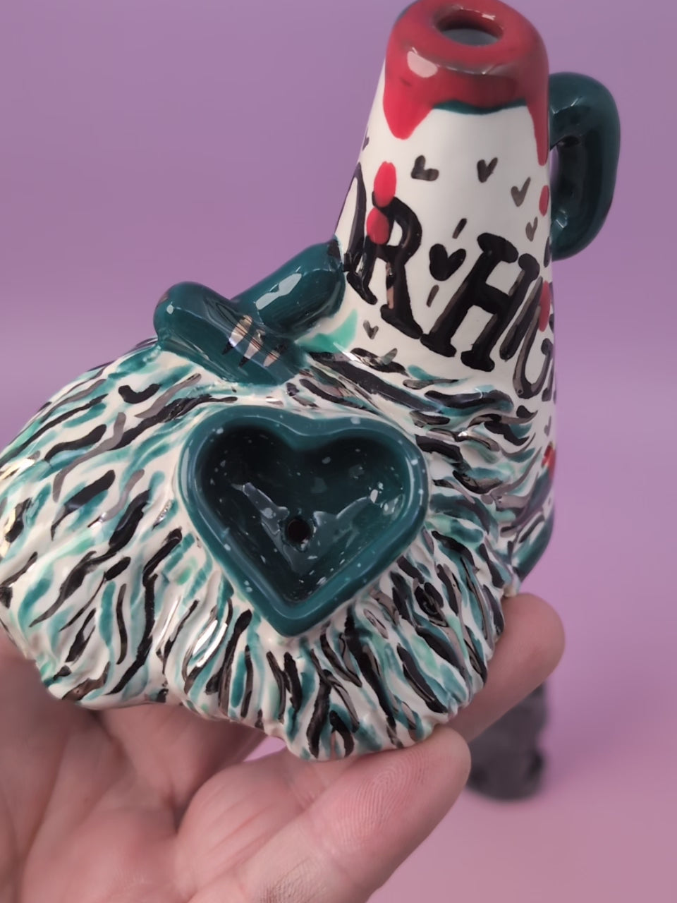 Welcome to Horror High, where the cheer squad tokes between exorcisms. Each pipe is handmade, glazed in bright teals with whisps of platinum gold, and is finished with the perfect balance of gore and bad-girl charm. Think pom-poms, pep rallies, and a little touch of hellfire