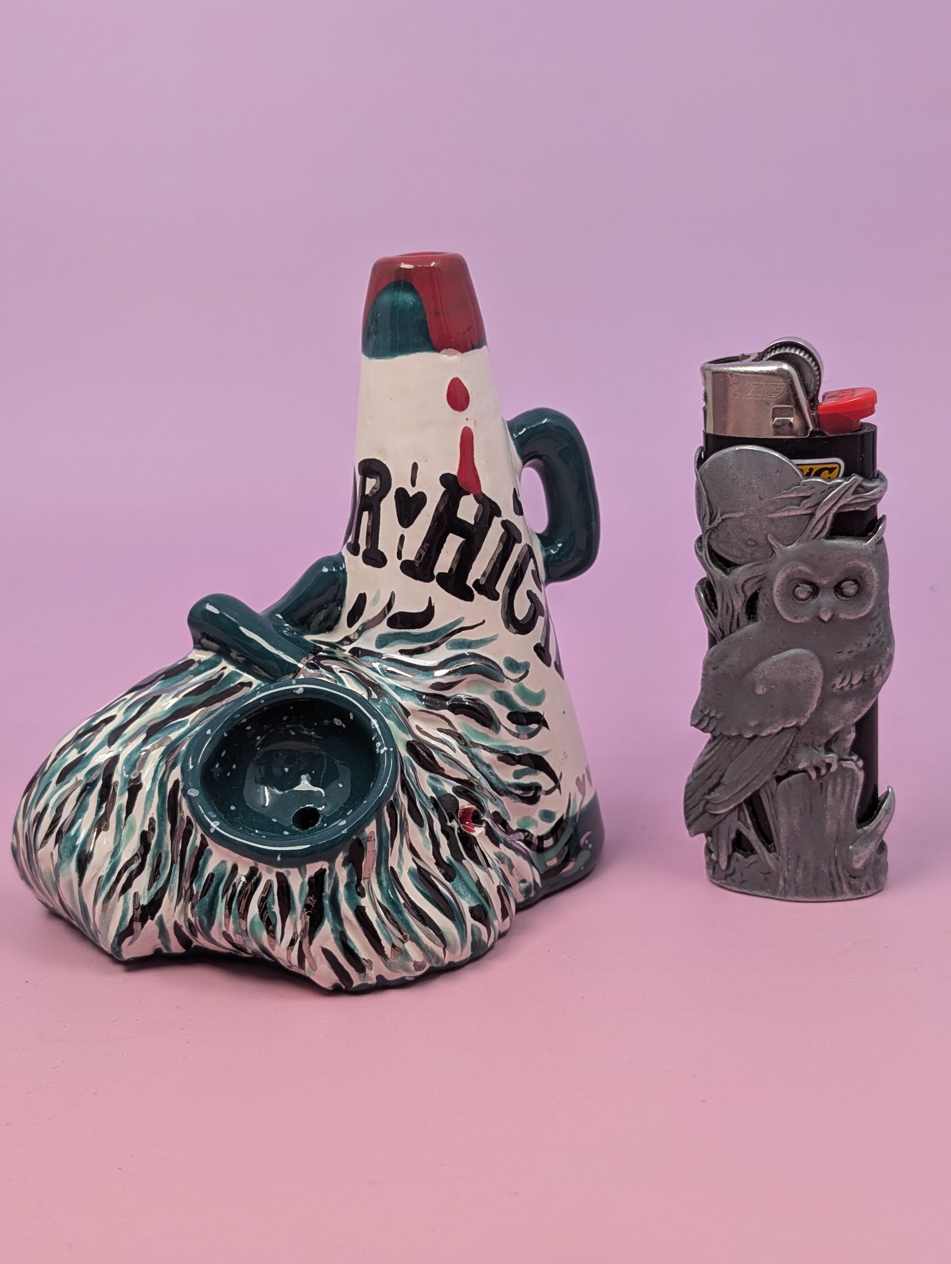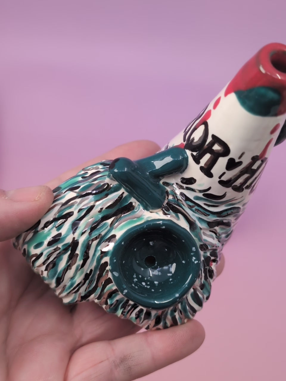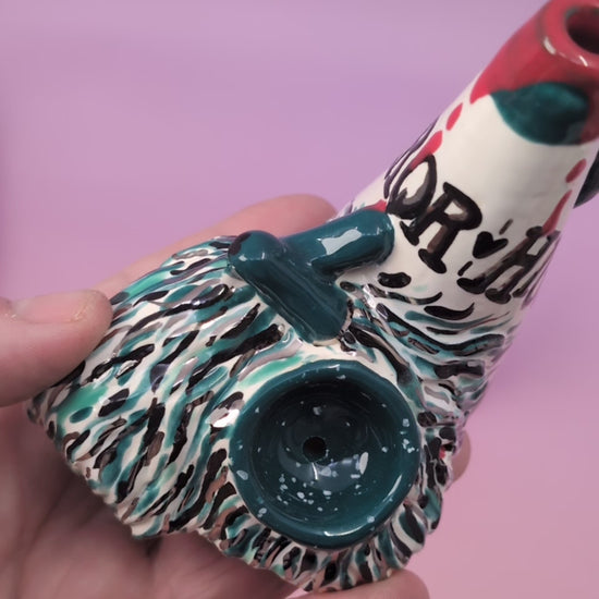 Welcome to Horror High, where the cheer squad tokes between exorcisms. Each pipe is handmade, glazed in bright teals with whisps of platinum gold, and is finished with the perfect balance of gore and bad-girl charm. Think pom-poms, pep rallies, and a little touch of hellfire