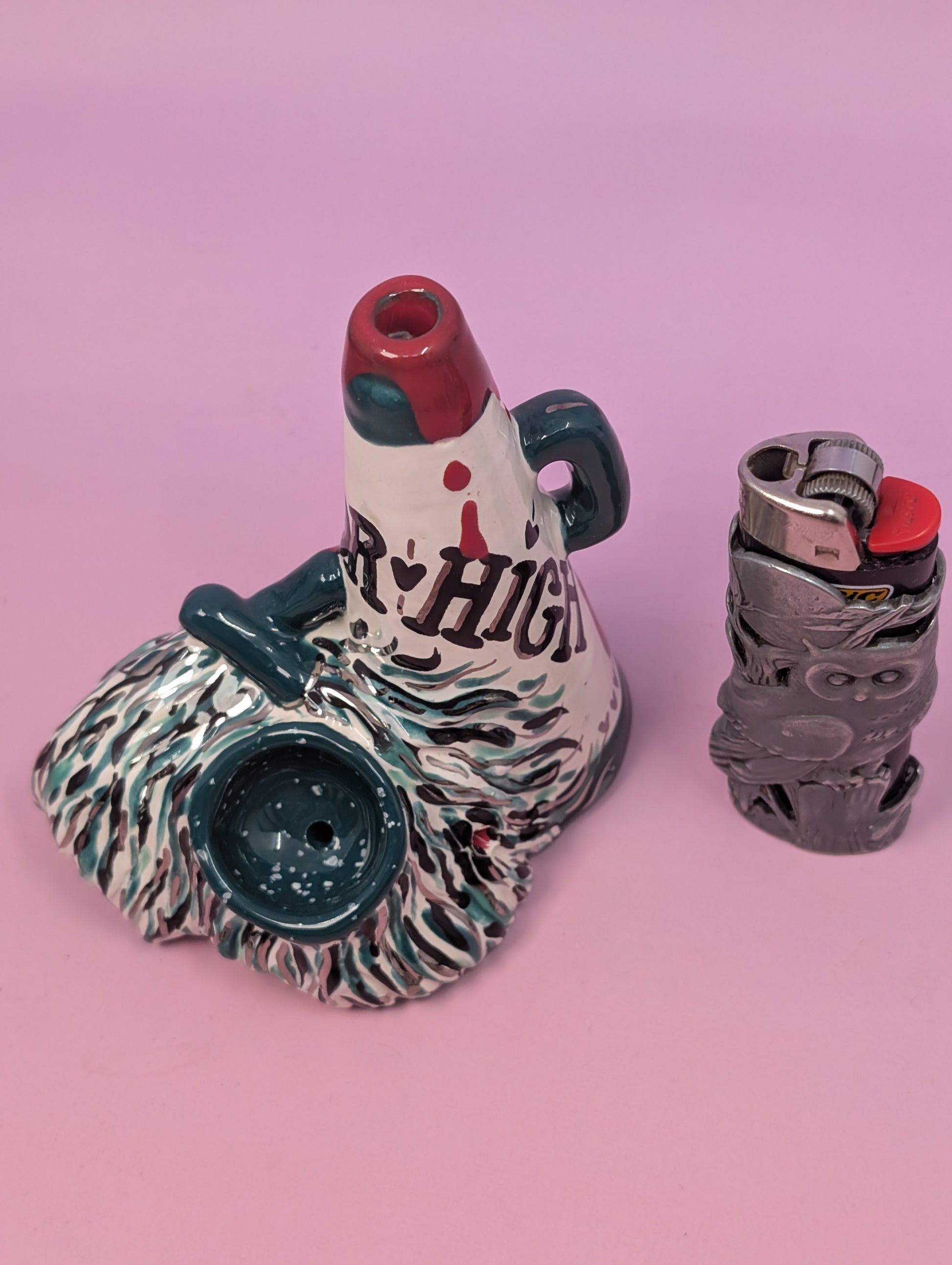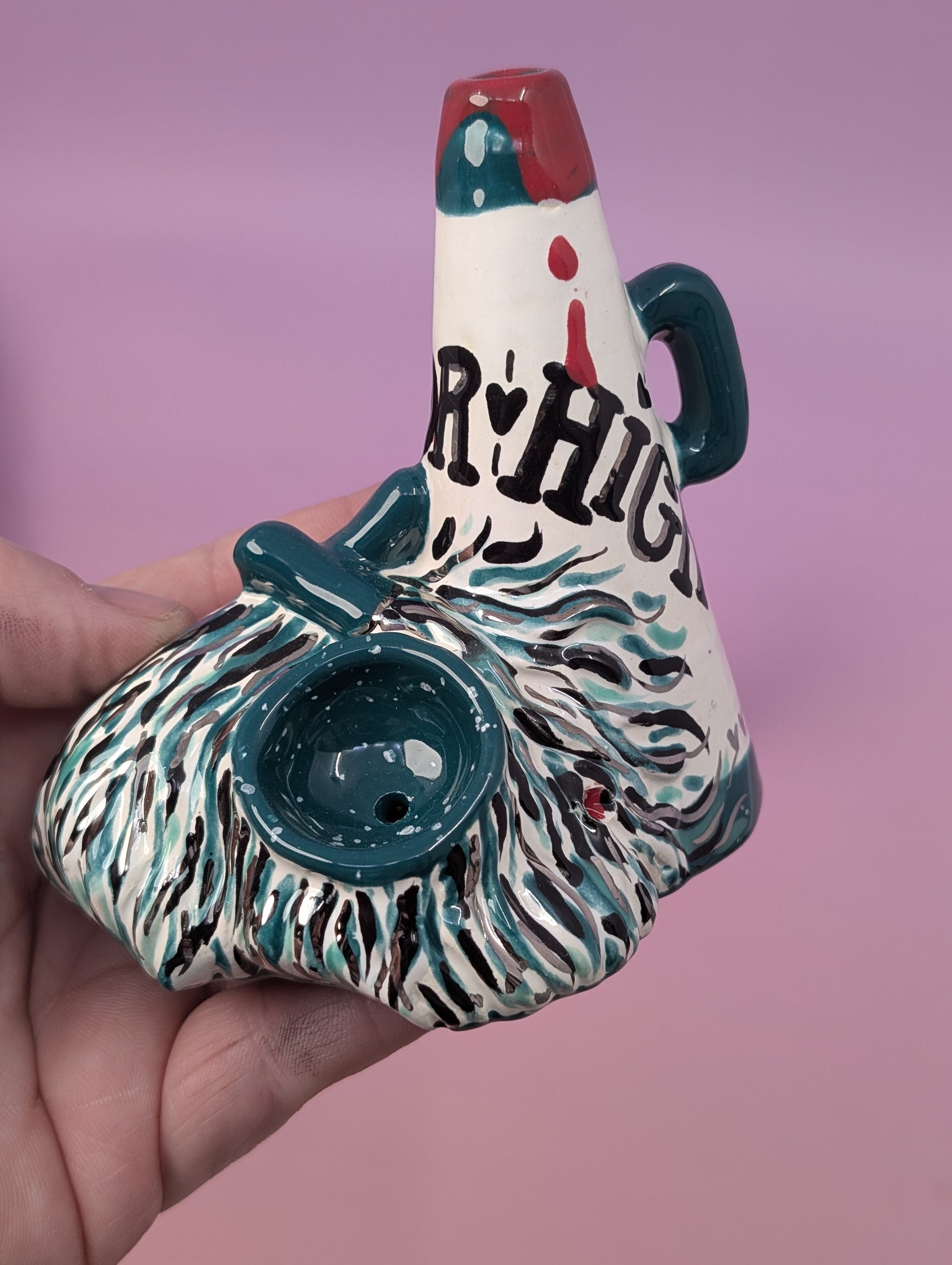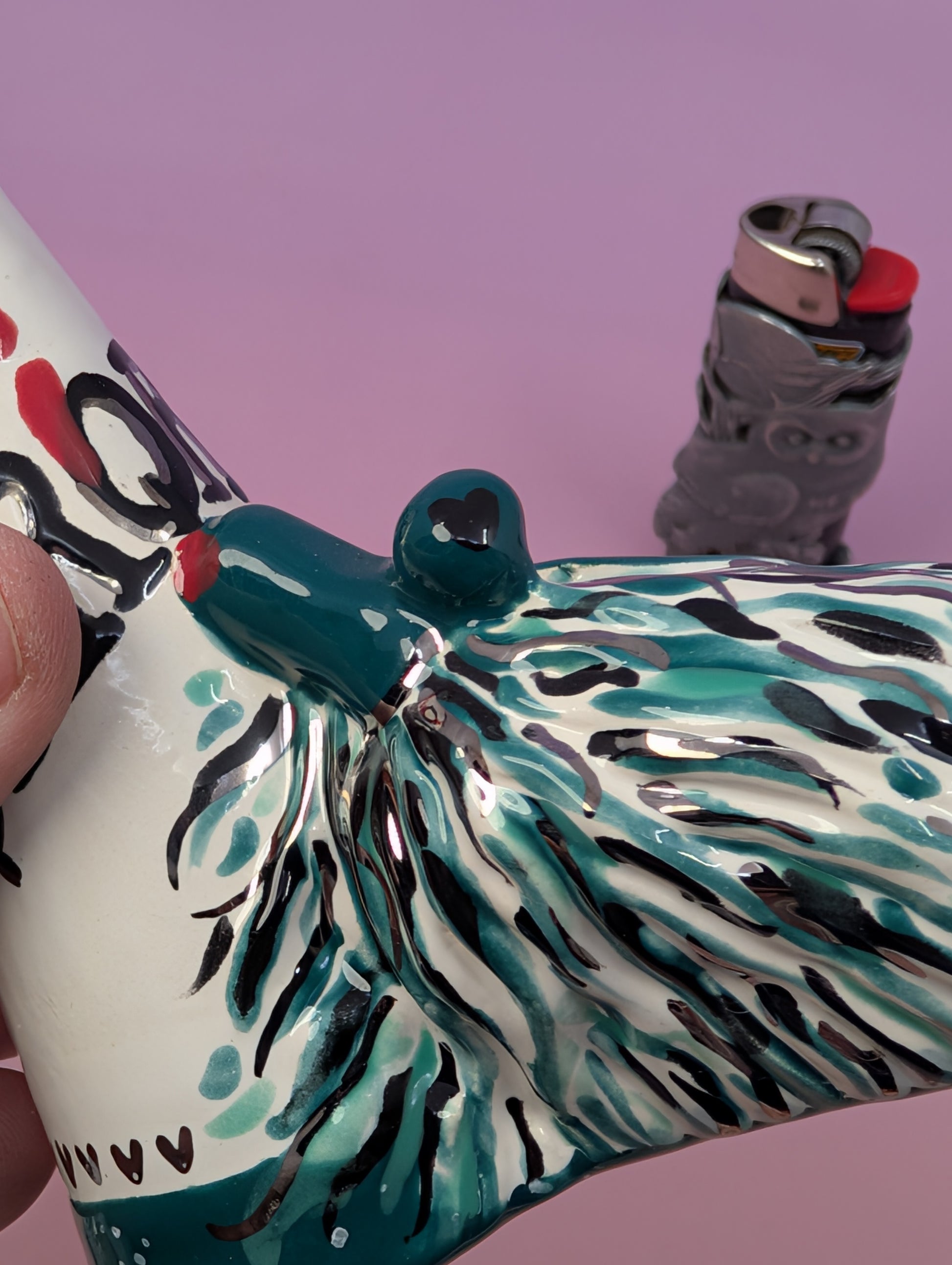 Welcome to Horror High, where the cheer squad tokes between exorcisms. Each pipe is handmade, glazed in bright teals with whisps of platinum gold, and is finished with the perfect balance of gore and bad-girl charm. Think pom-poms, pep rallies, and a little touch of hellfire