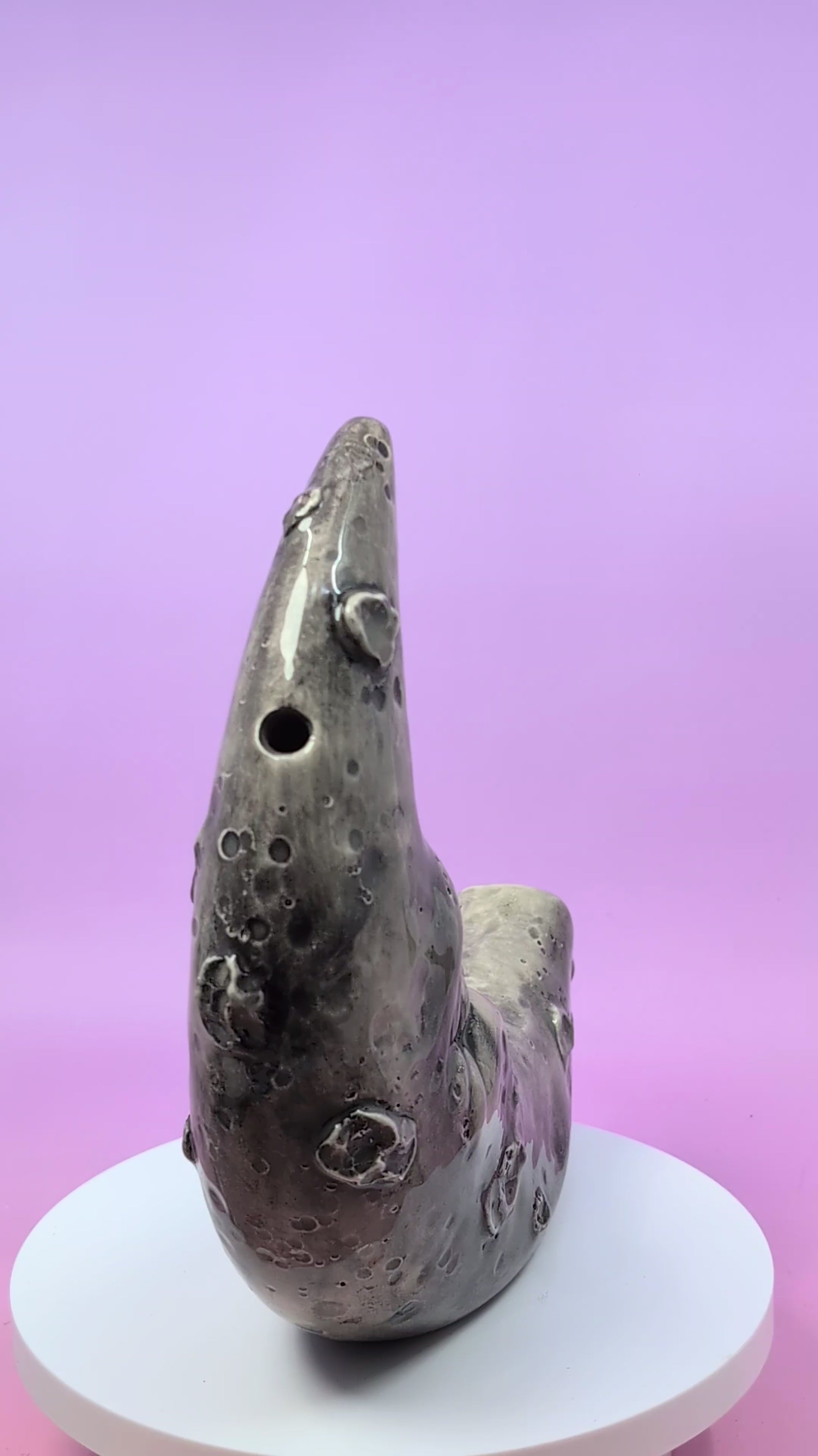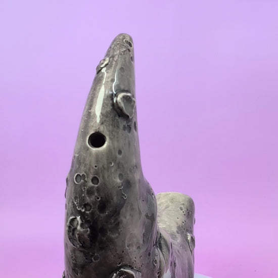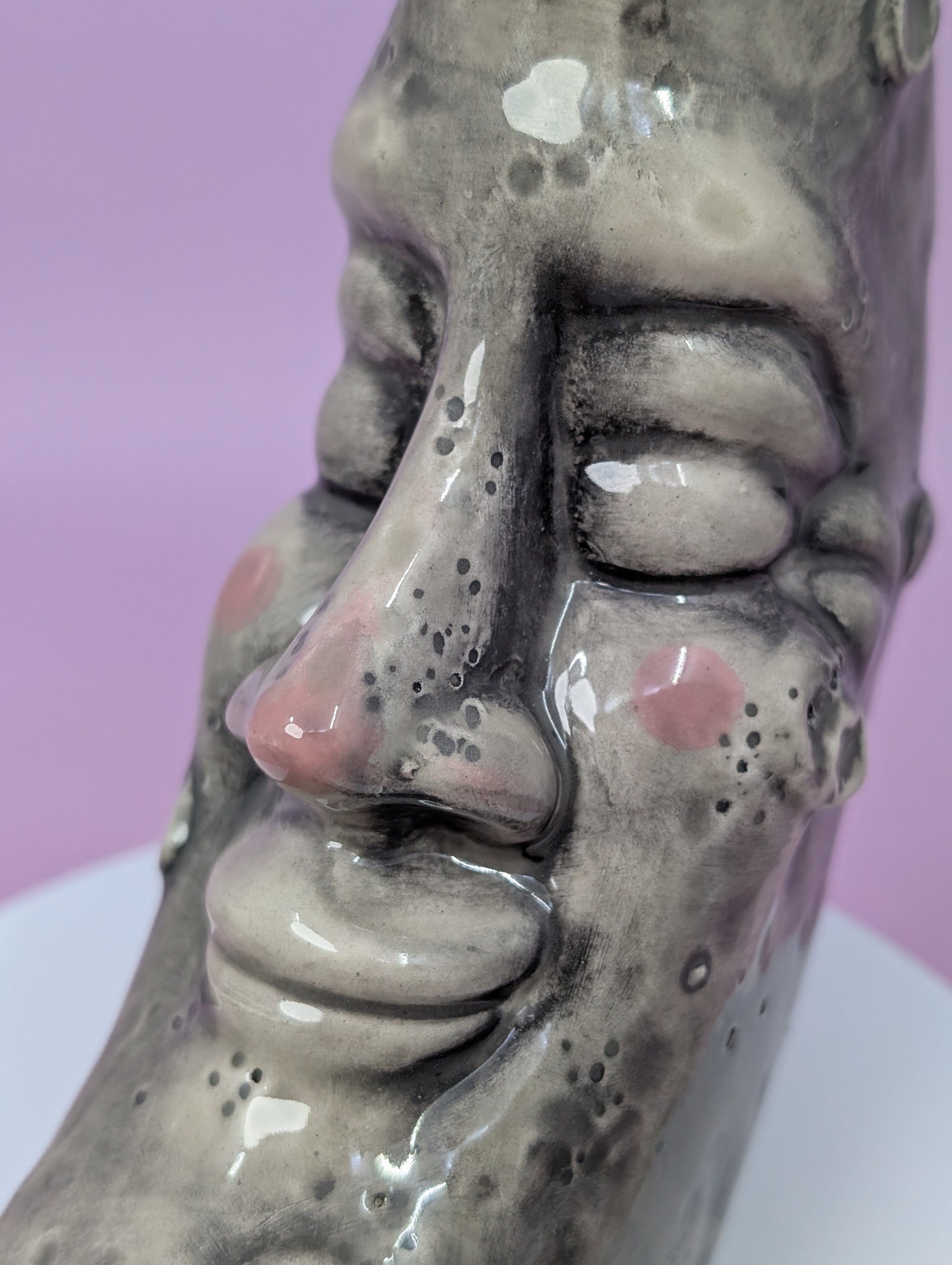 This cutsie crescent moon pipe is adorable in himz storm gray glaze and his blush pink nose and cheeks. Himz is perfect for your next sesh. He comes with a laser cut acrylic stand.